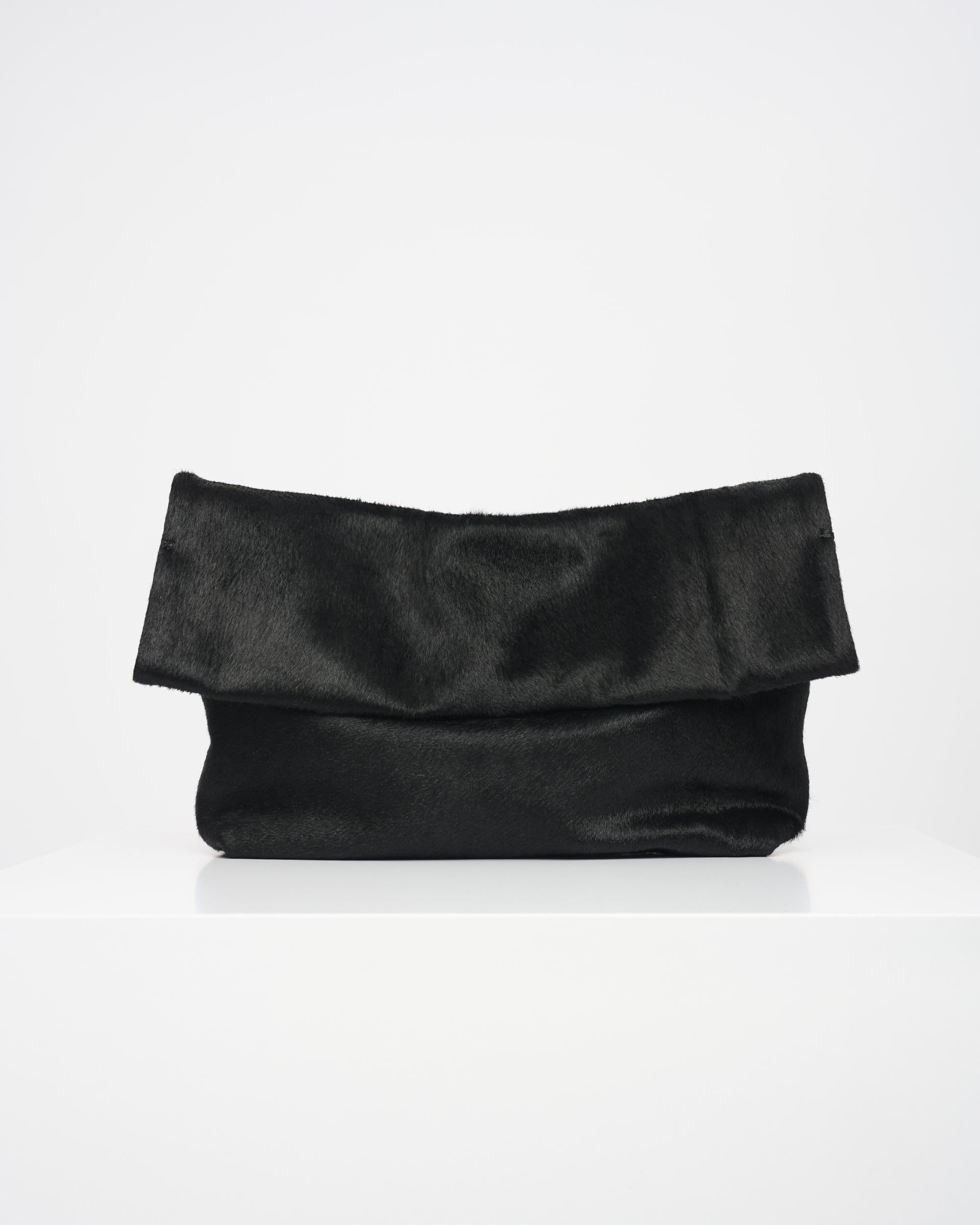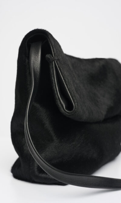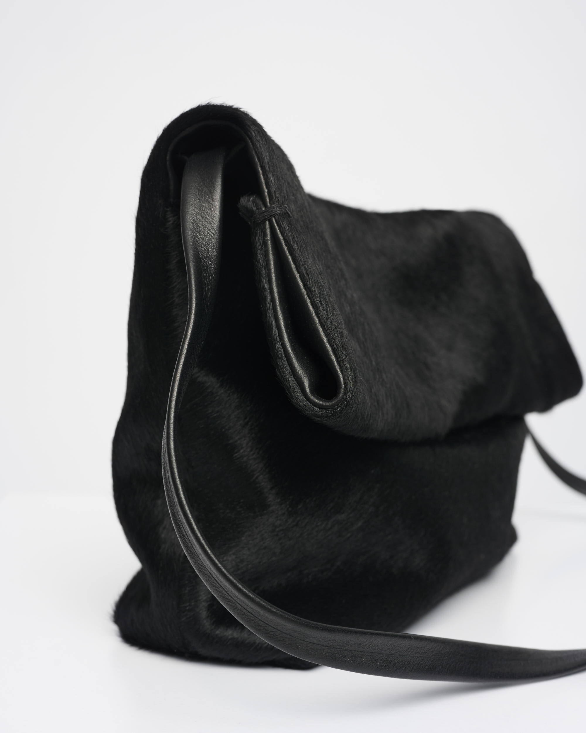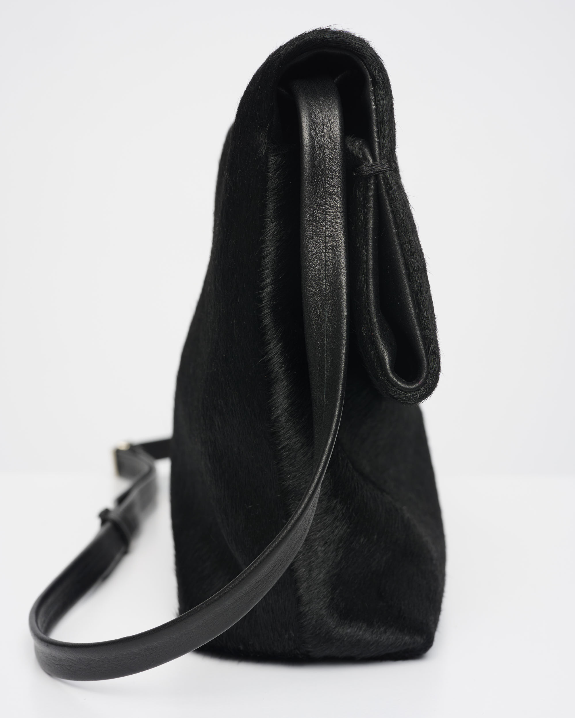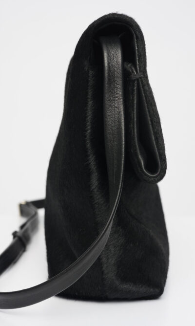תיק מעטפה מעור שיער פוני, עם בטנת כותנה, סגירה עם לחצנית נסתרת. ורצועת כתף מתכווננת.