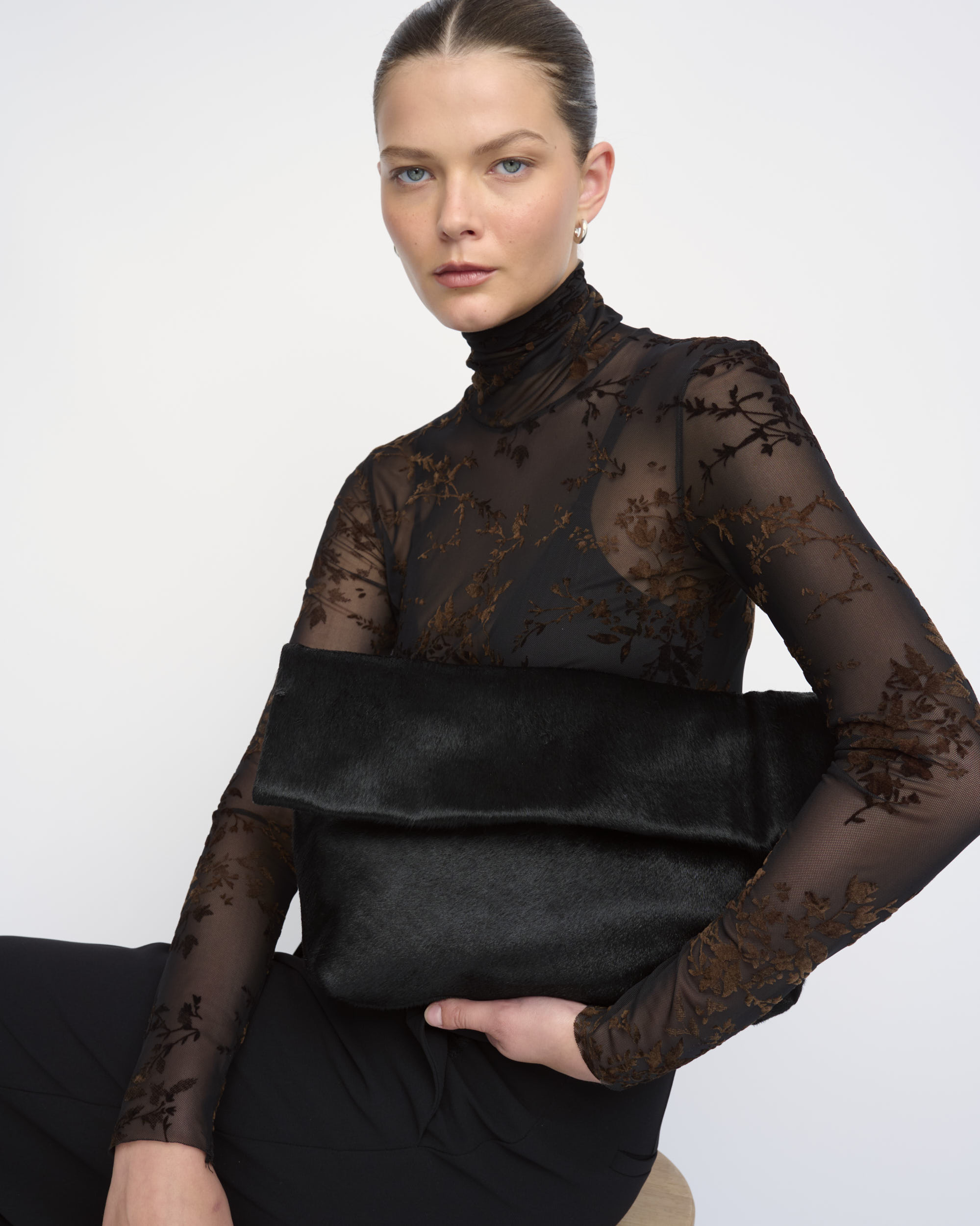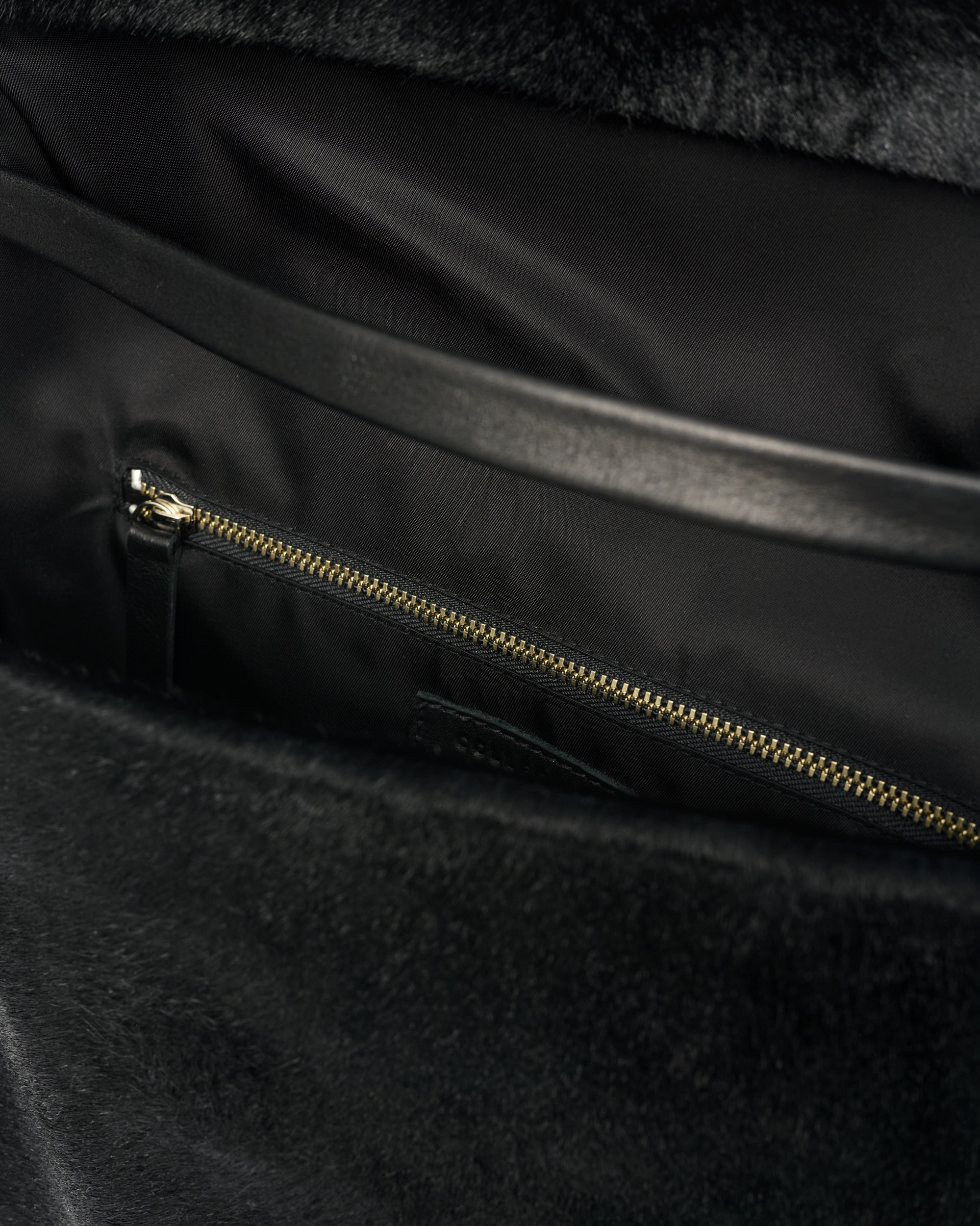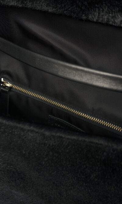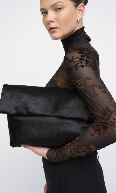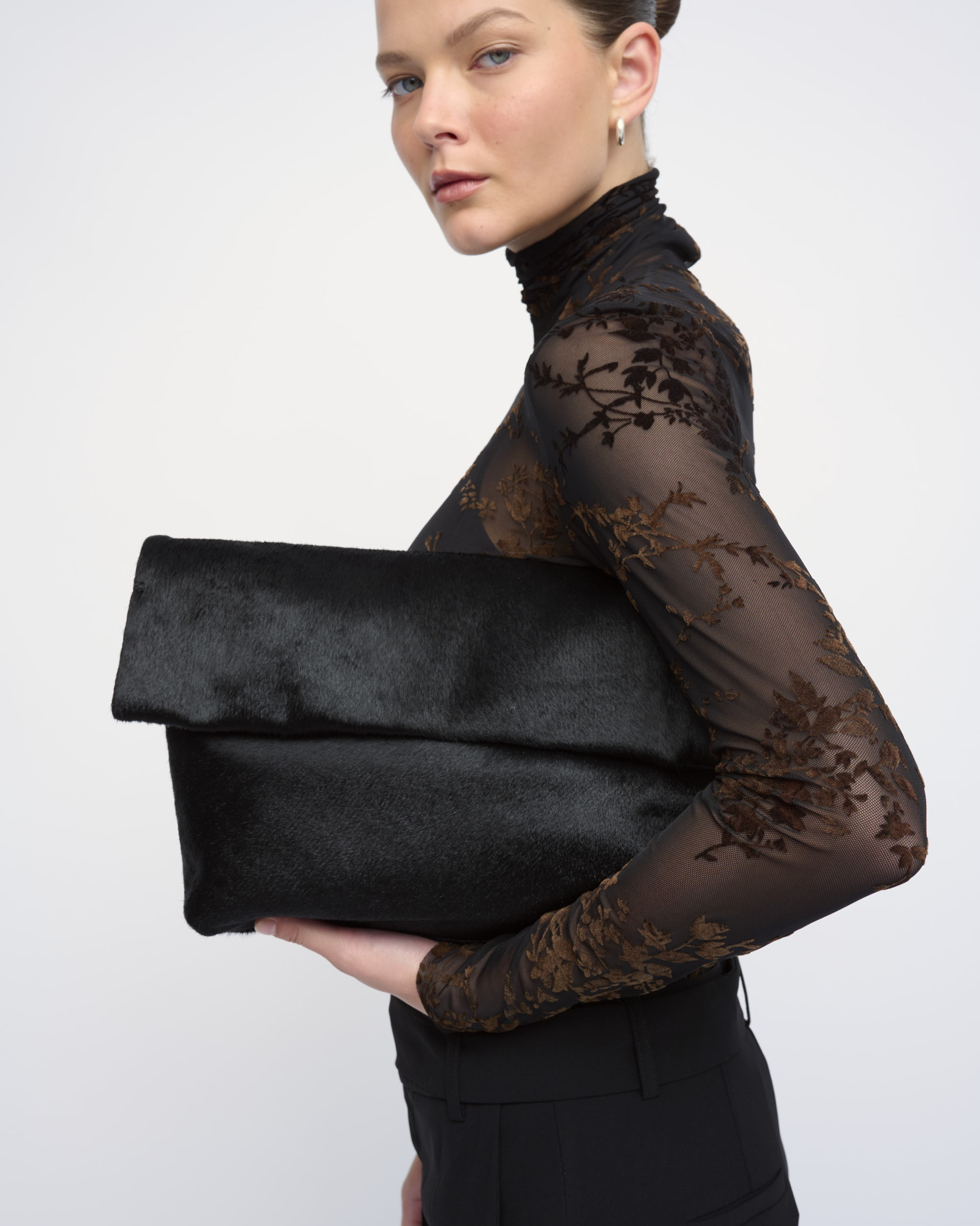 תיק מעטפה מעור שיער פוני, עם בטנת כותנה, סגירה עם לחצנית נסתרת. ורצועת כתף מתכווננת.