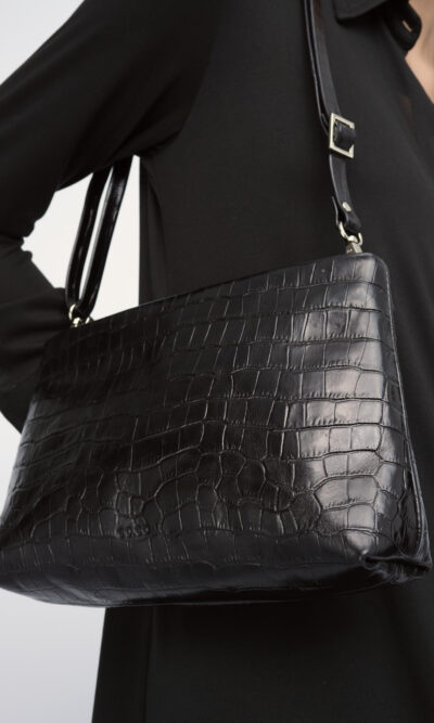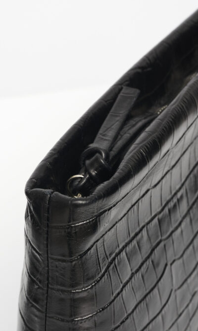 תיק צד מעור מוטבע באפקט קרוקו, עם בטנת כותנה, סגירת רוכסן ורצועת כתף מתכווננת.