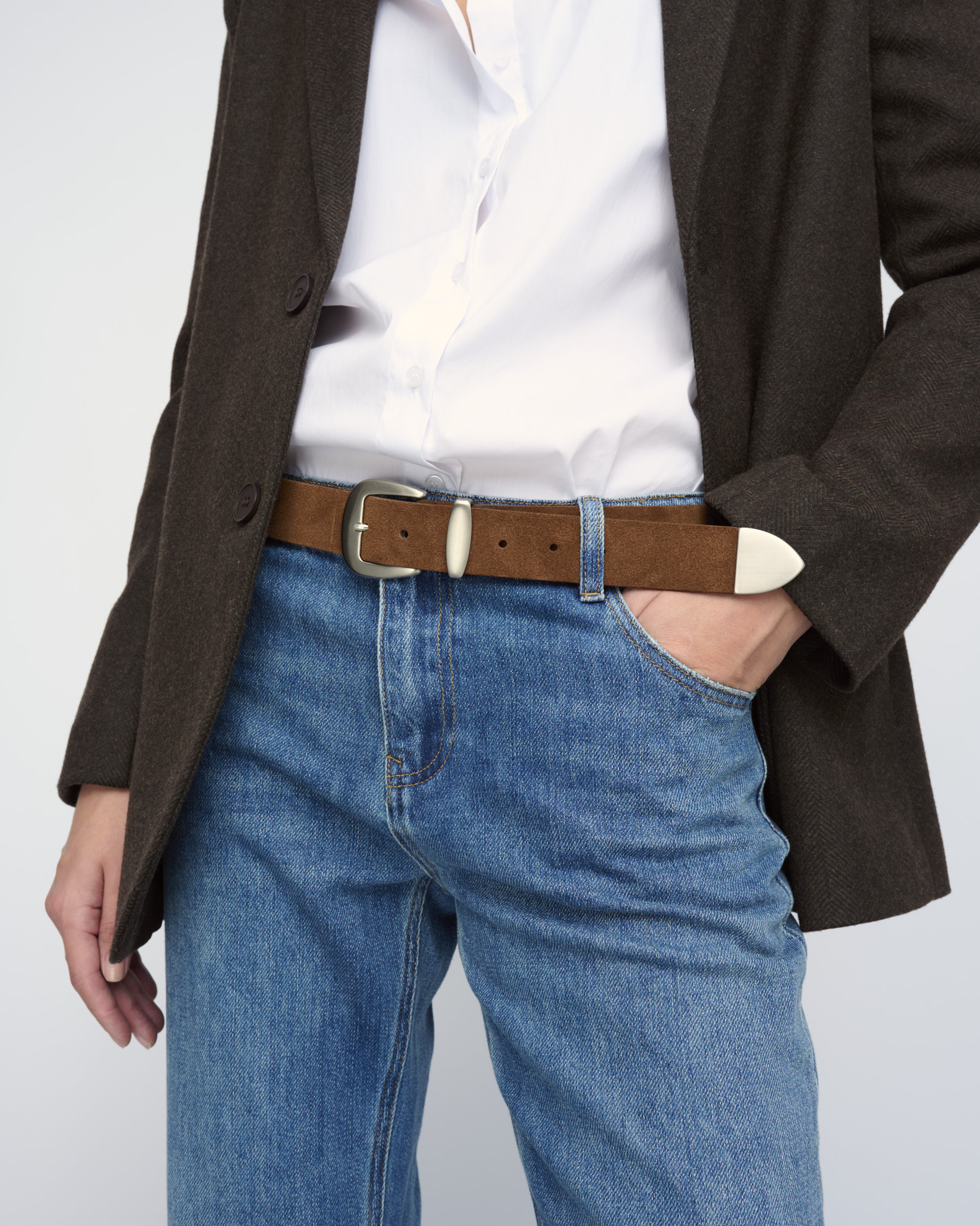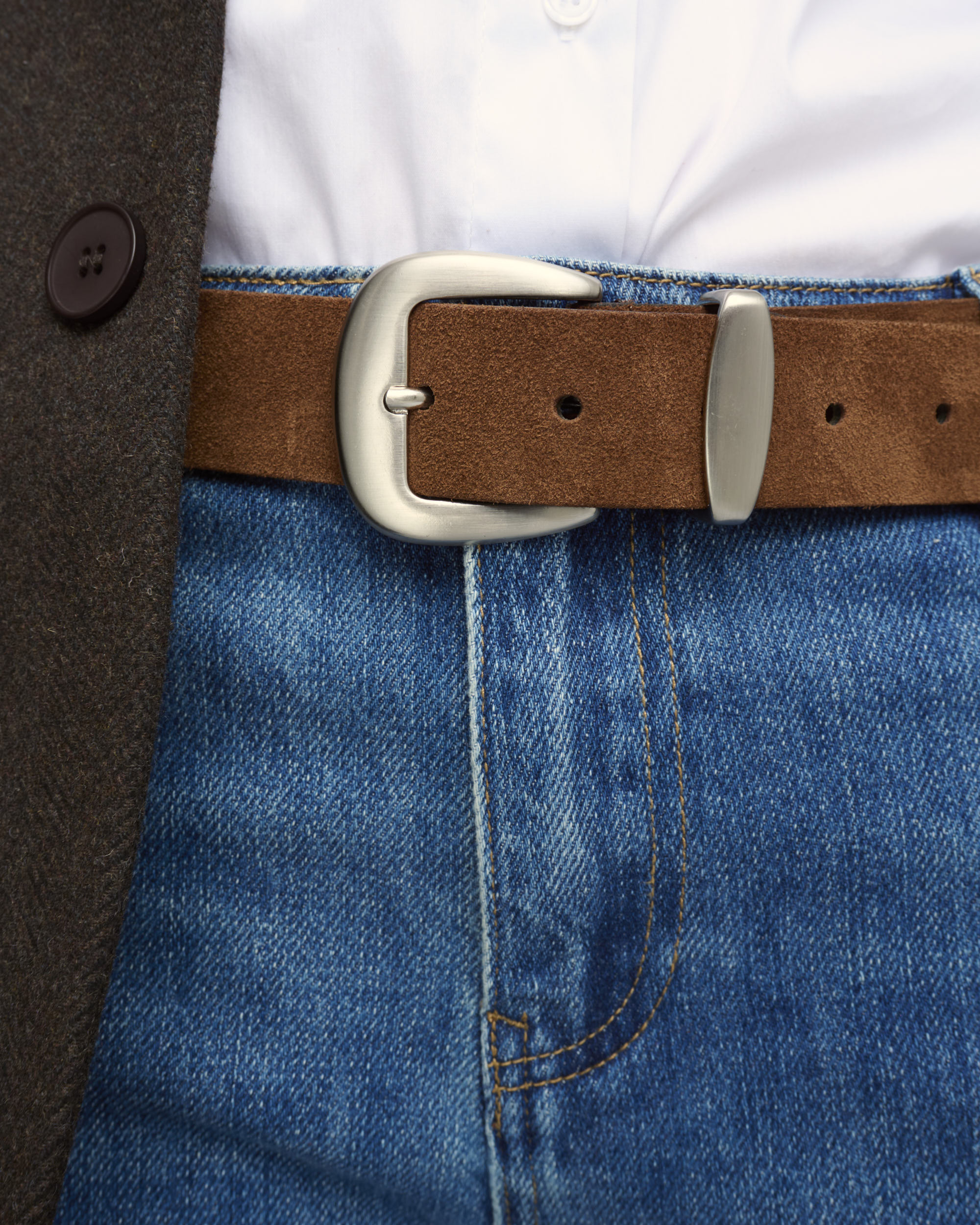 חגורת זמש, רוחב 3.5 ס”מ עם אבזם כסוף.