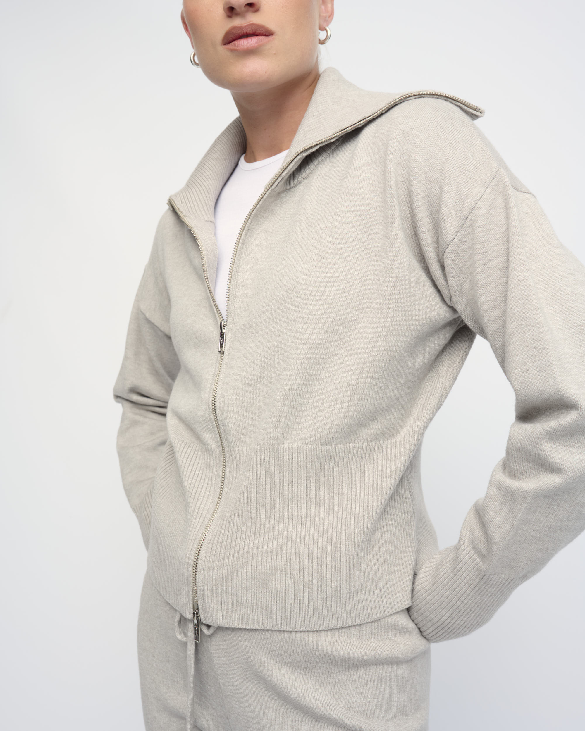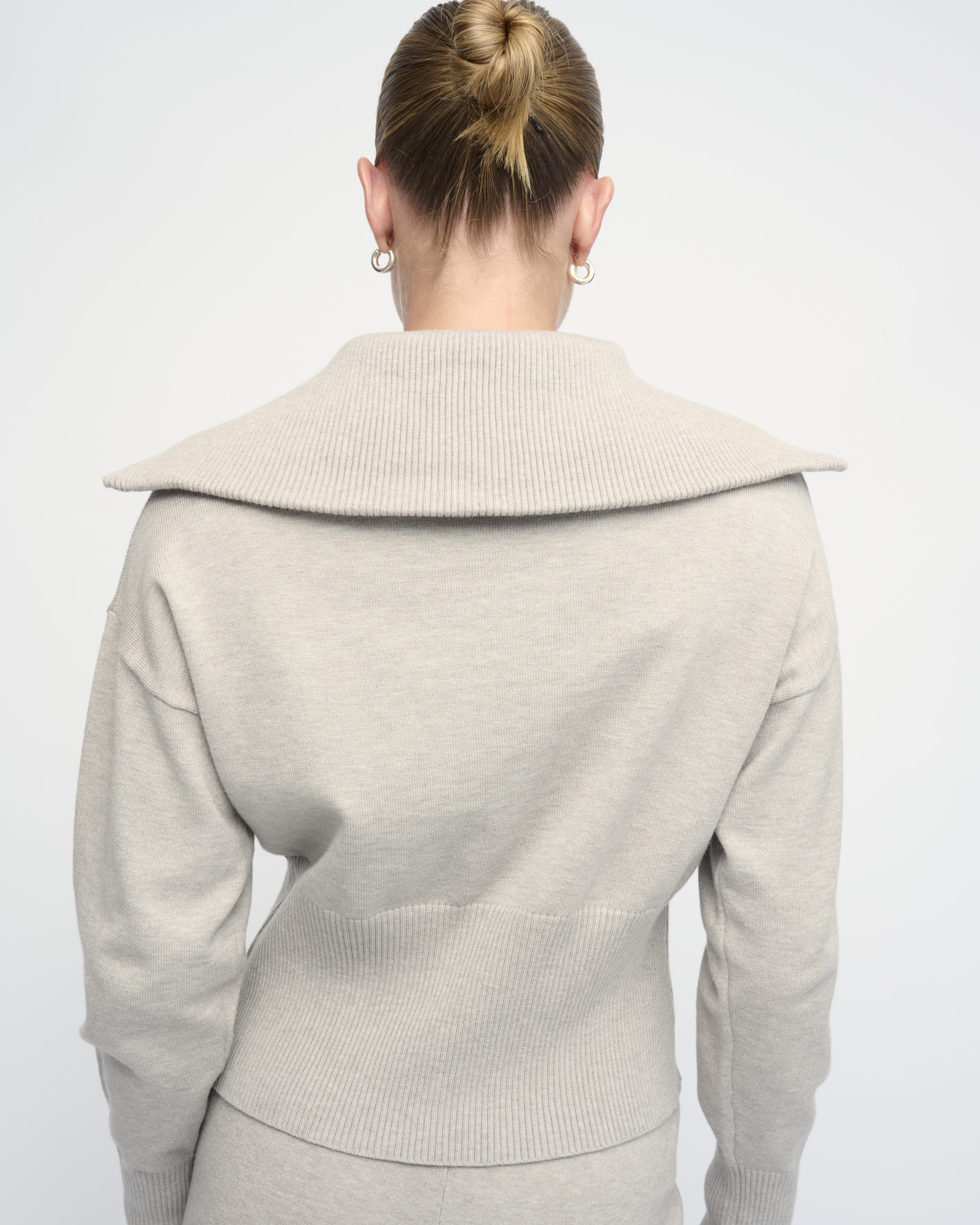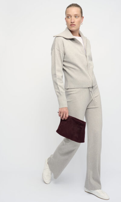 קרדיגן קצר מסריג ויסקוזה מעורב. צללית נינוחה, נאספת בקו המותן. עם צוארון גדול וסגירת רוכסן.