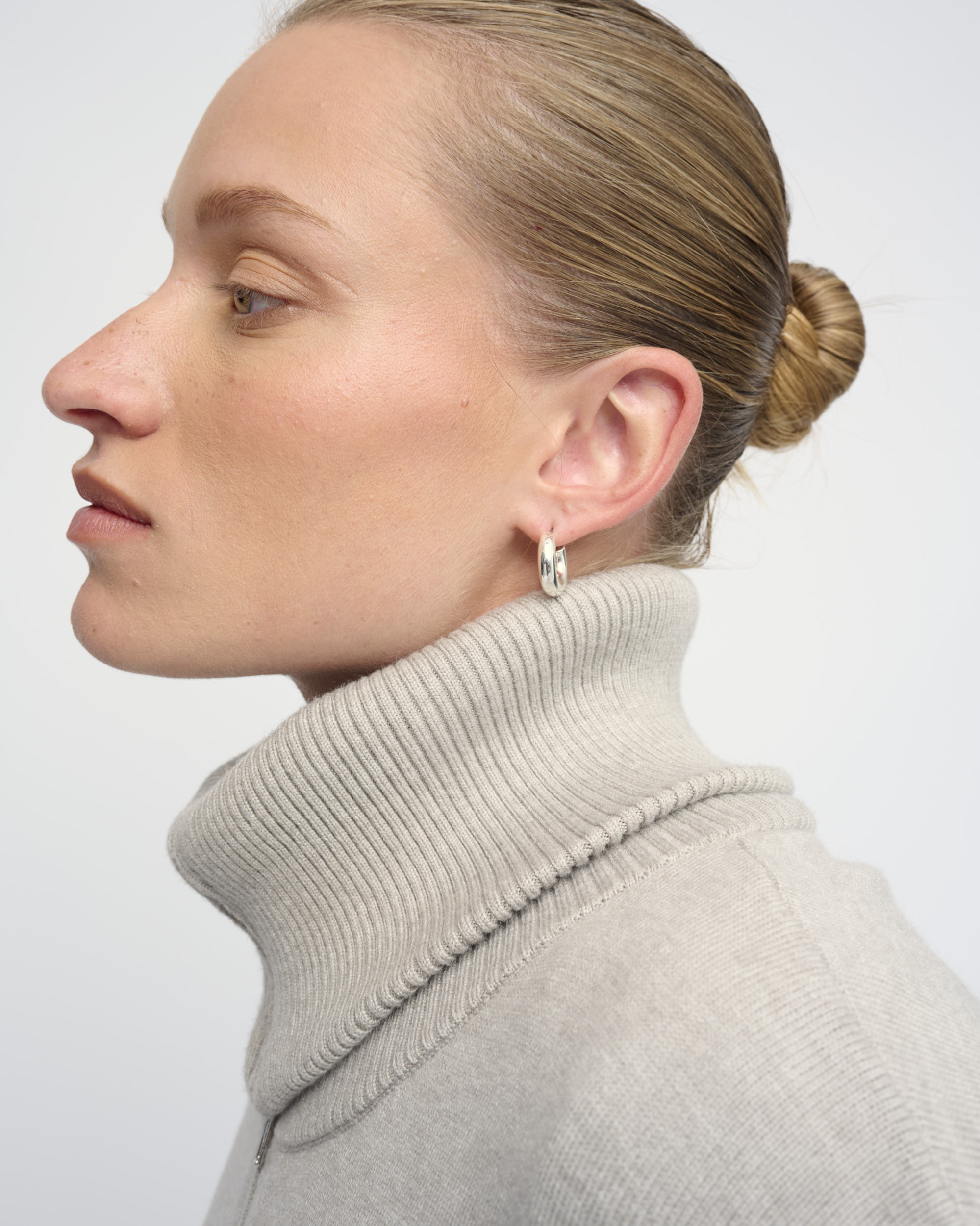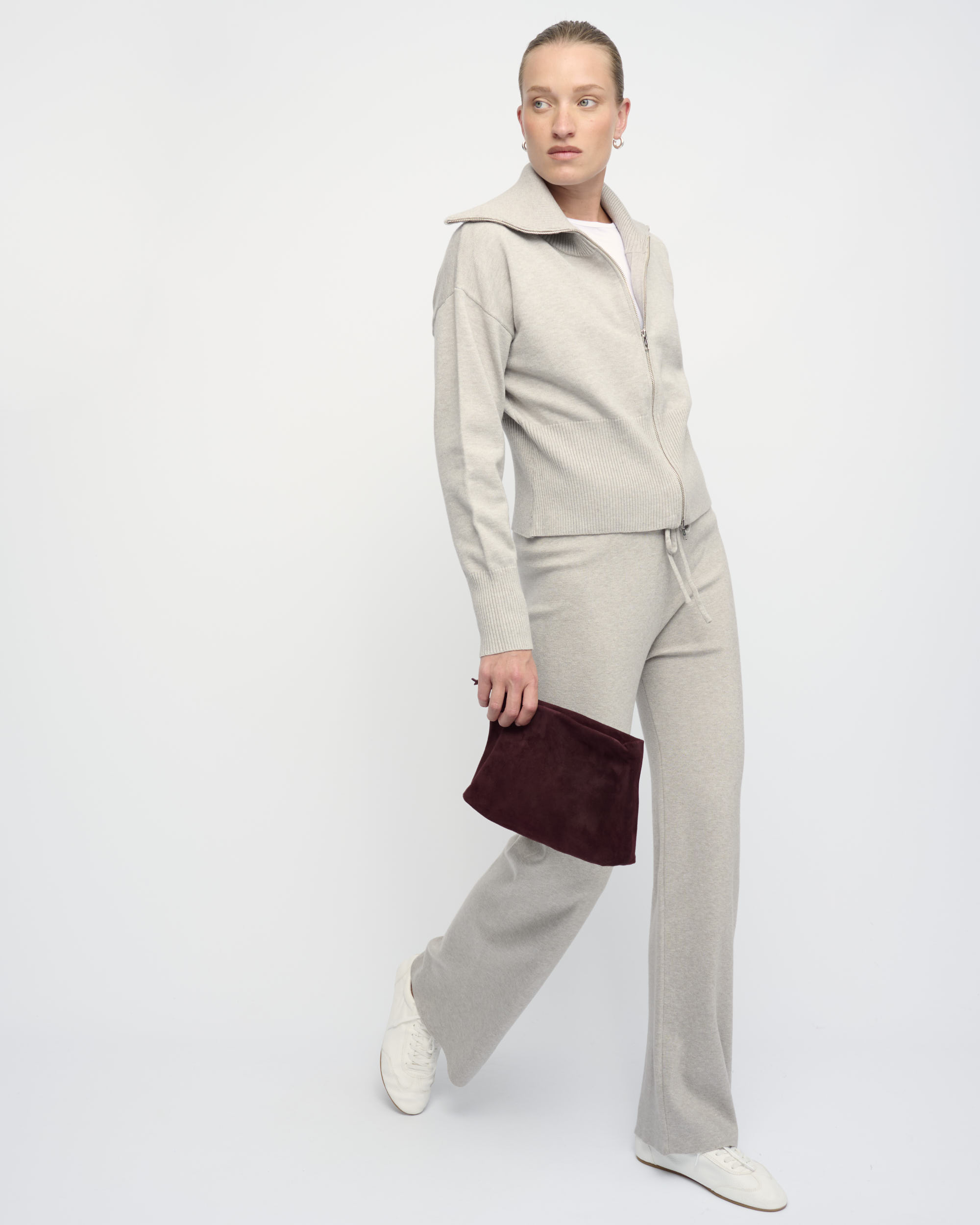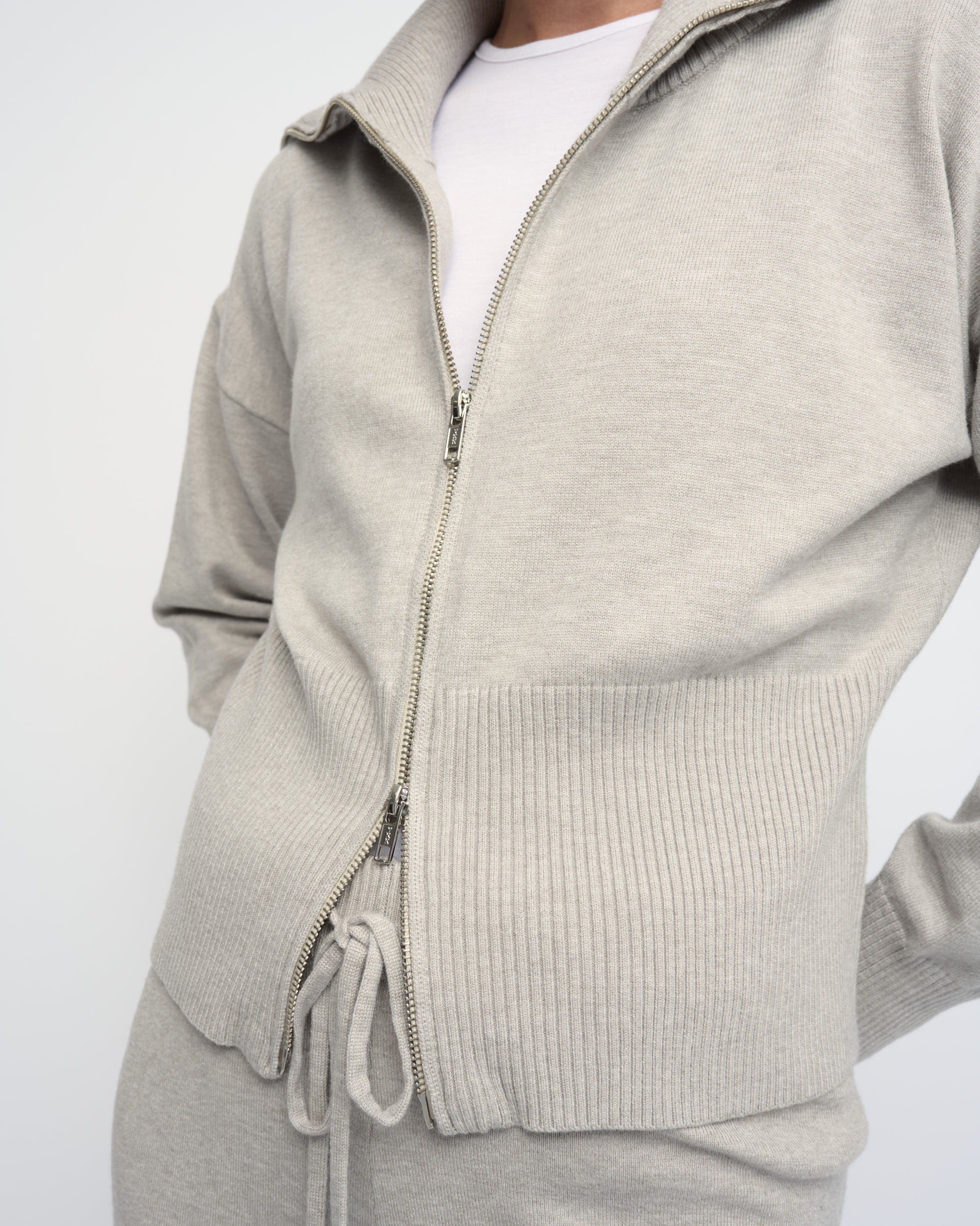 קרדיגן קצר מסריג ויסקוזה מעורב. צללית נינוחה, נאספת בקו המותן. עם צוארון גדול וסגירת רוכסן.