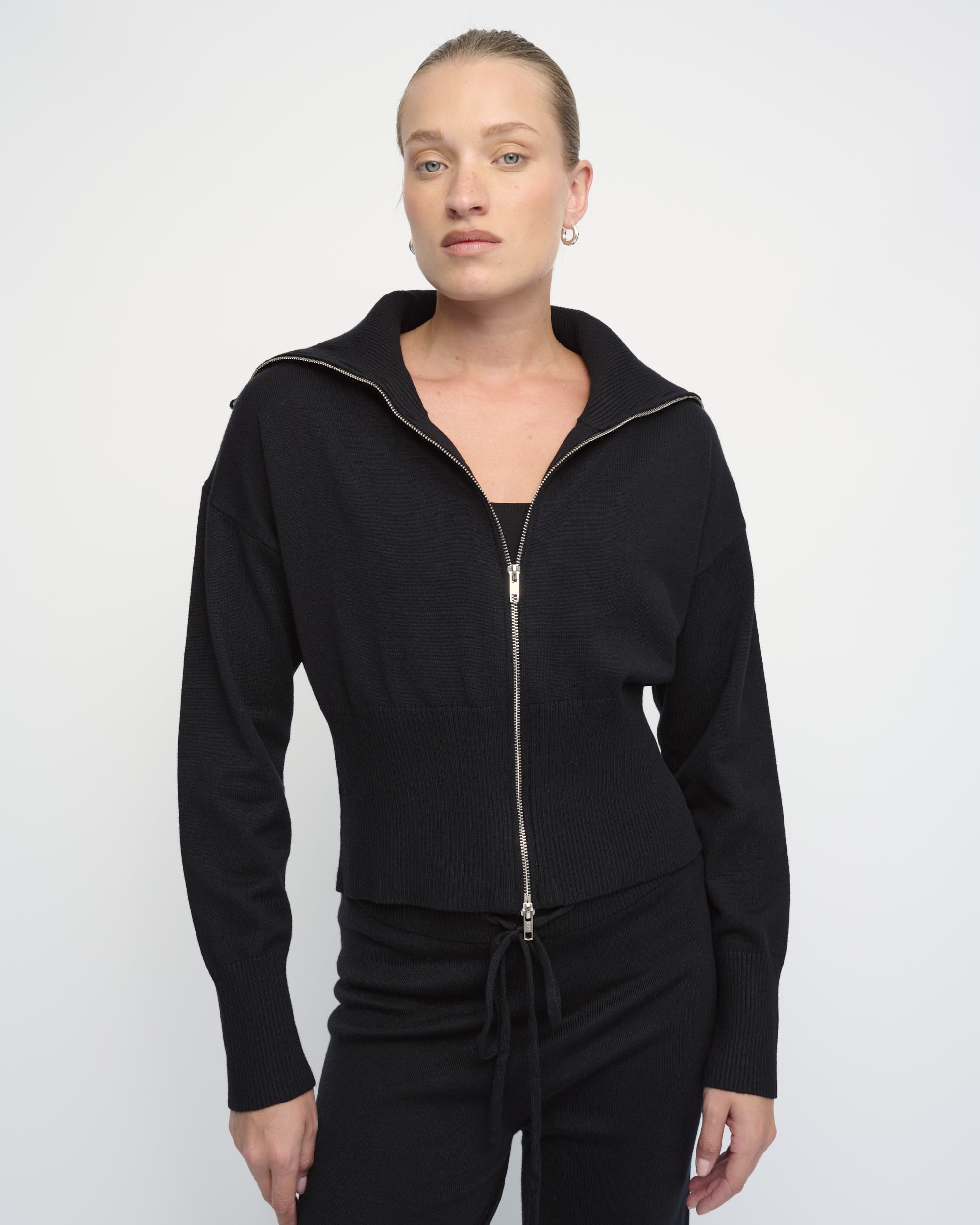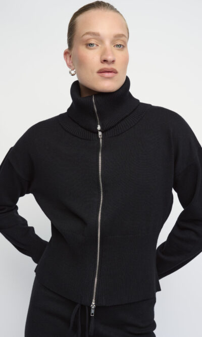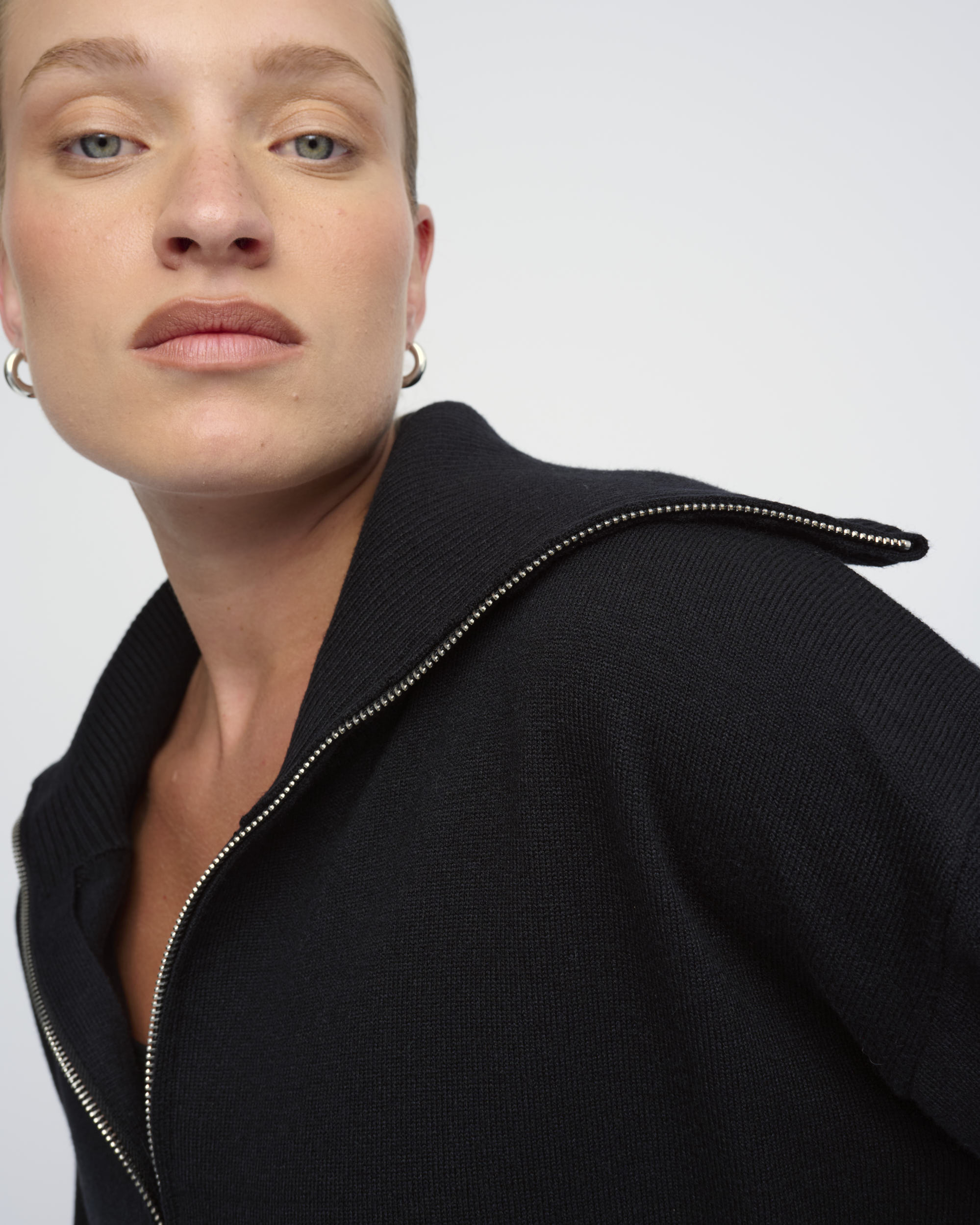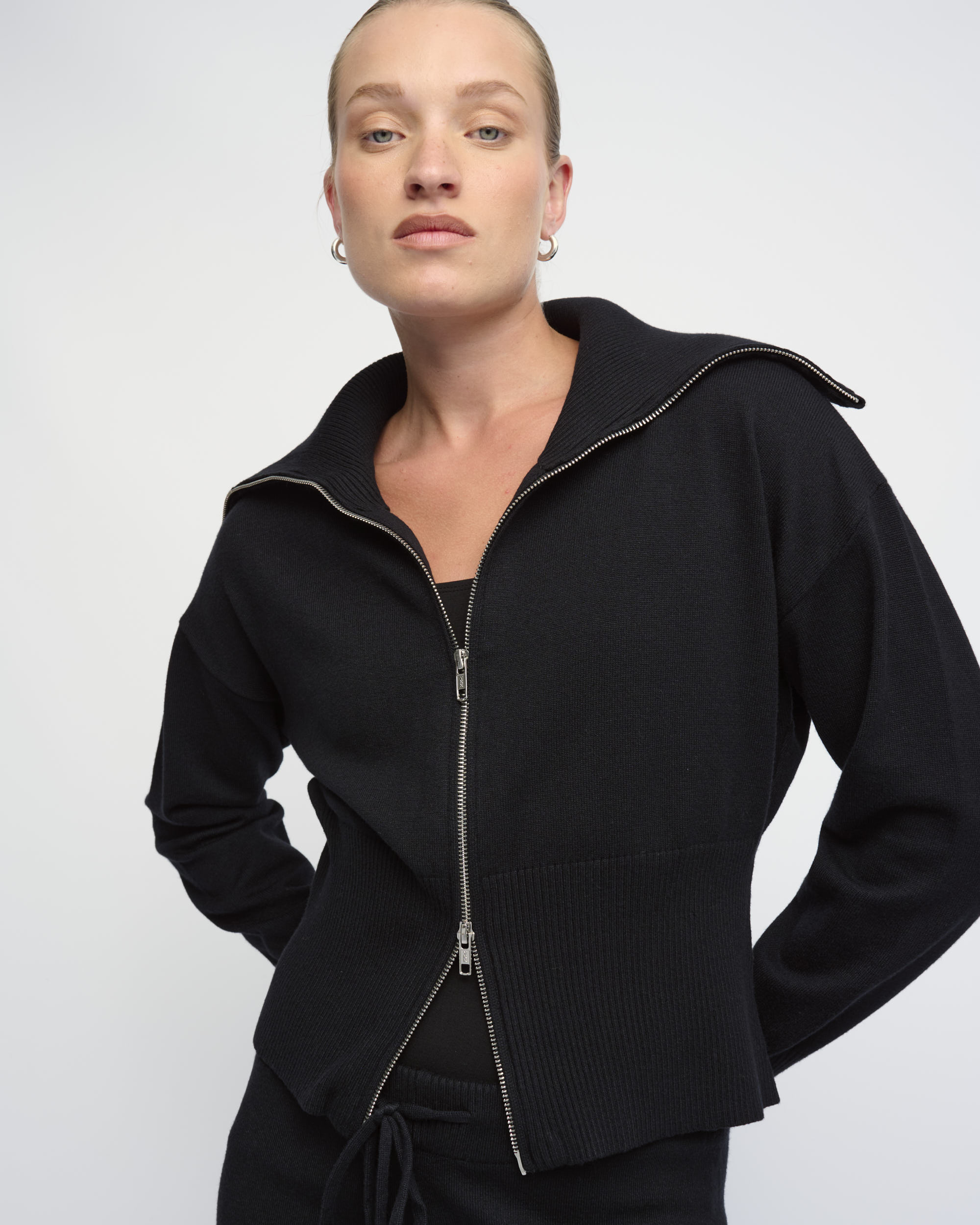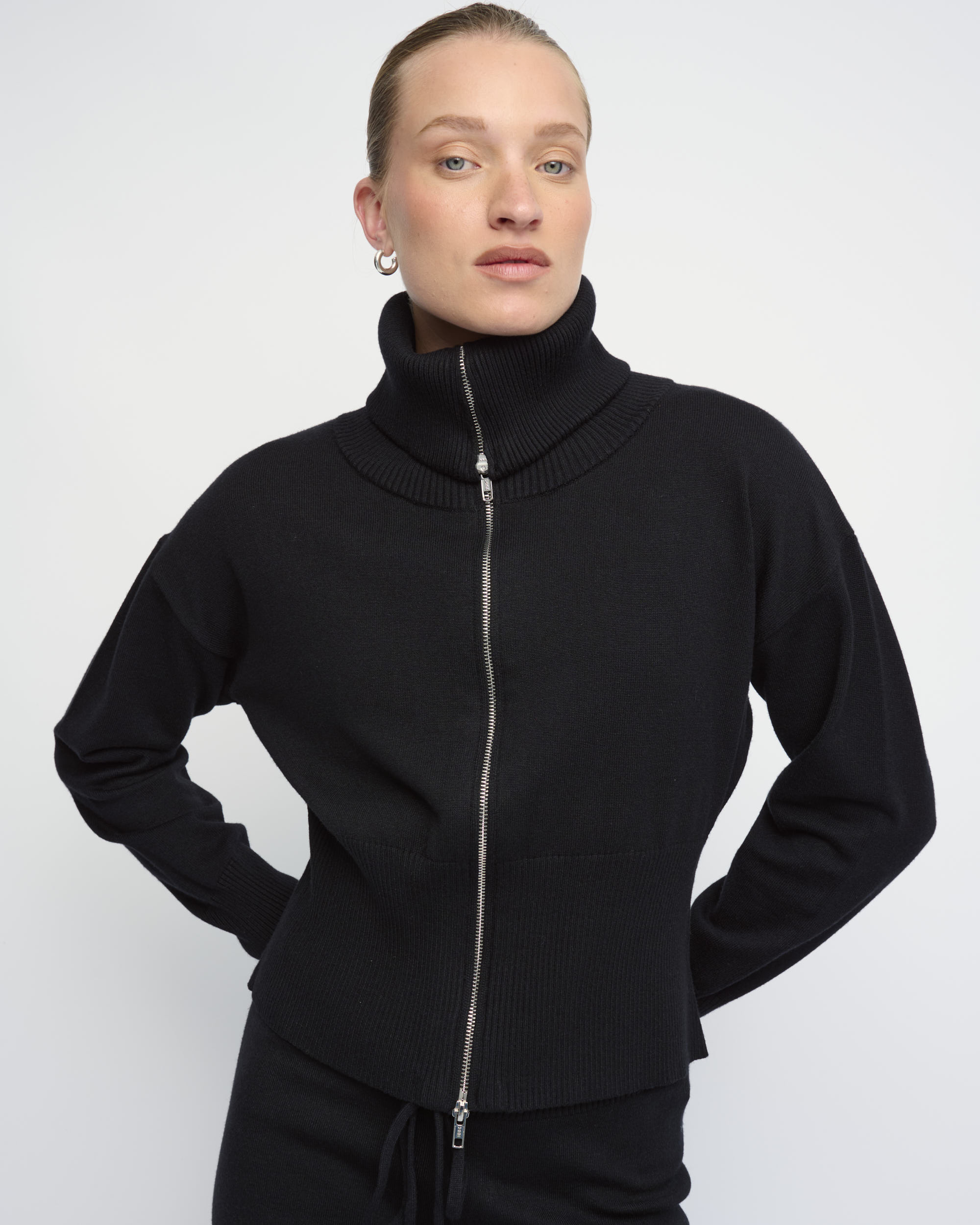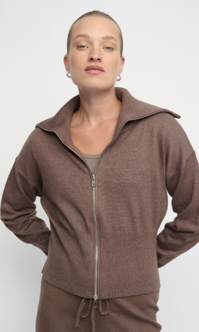 קרדיגן קצר מסריג ויסקוזה מעורב. צללית נינוחה, נאספת בקו המותן. עם צוארון גדול וסגירת רוכסן.