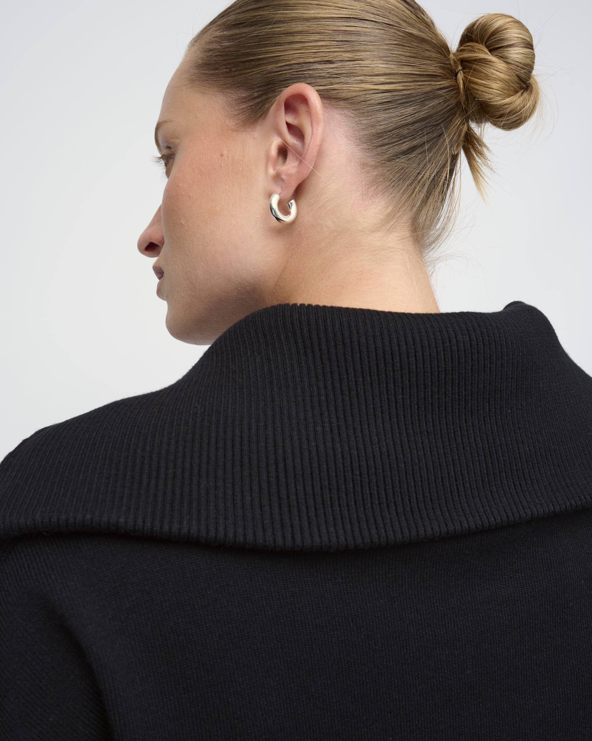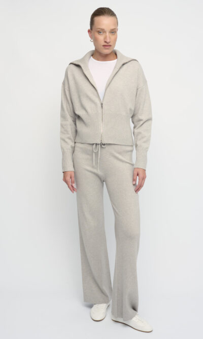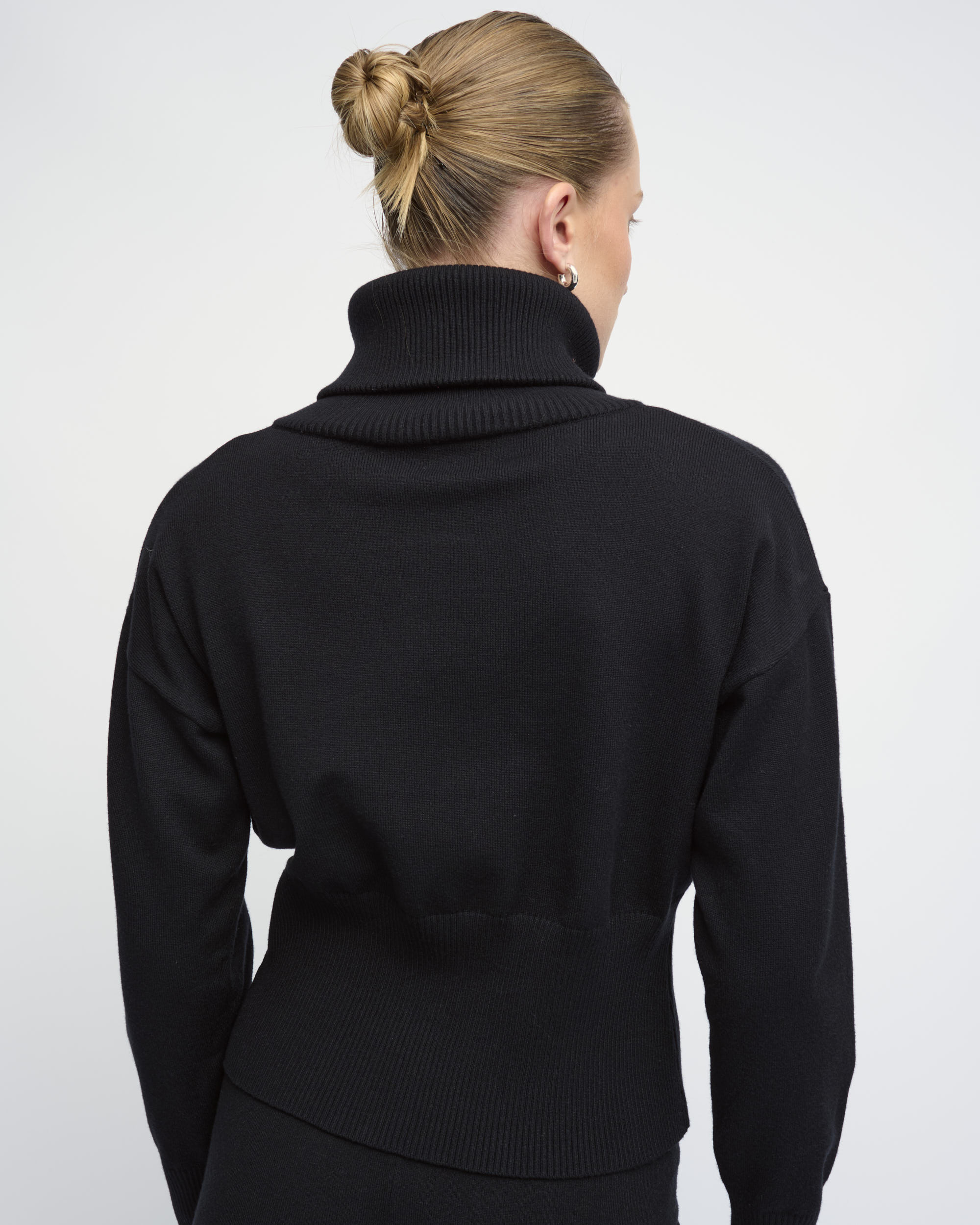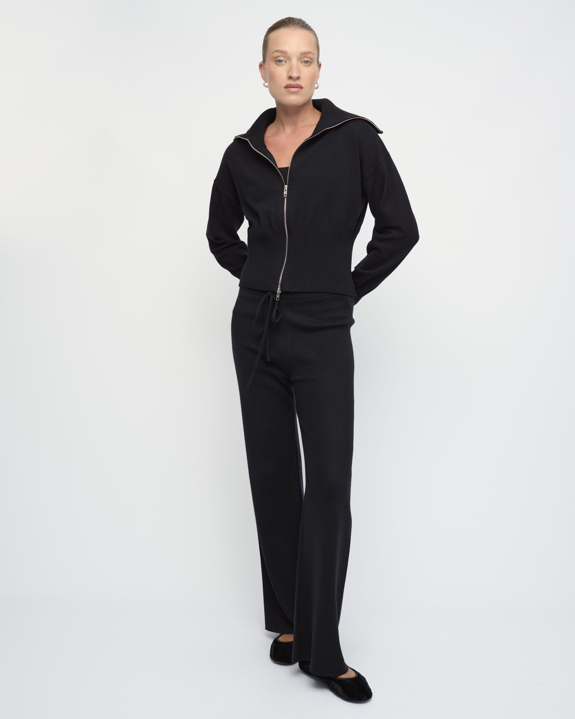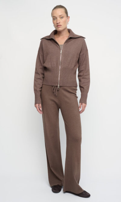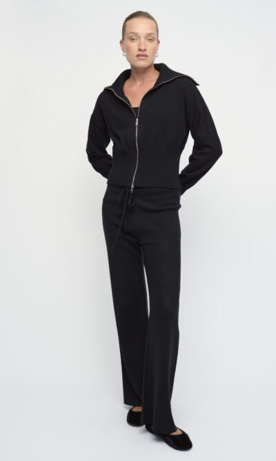 קרדיגן קצר מסריג ויסקוזה מעורב. צללית נינוחה, נאספת בקו המותן. עם צוארון גדול וסגירת רוכסן.