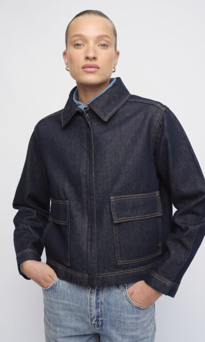 ג’קט ג’ינס, צללית בוקסי רחוקה מהגוף. סגירת רוכסן, כיסי פץ’ בחזית. גוון כחול כהה.
