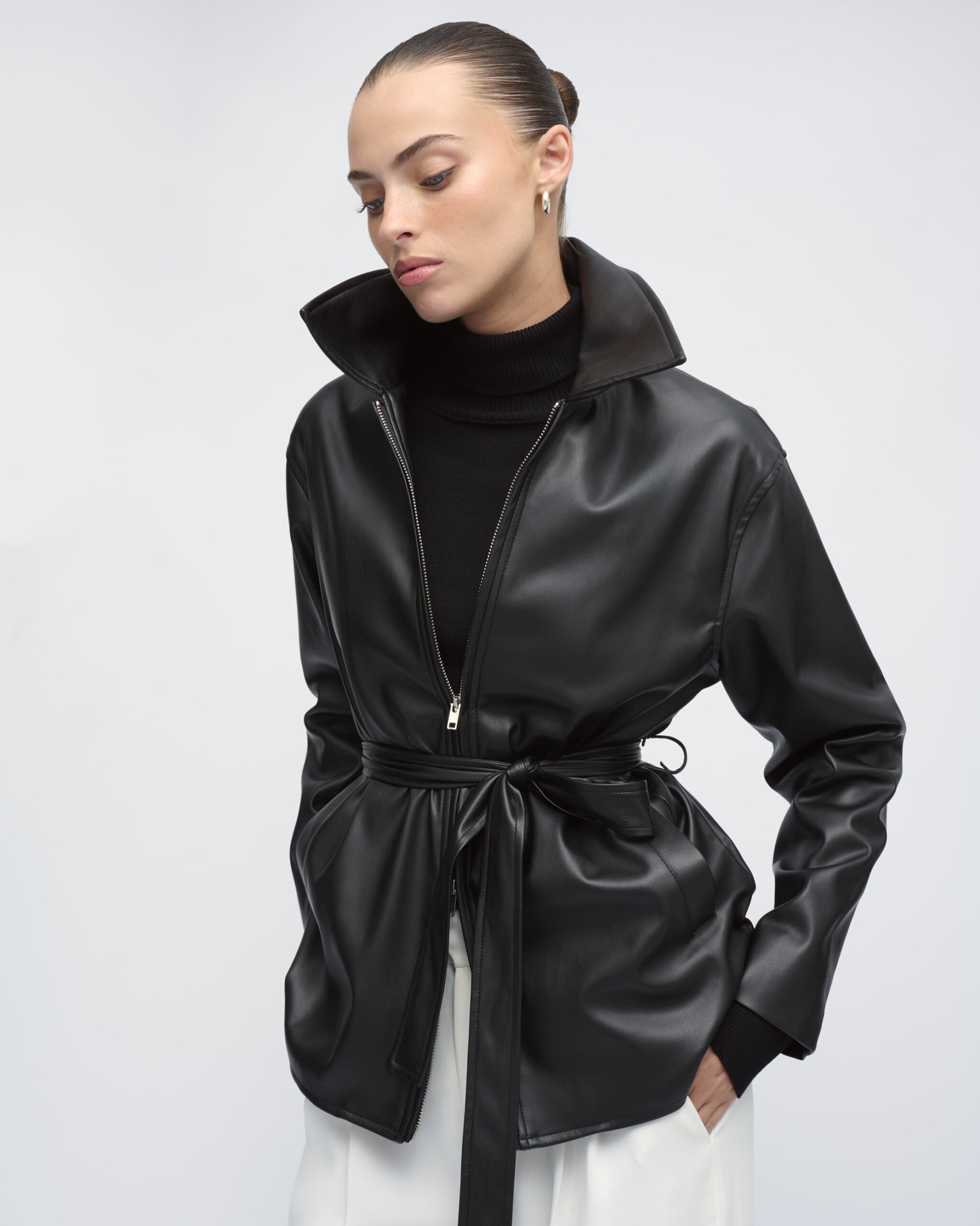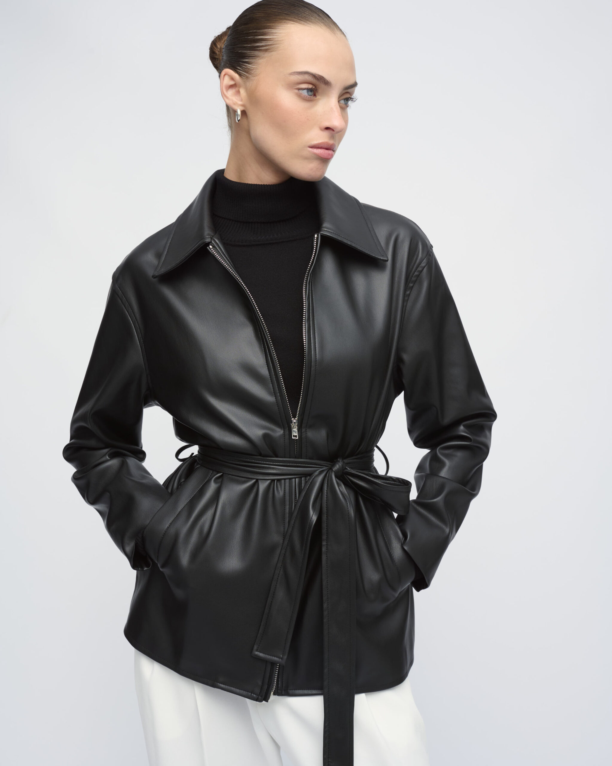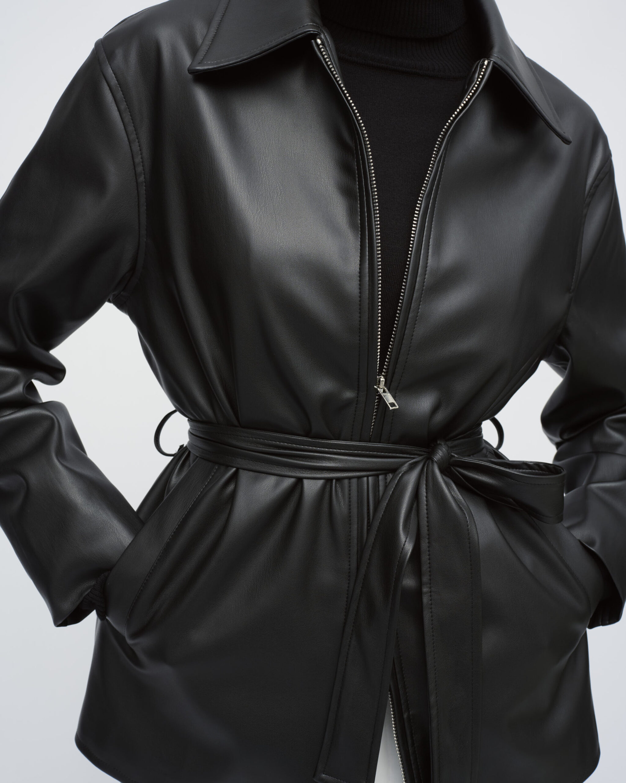 ג’קט בדמוי עור, צוארון גברי, כיסים בחזית. סגירת רוכסן כפולה וחגורת קשירה במותן.