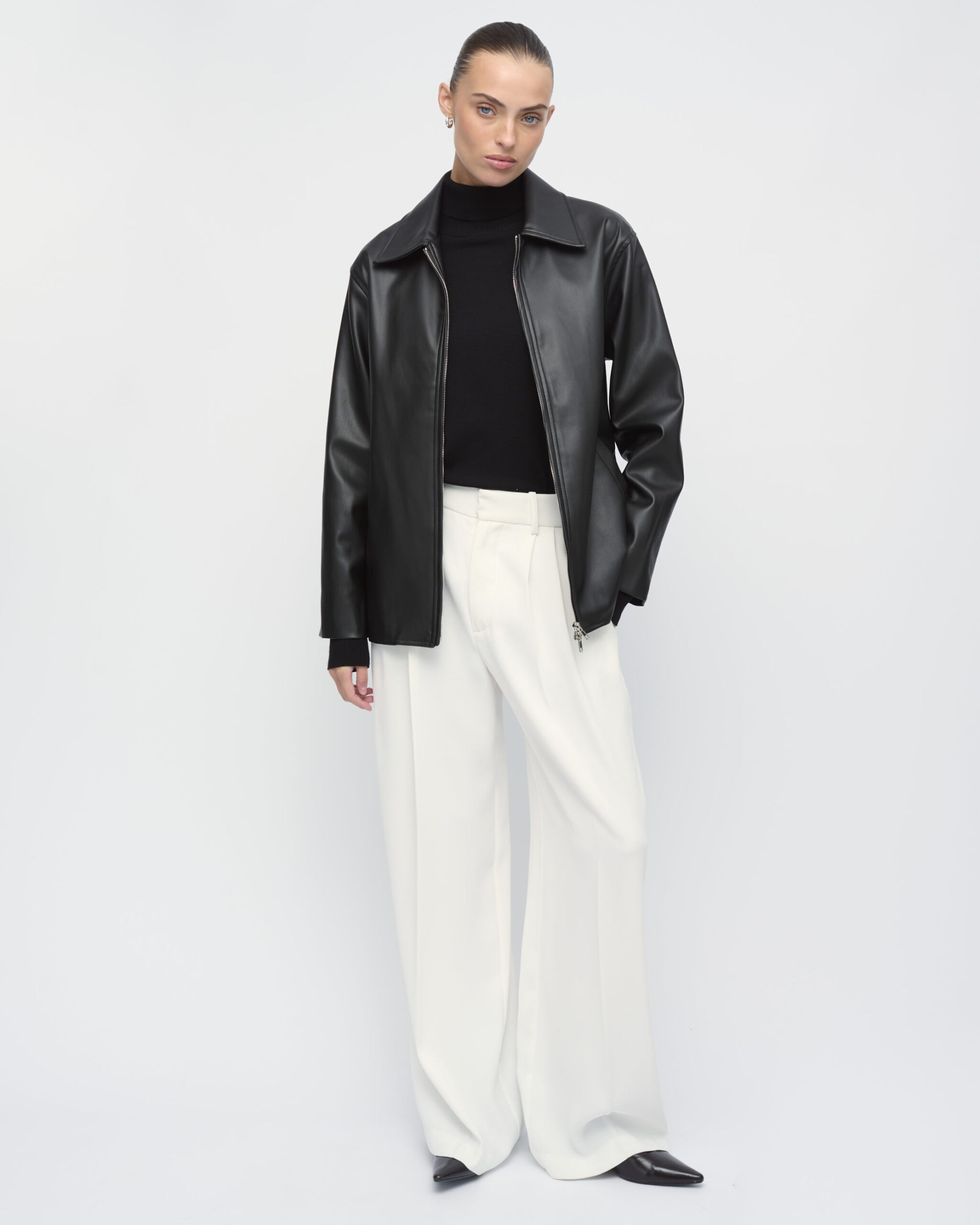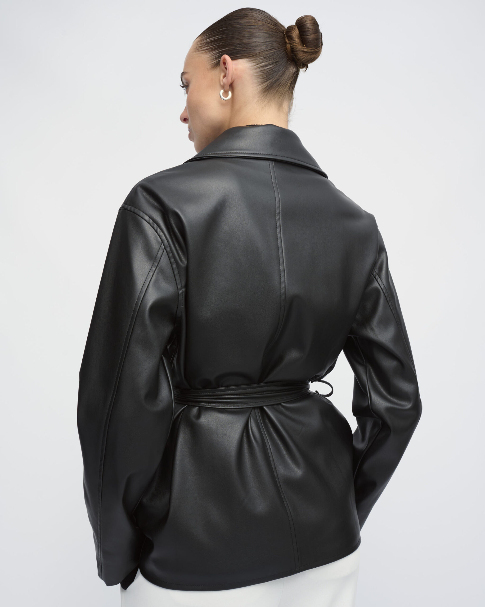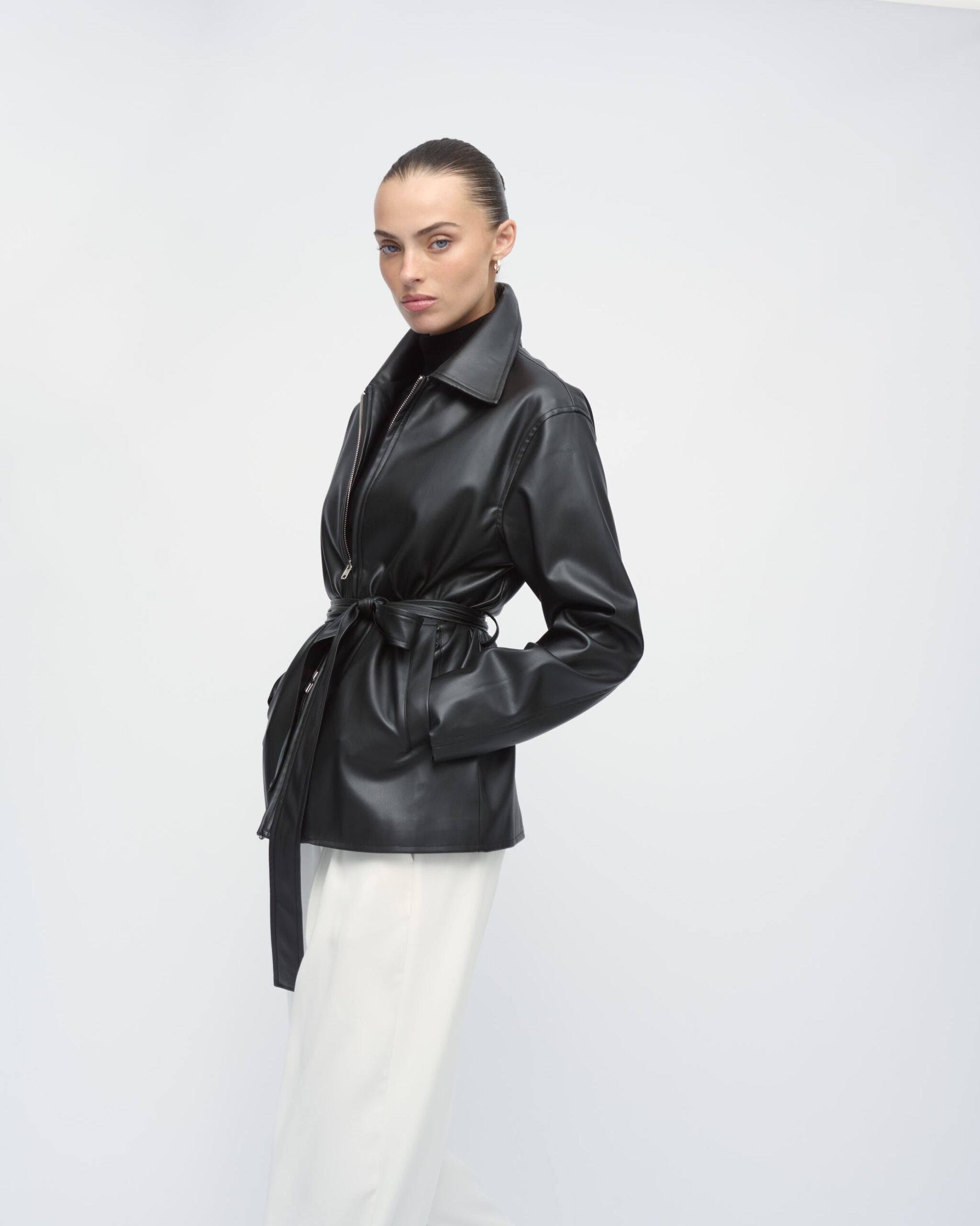 ג’קט בדמוי עור, צוארון גברי, כיסים בחזית. סגירת רוכסן כפולה וחגורת קשירה במותן.