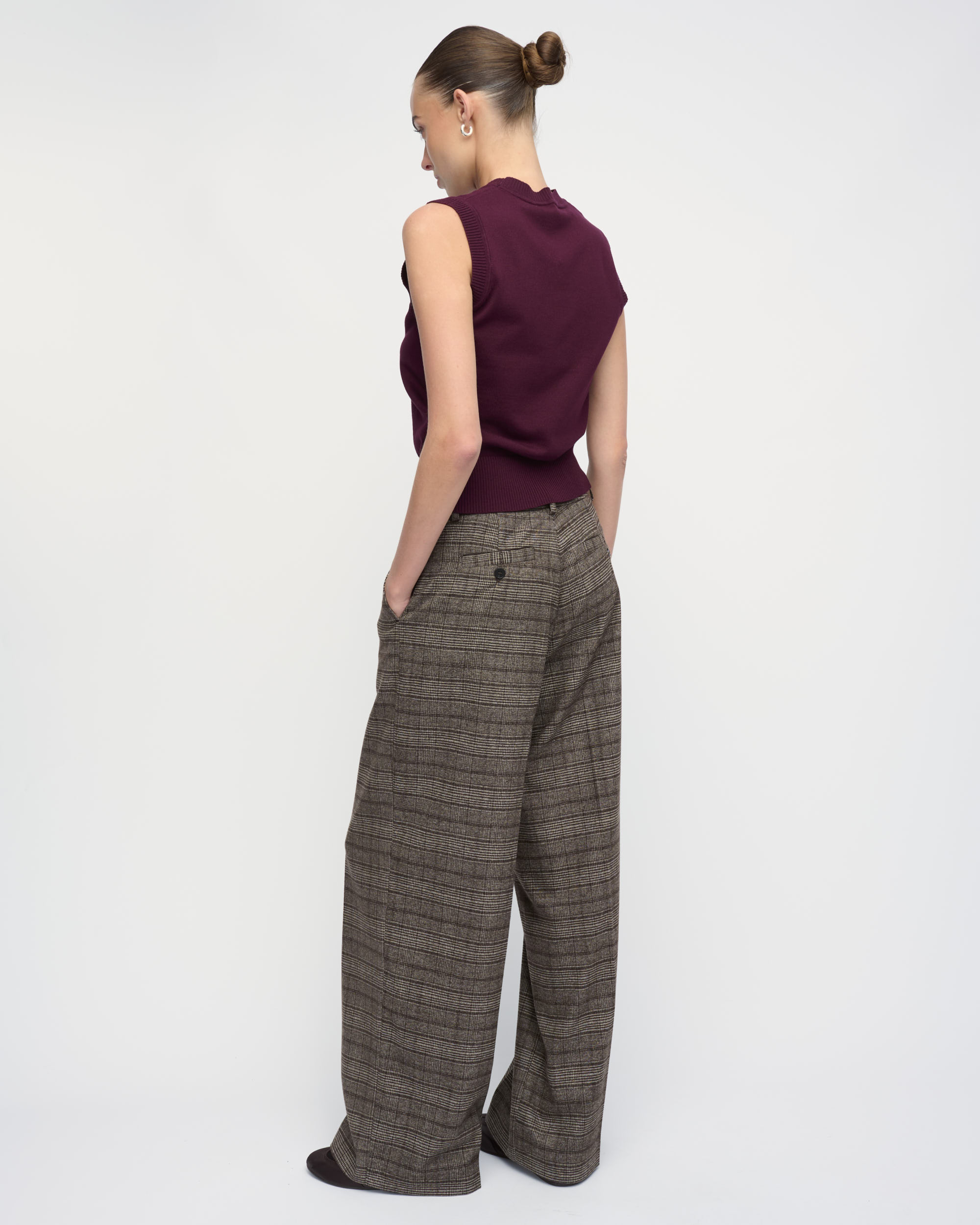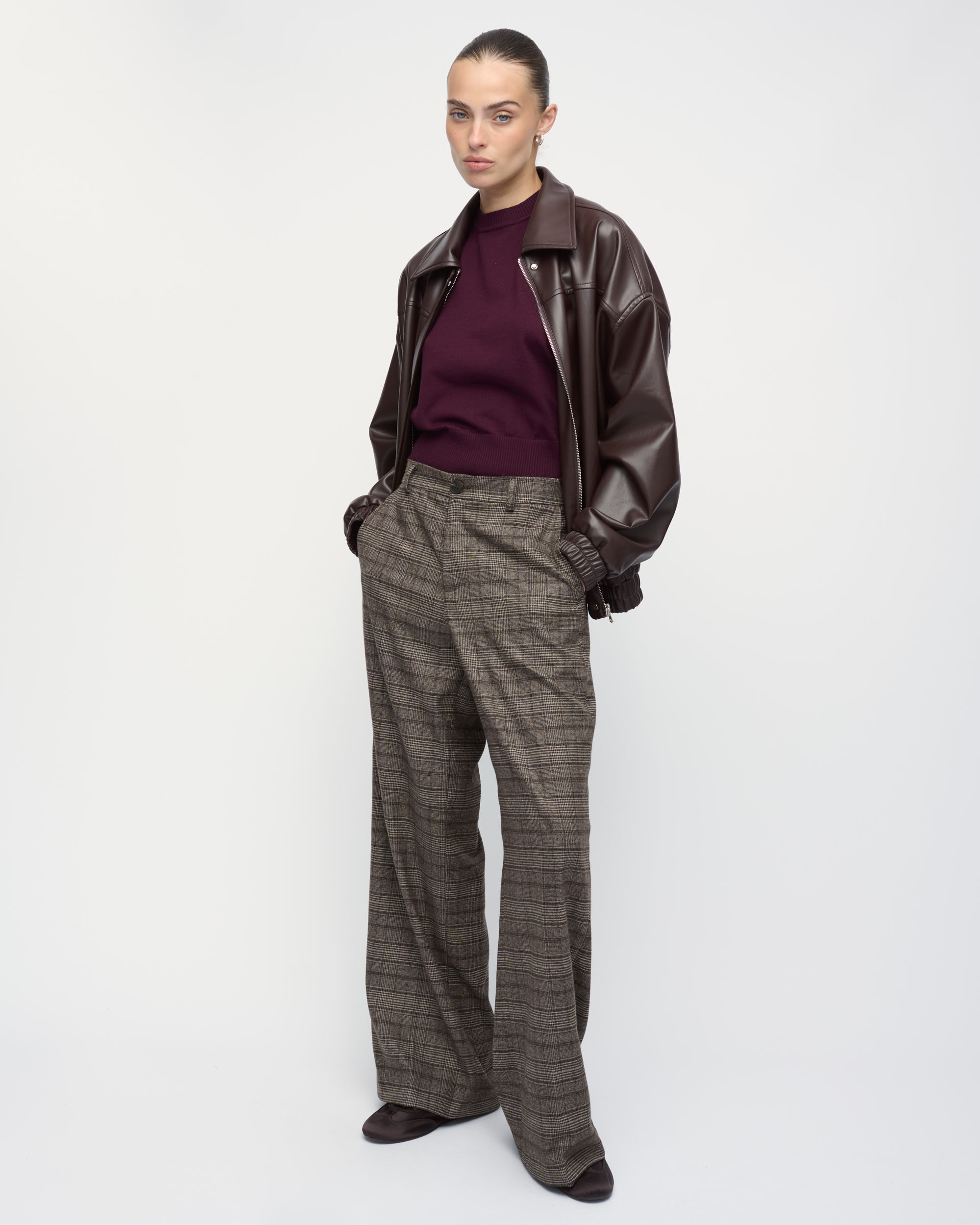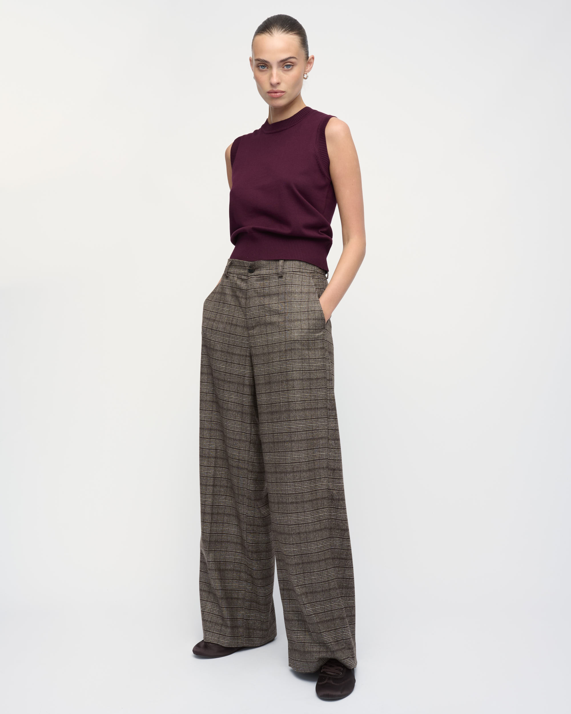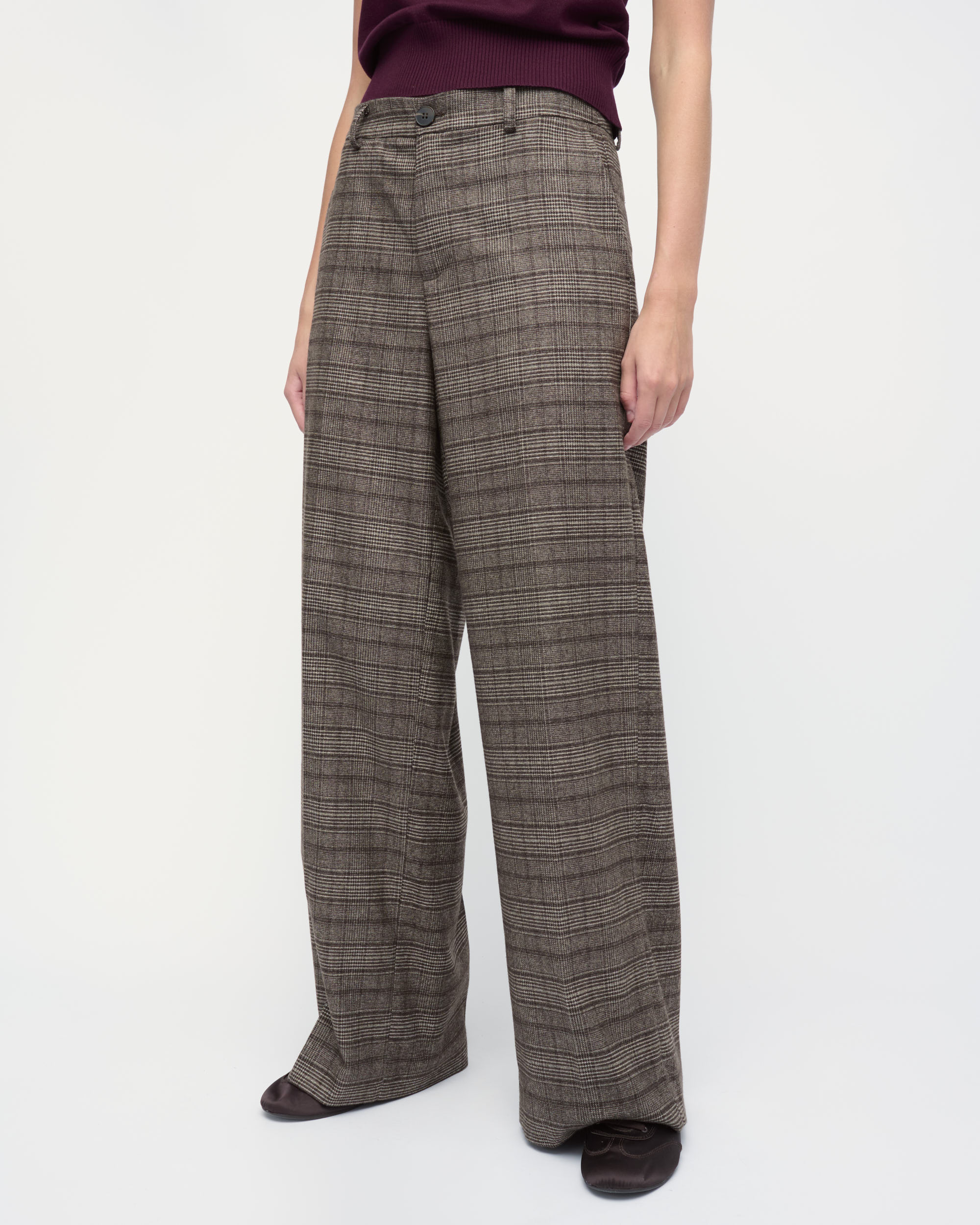 מכנסיים מאריג משובץ. צללית נינוחה, גזרת רגל רחבה. עם כיסי צד.