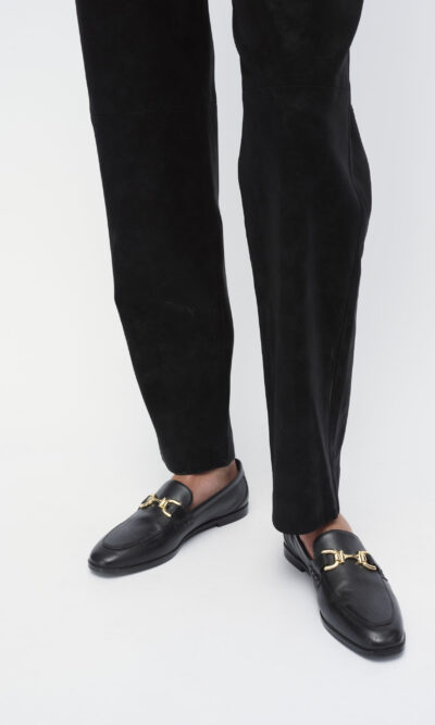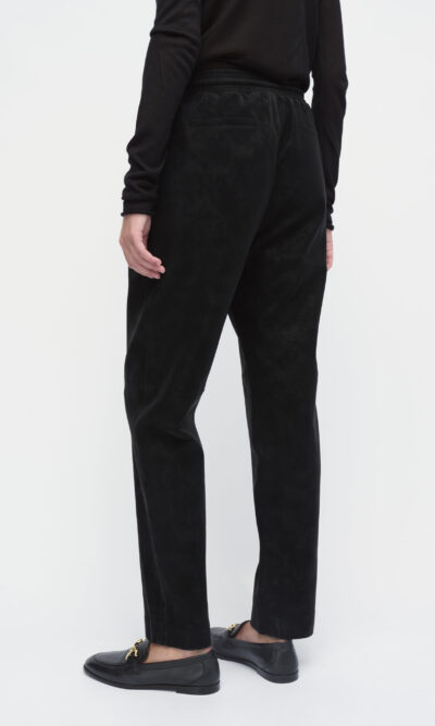 מכנסיים בדמוי זמש, צללית נינוחה. עם כיסי צד. גומי בחגורת המותן עם שרוך קשירה.