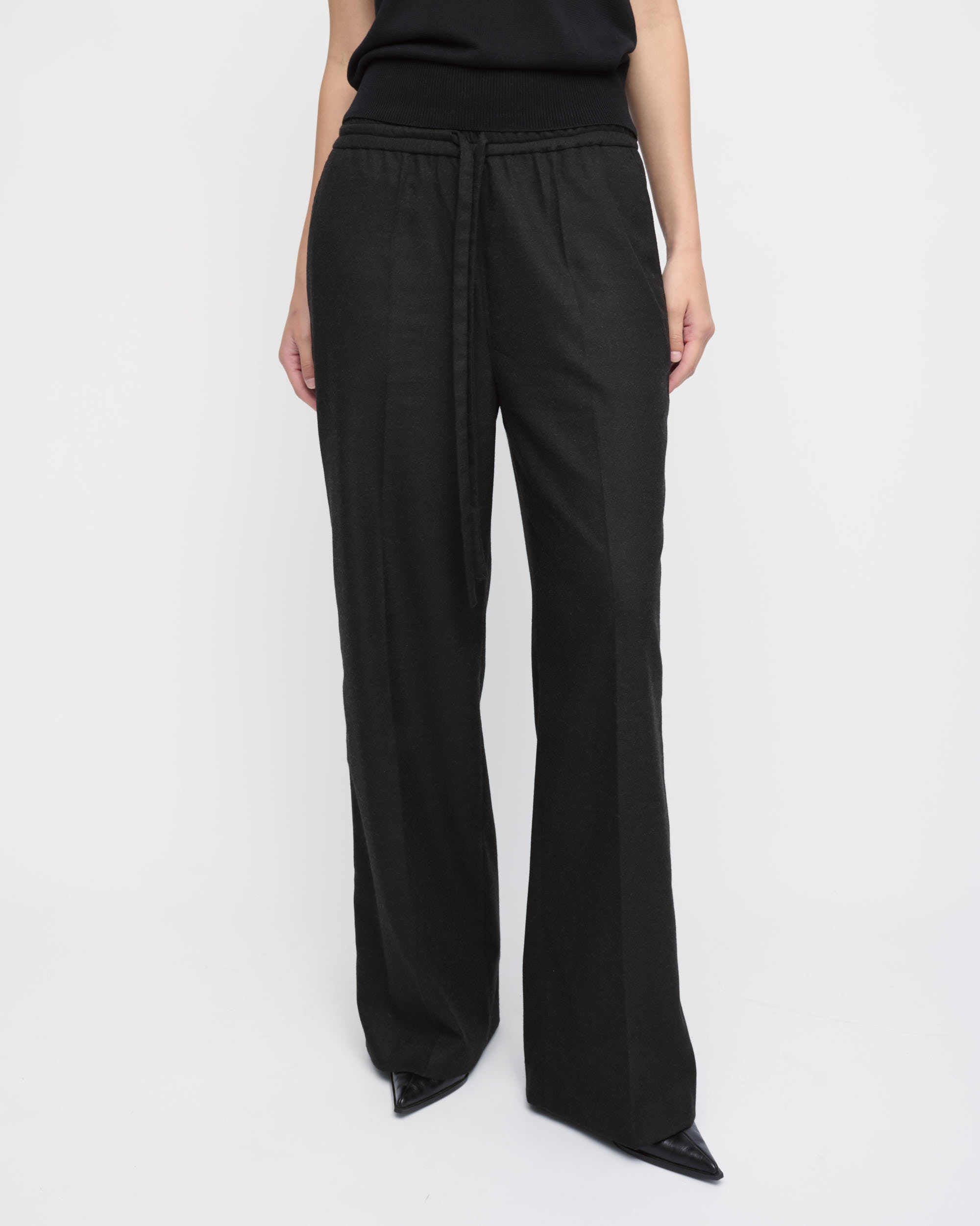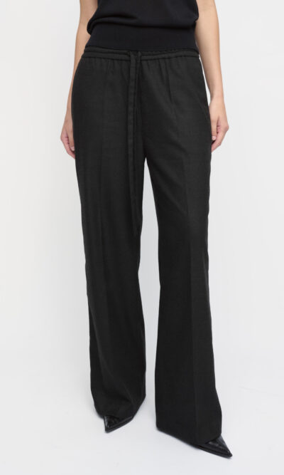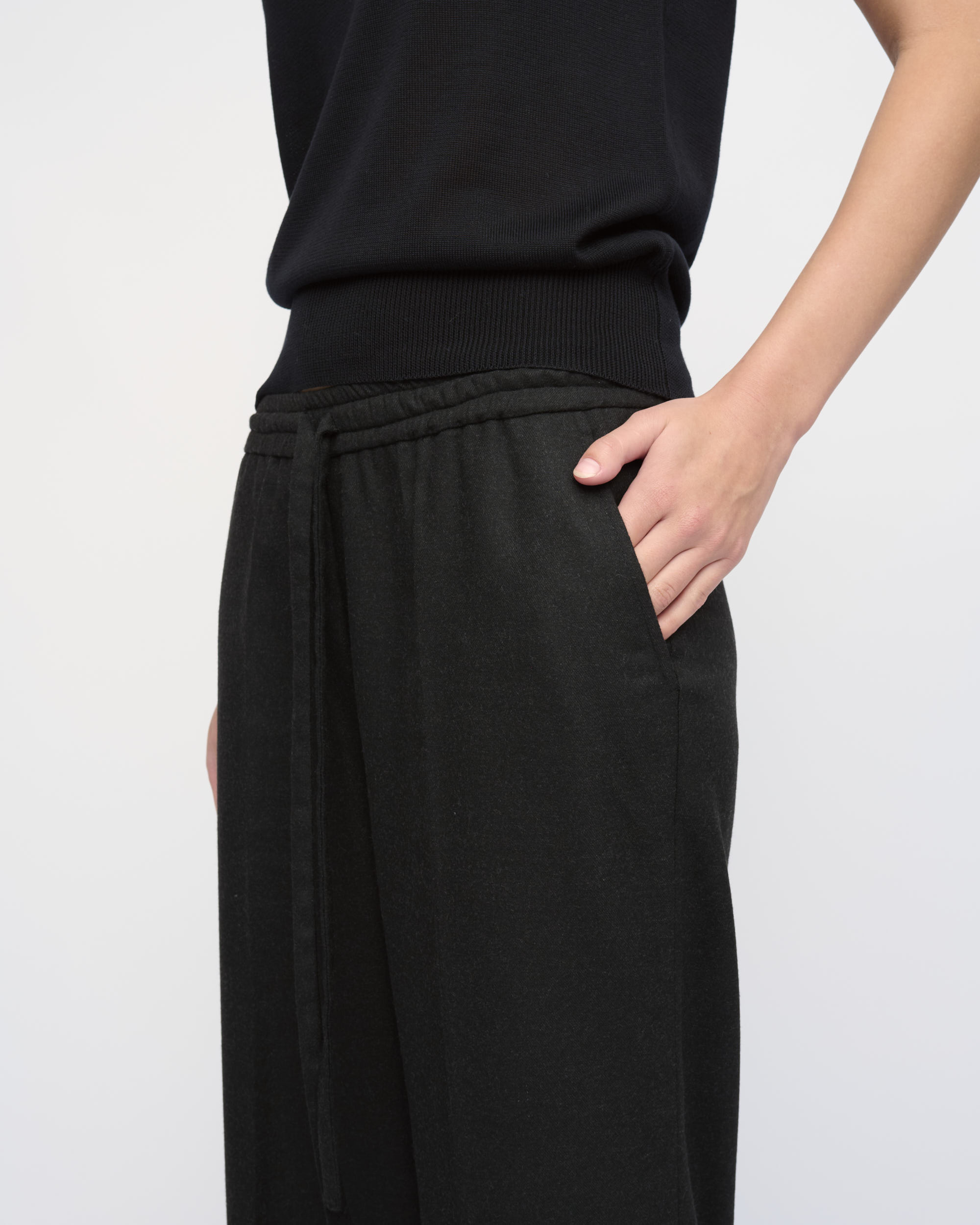 מכנסיים מאריג ויסקוזה מעורב. צללית רחבה, גומי בחגורת המותן, עם רצועת קשירה וכיסי צד.