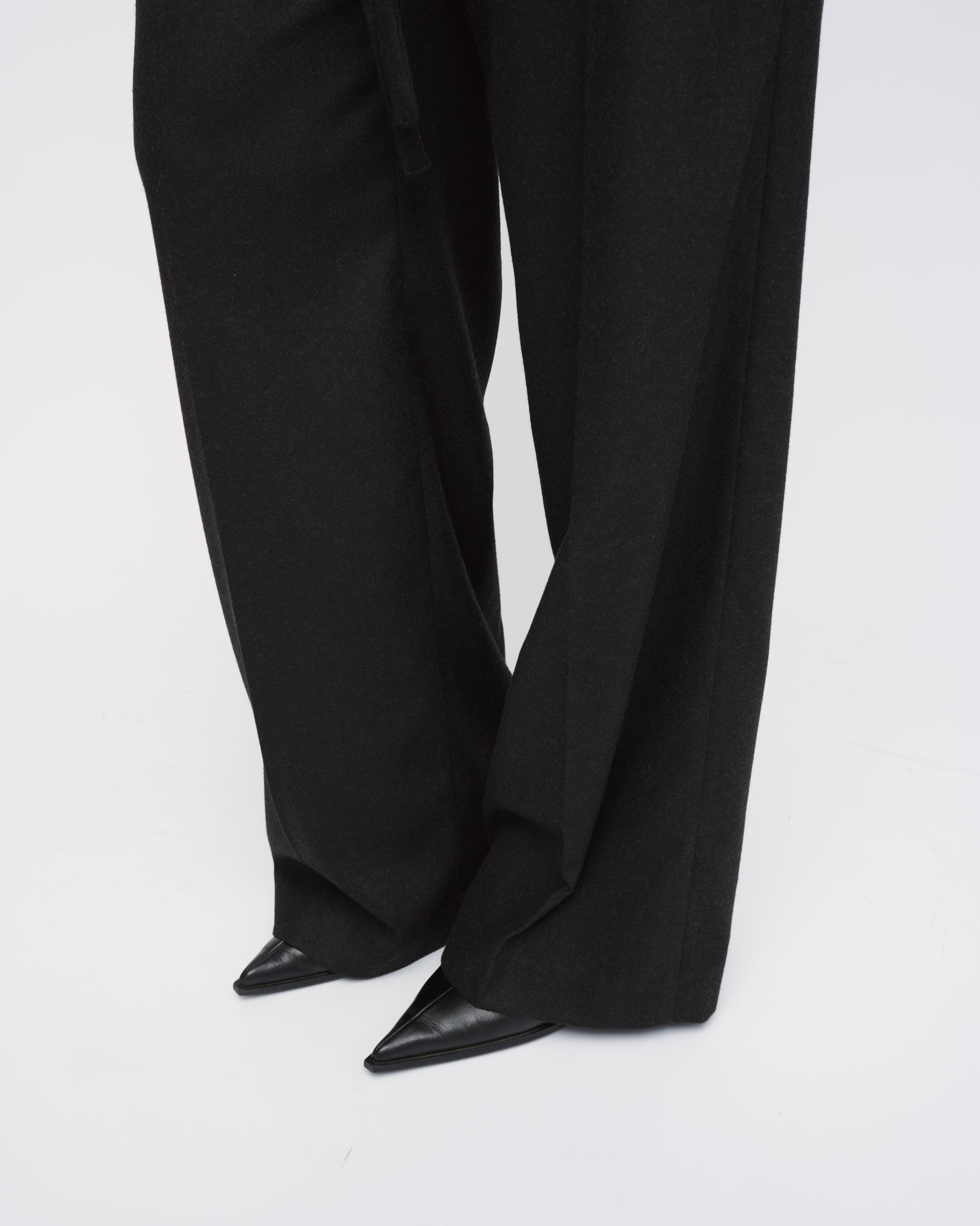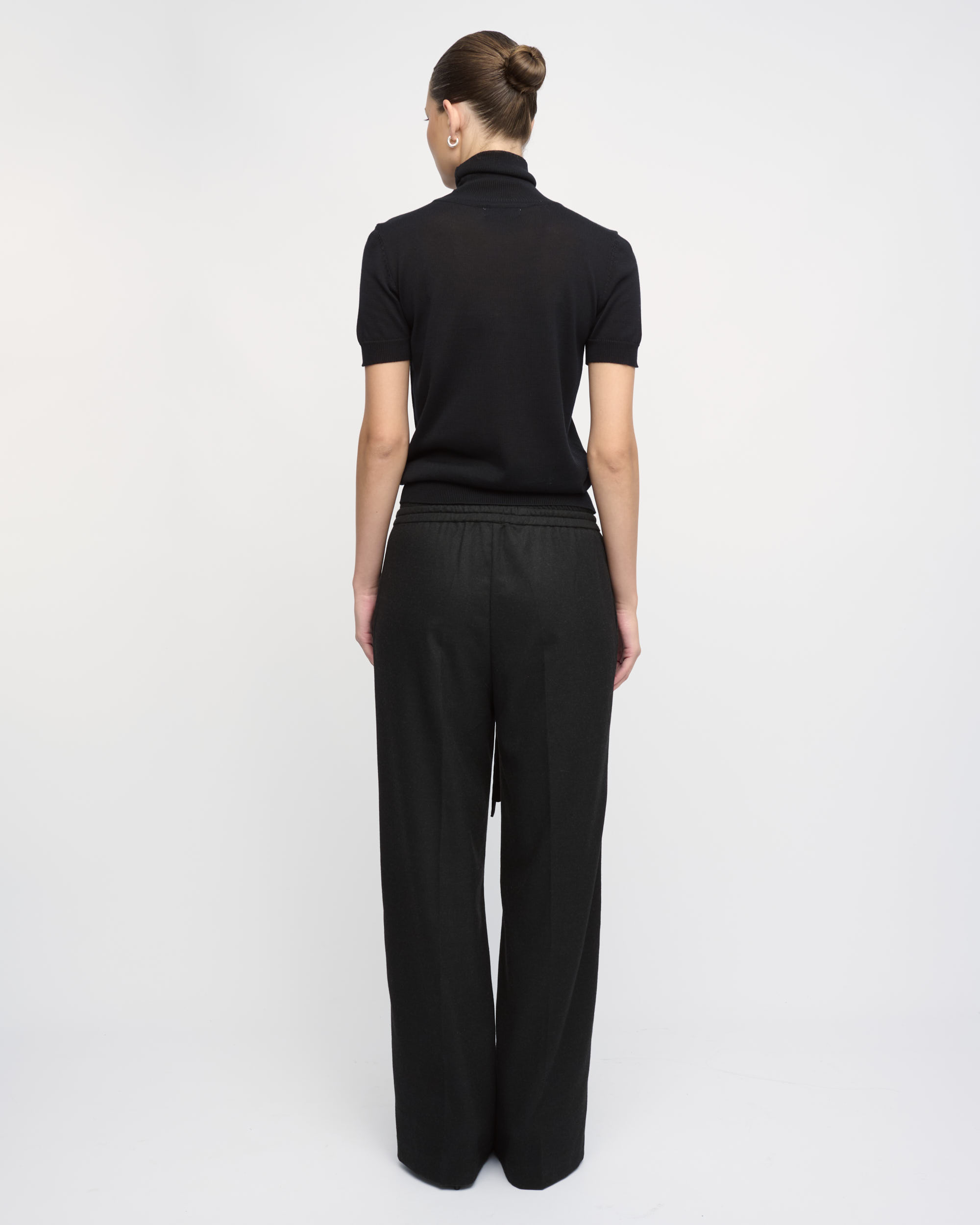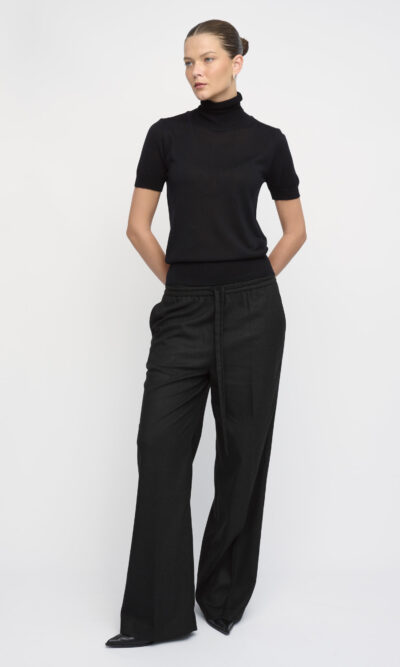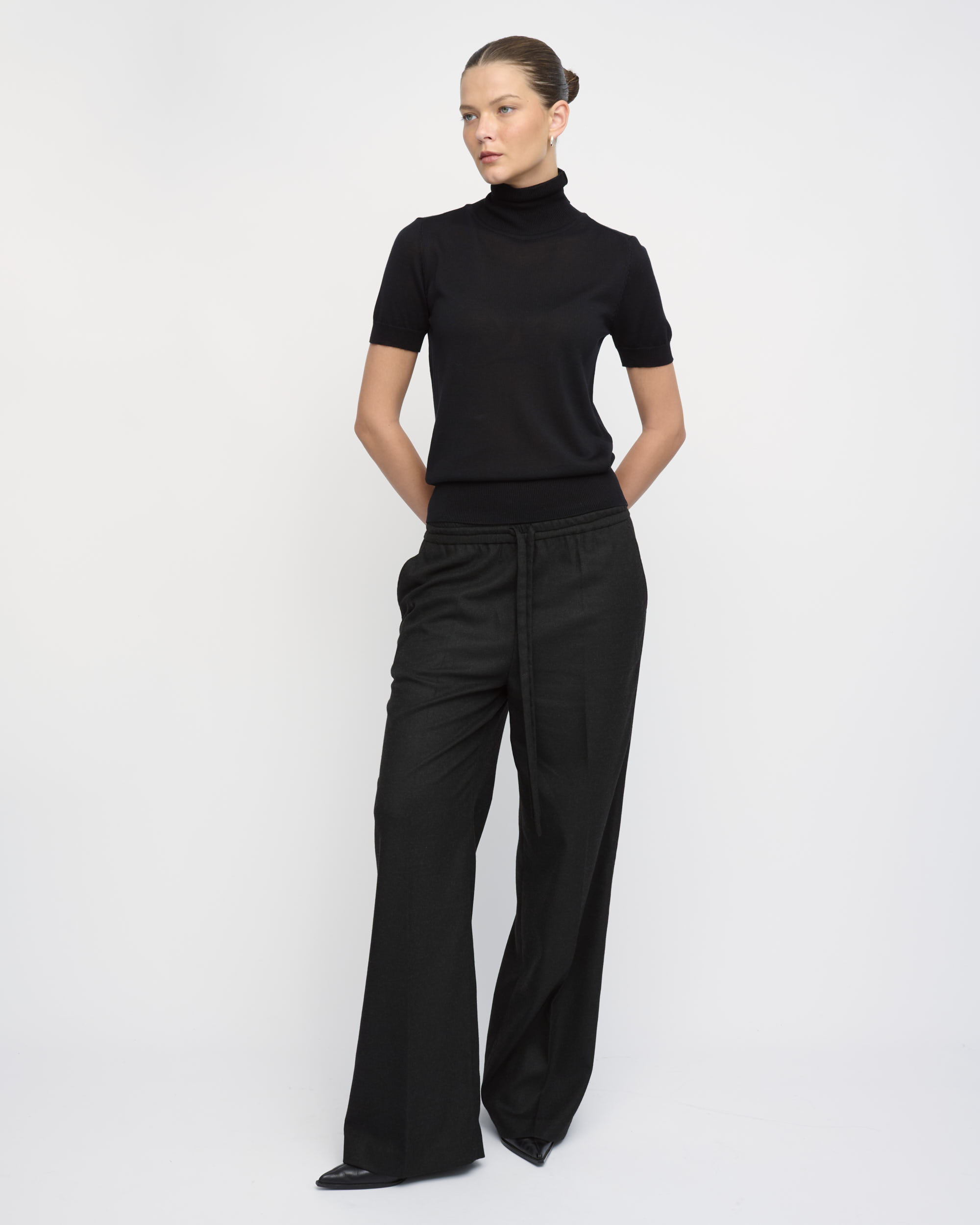 מכנסיים מאריג ויסקוזה מעורב. צללית רחבה, גומי בחגורת המותן, עם רצועת קשירה וכיסי צד.