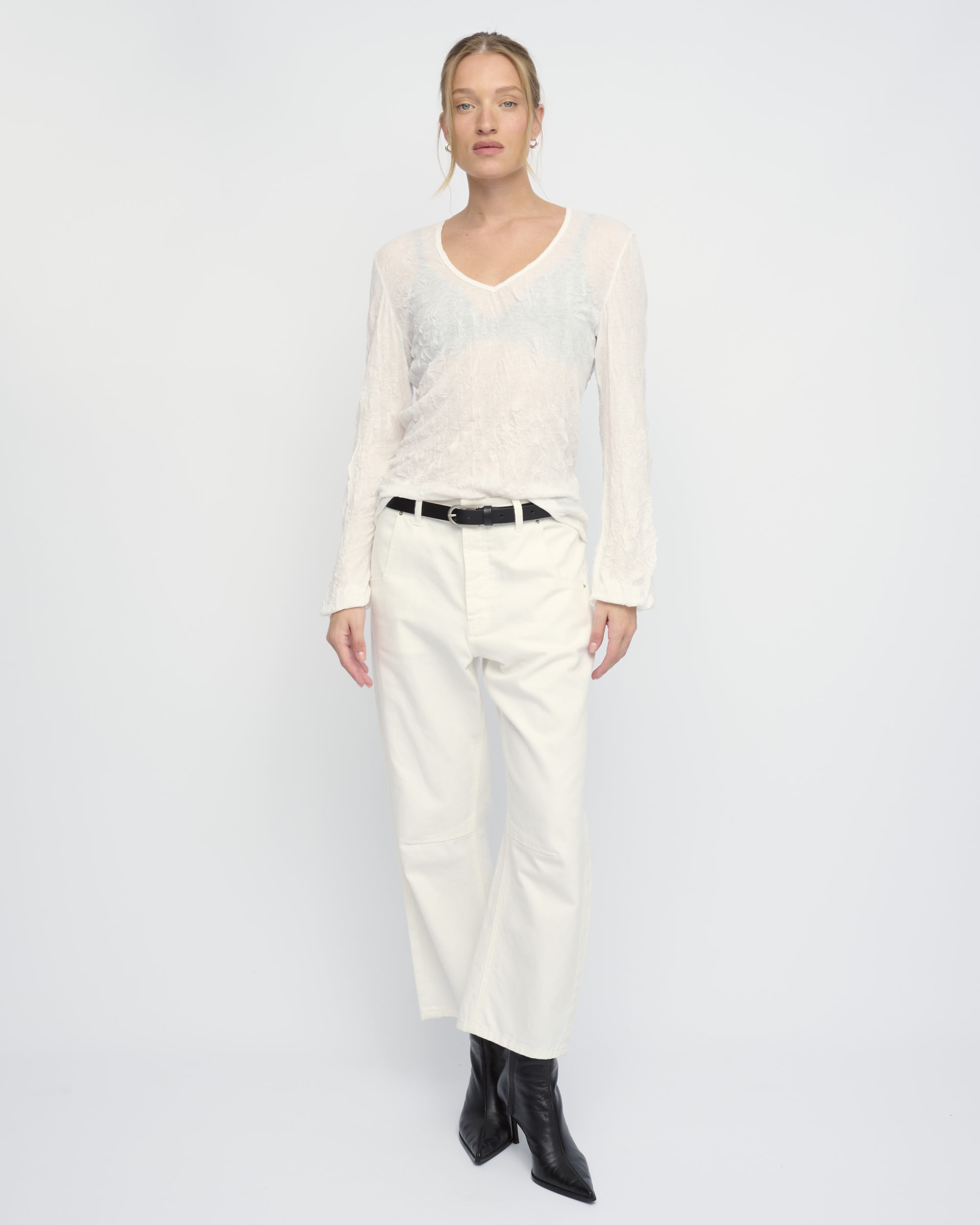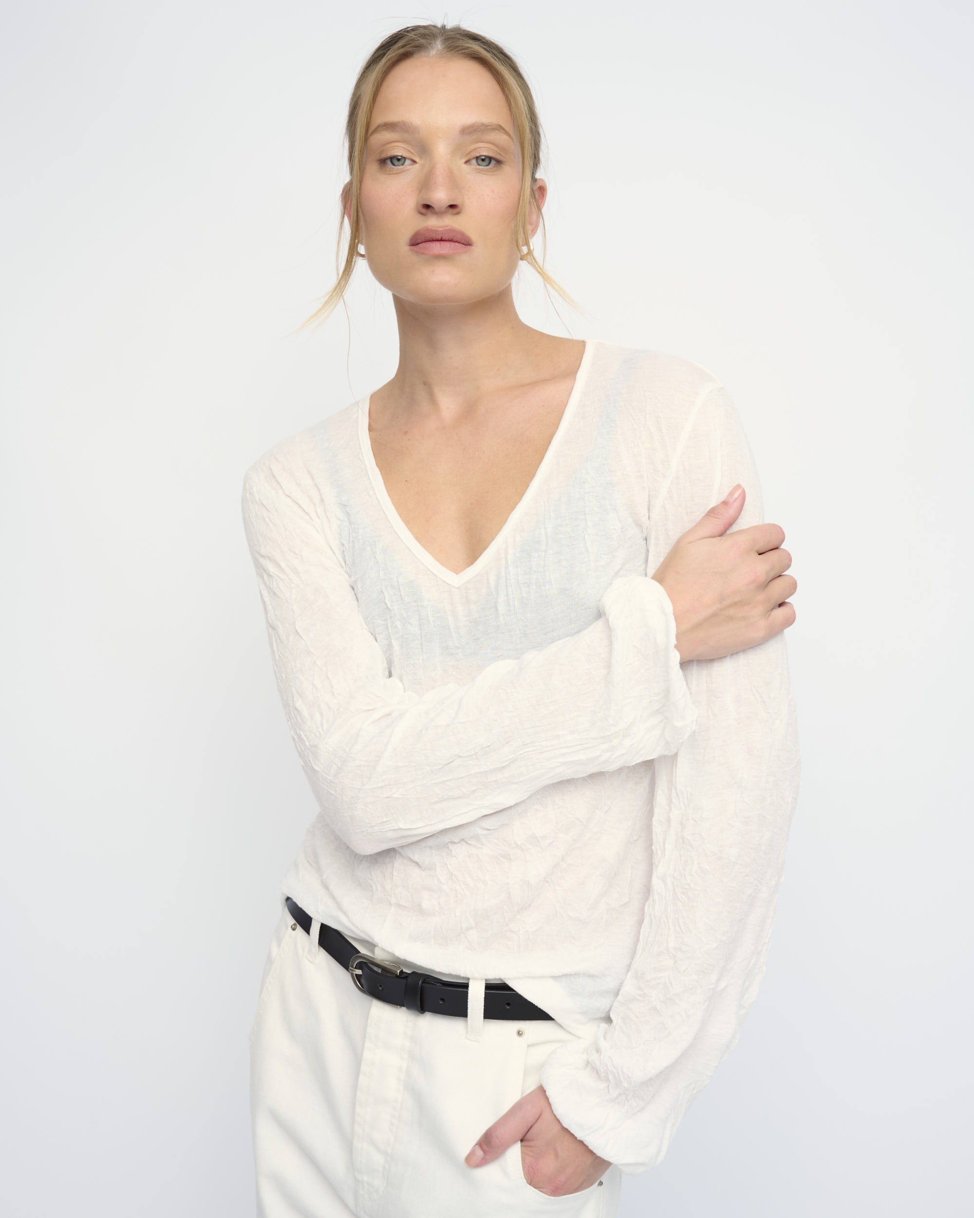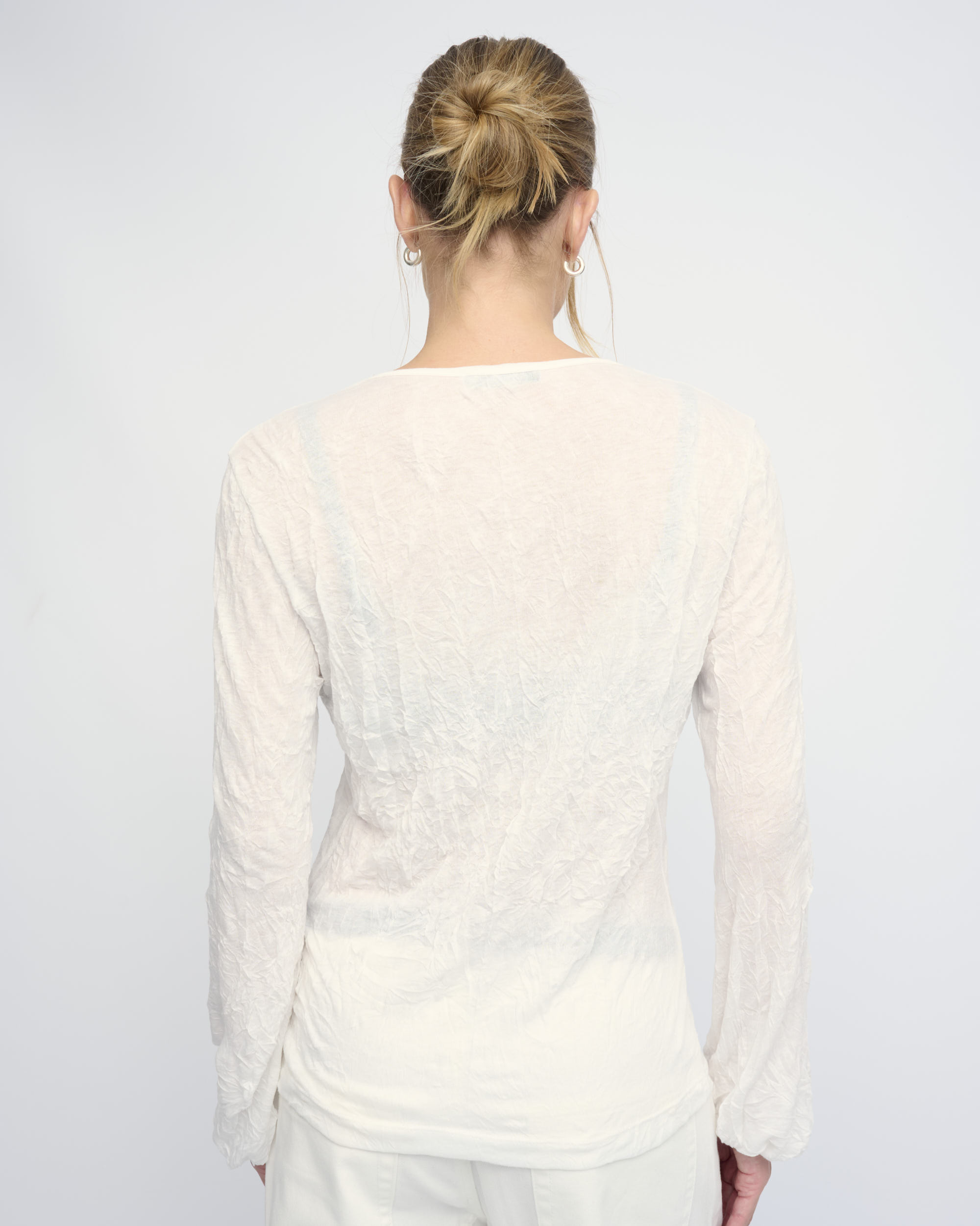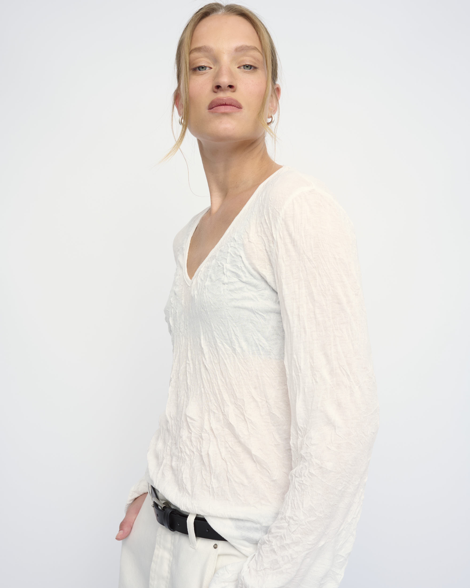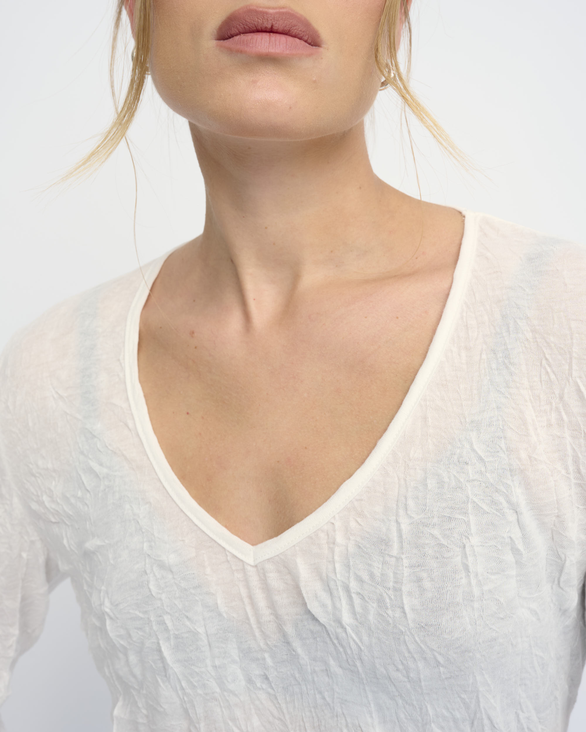 חולצה מסריג ויסקוזה באפקט קימוט. צללית קרובה לגוף. מחשוף וי, שרוולים עם כיווץ עדין במכפלת.