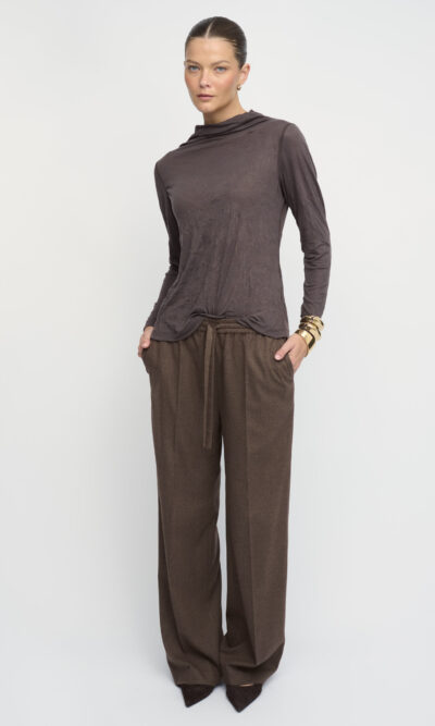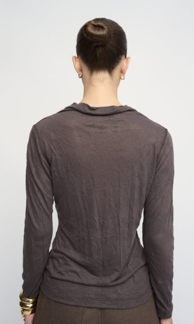 טופ מטריקו כותנה דק באפקט קימוט עדין. צללית קרובה לגוף, עם צוארון גבוה.