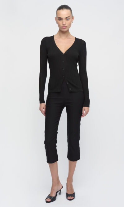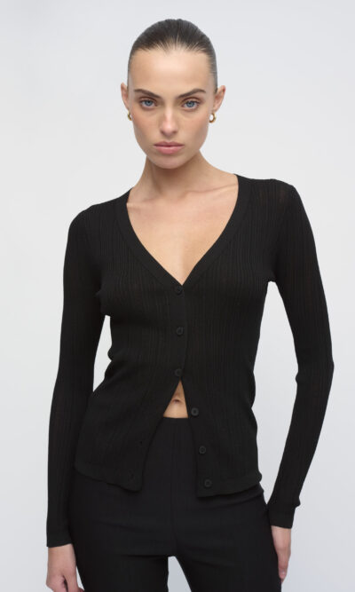 קרדיגן בסריגת ריב מגוונת. צללית צמודה, מחשוף וי, עם סגירת כפתורים לאורך החזית.