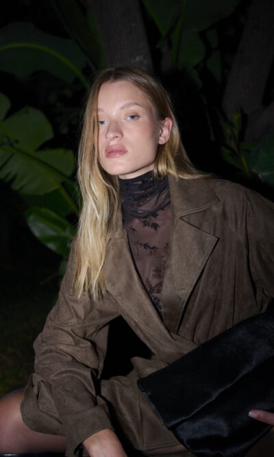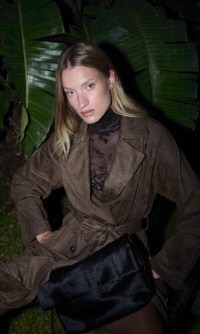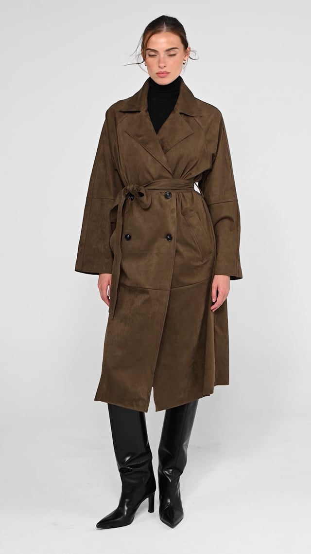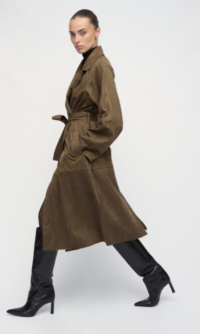 מעיל טרנץ’ מדמוי זמש. שרוול רגלן, רכיסת כפתורים כפולה. עם חגורת קשירה.