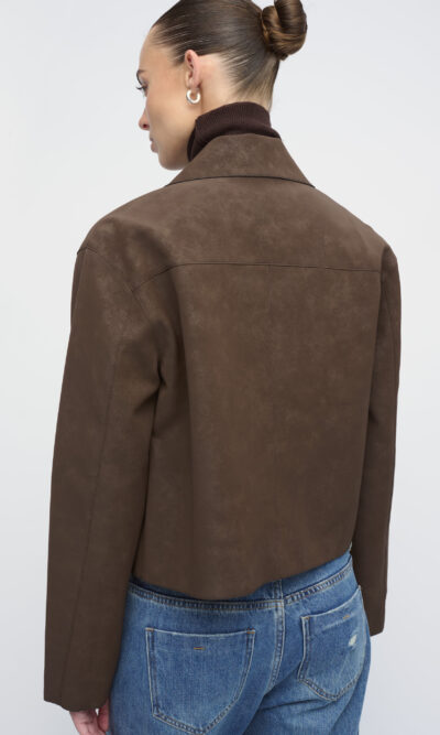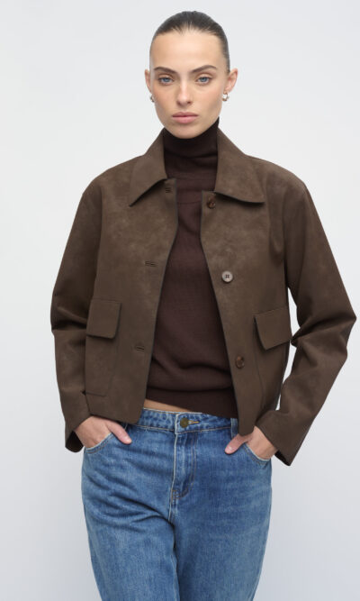 ג’קט קצר בדמוי זמש. עם סגירת כפתורים וכיסים גדולים בחזית.
