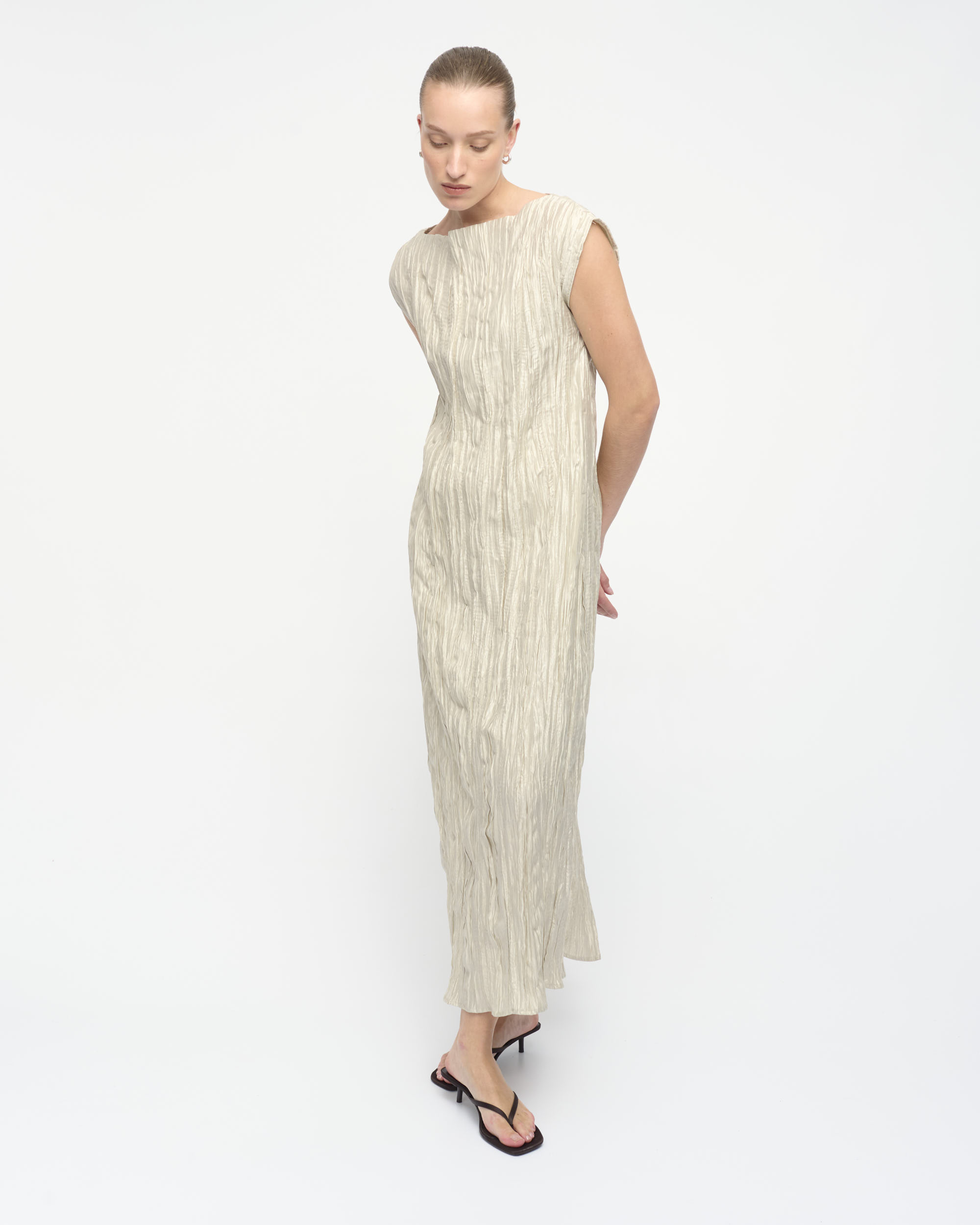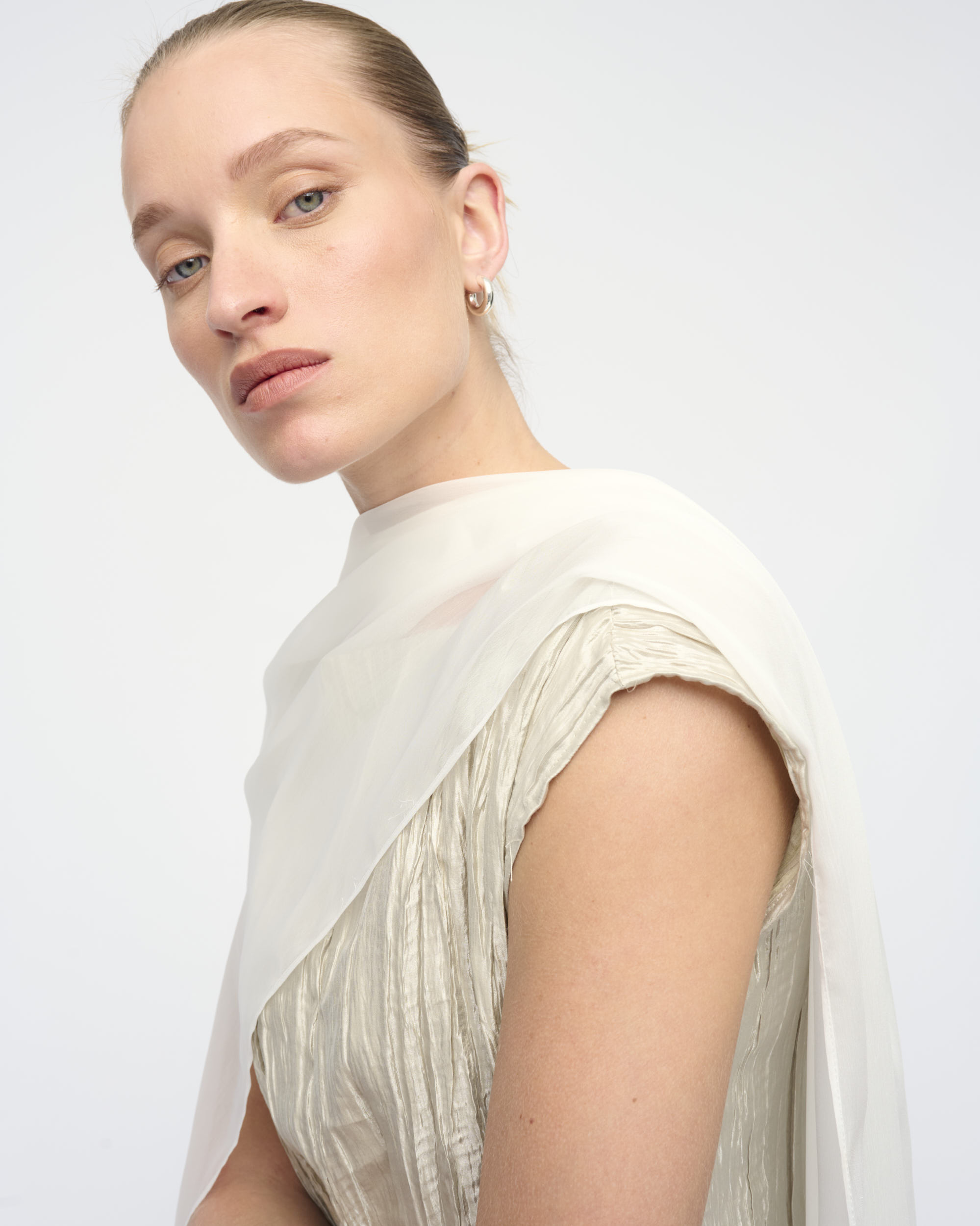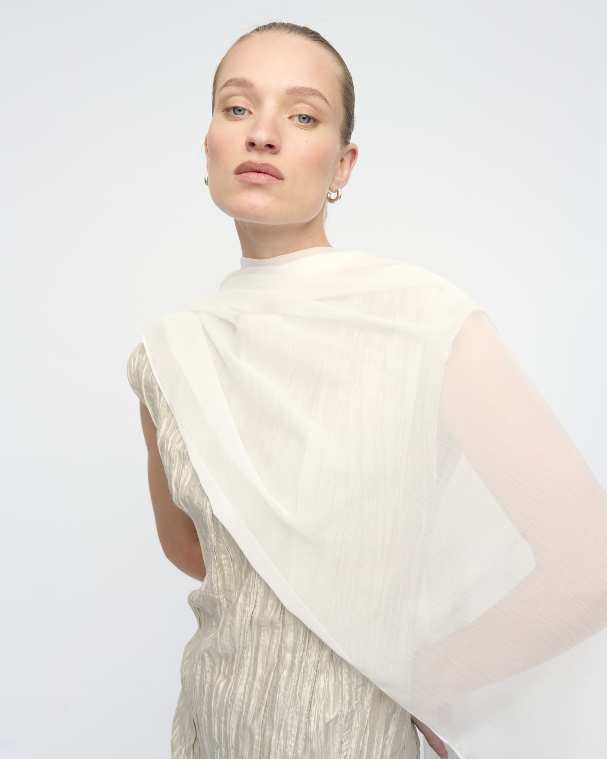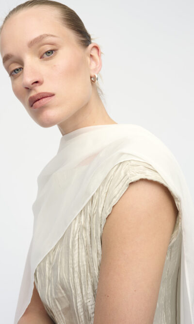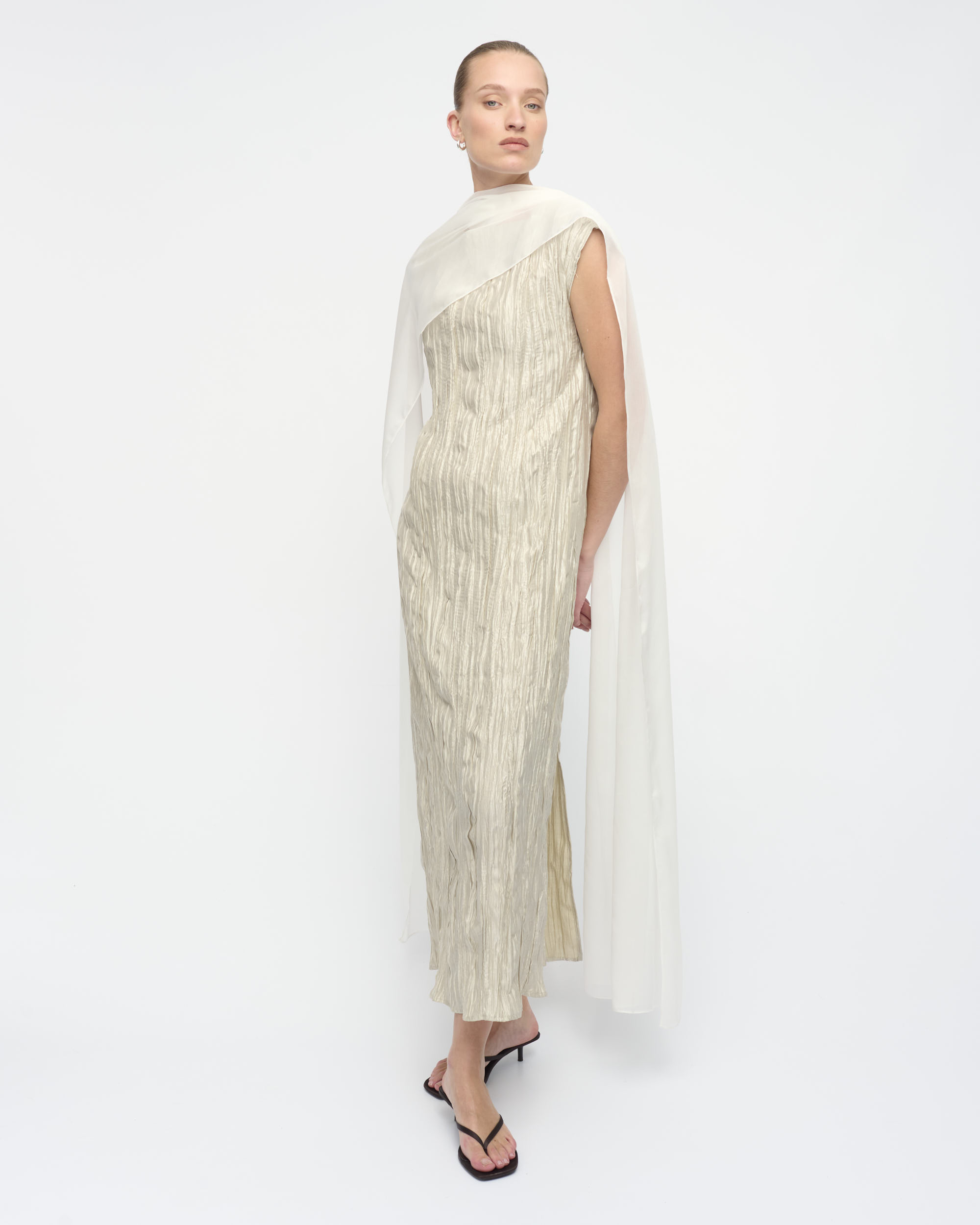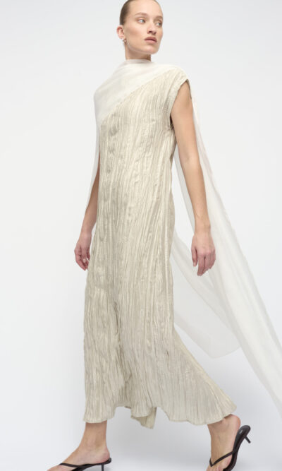 שמלה מאריג טקסטורה מבריק, צללית נינוחה. מחשוף סירה. עם צעיף שיפון בגוון תואם.