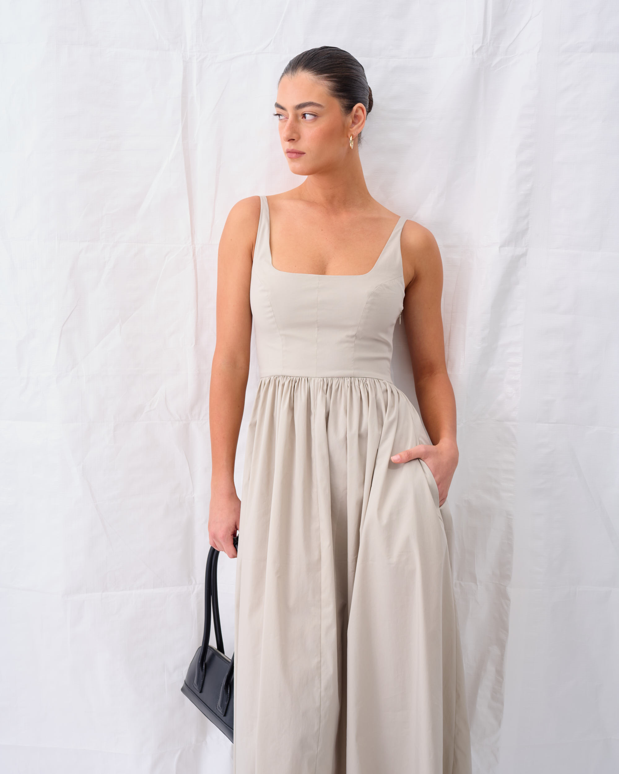 שמלה מכותנה ליקרה, חלק עליון צמוד עם פאנל אלסטי בגב המאפשר מתיחה והתאמה. כתפיות אלסטיות נוחות להתאמה. חצאית פעמון מלא, עם כיסים נסתרים.