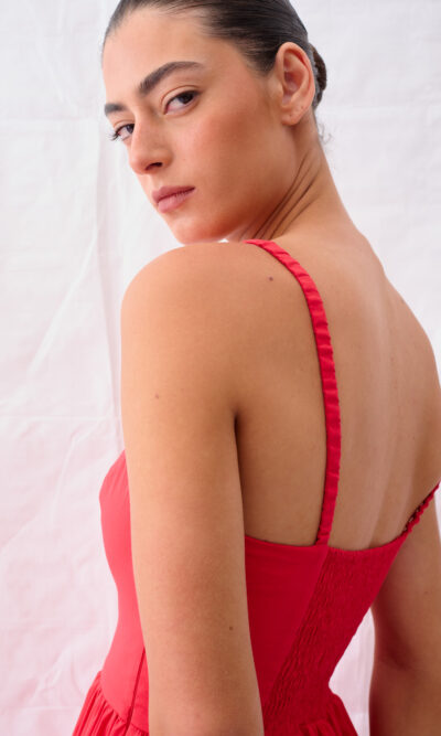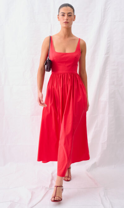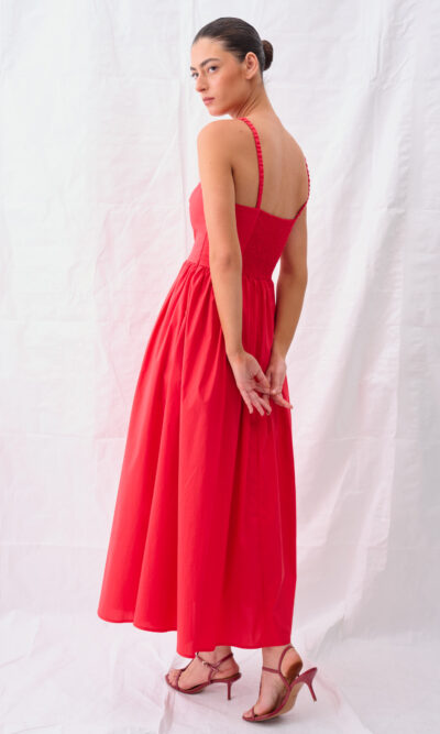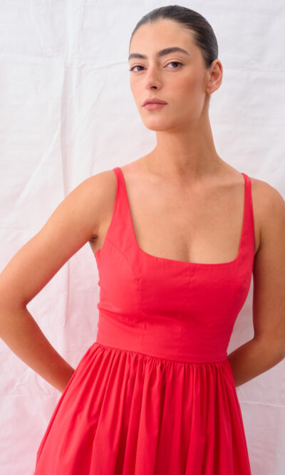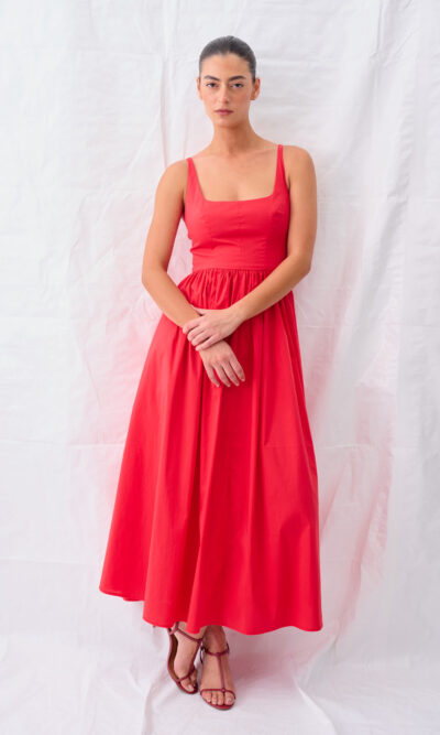 שמלה מכותנה ליקרה, חלק עליון צמוד עם פאנל אלסטי בגב המאפשר מתיחה והתאמה. כתפיות אלסטיות נוחות להתאמה. חצאית פעמון מלא, עם כיסים נסתרים.