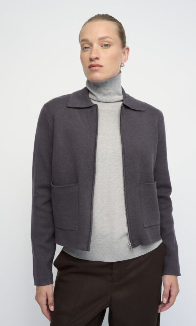קרדיגן סרוג, עם כיסים מרובעים וסגירת רוכסן בחזית.