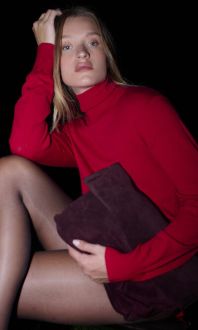סריג ויסקוזה בצללית קלאסית קרובה לגוף. עם צוארון גולף ריב מתקפל.