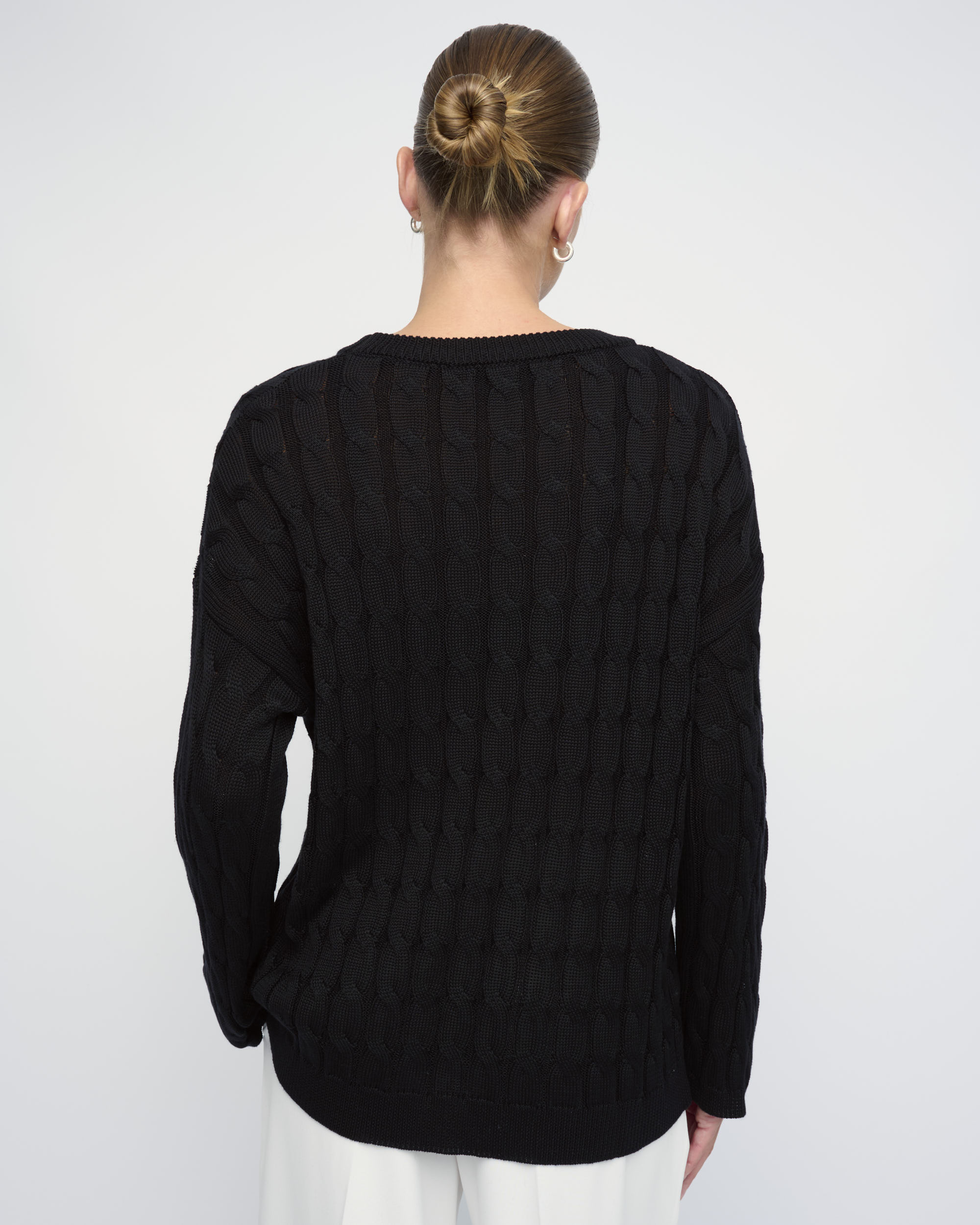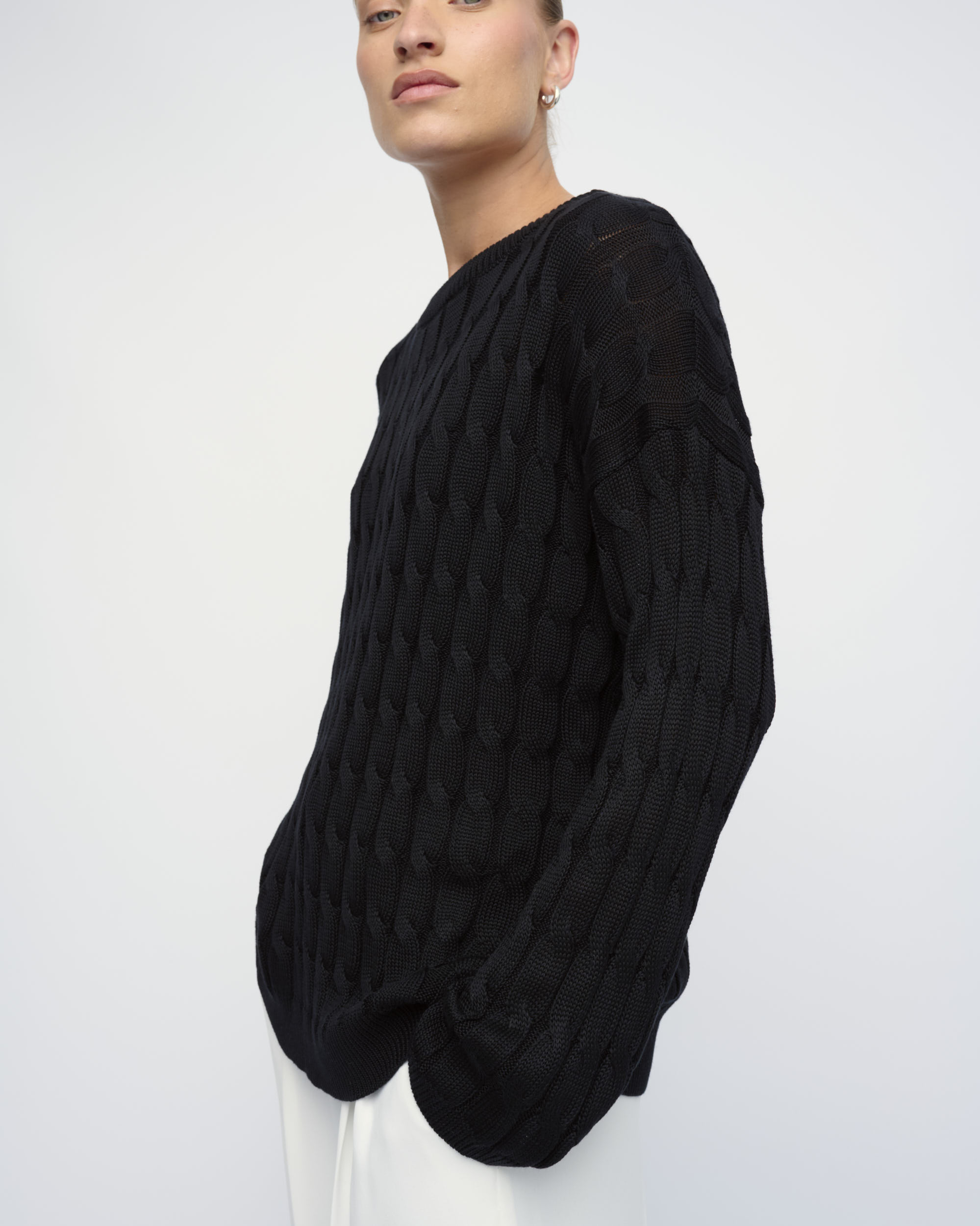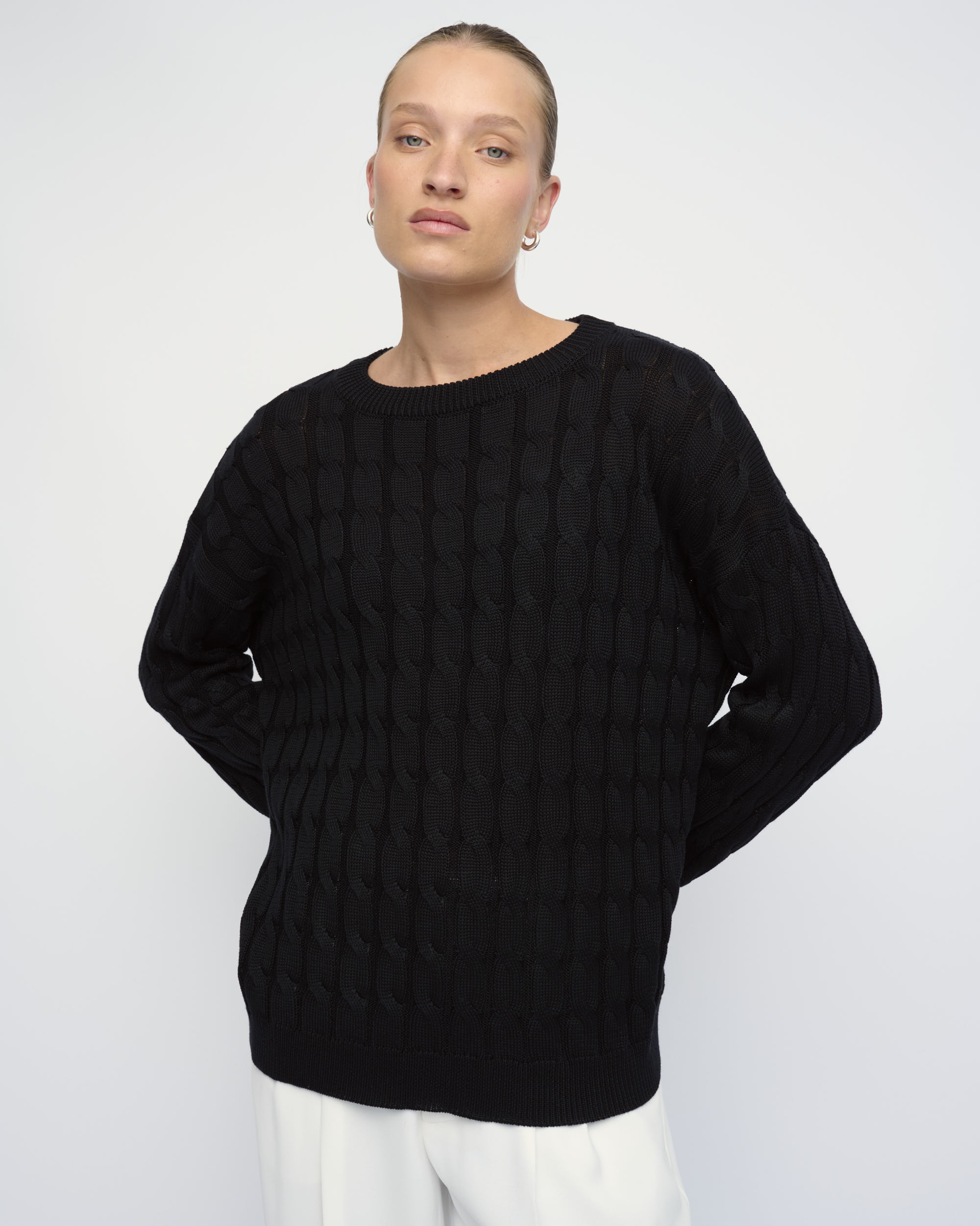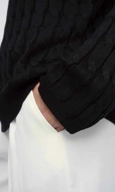 סריג ליוסל סרוג בדוגמת צמות, צללית רחבה. מחשוף עגול.