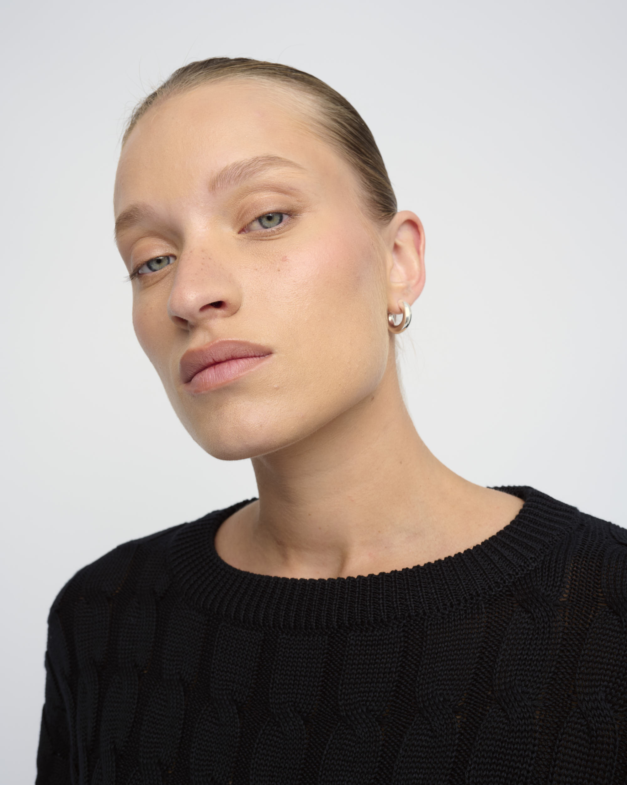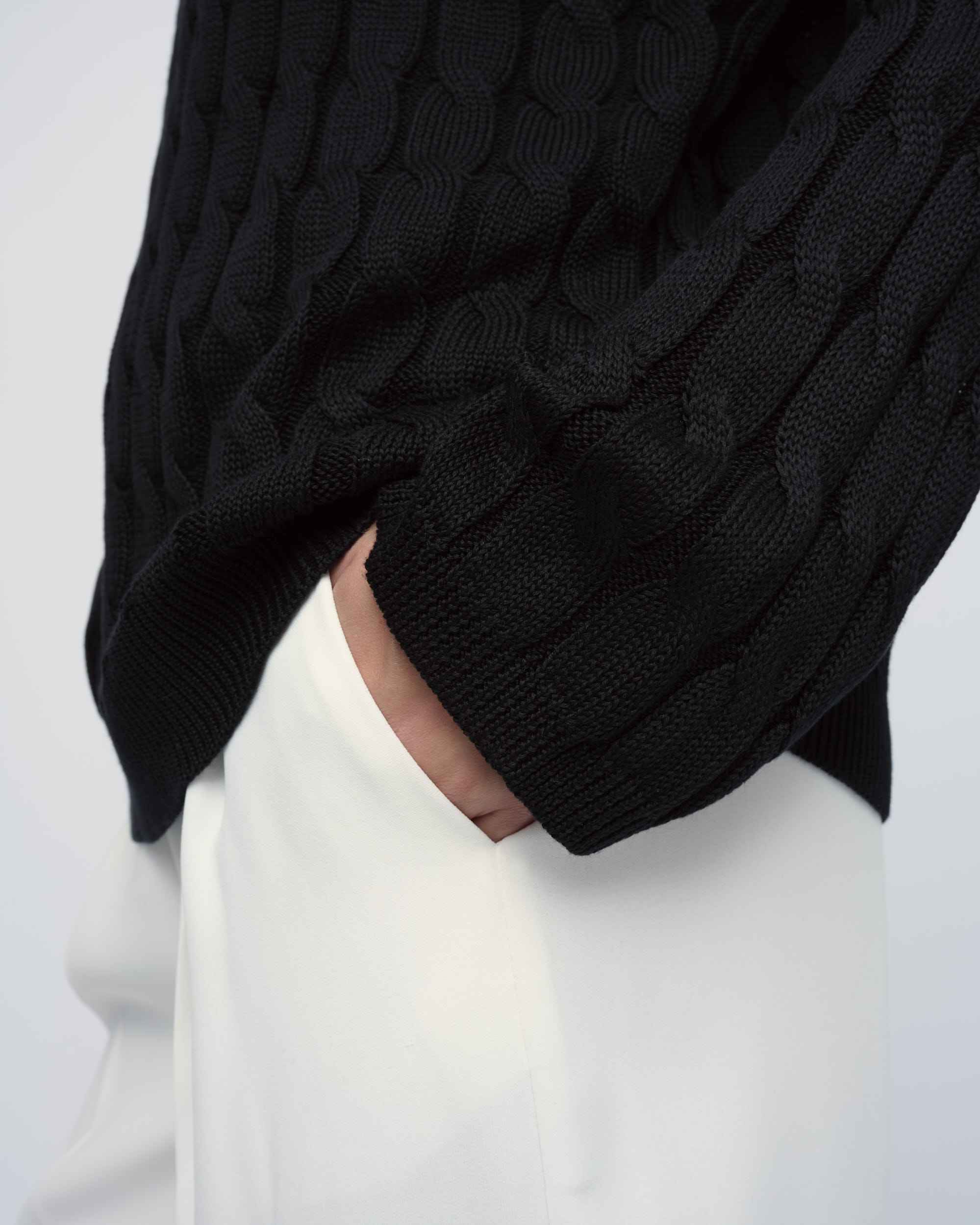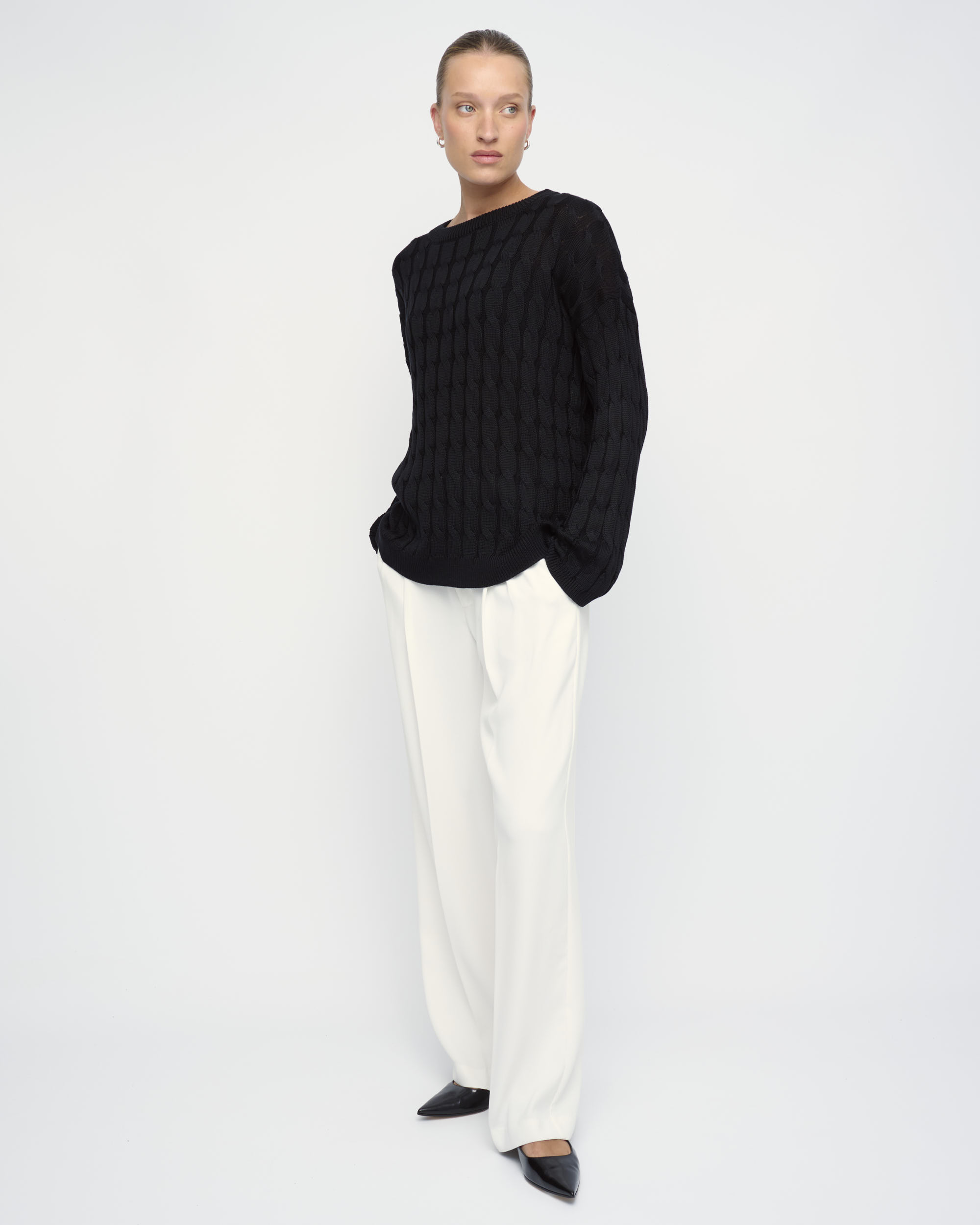 סריג ליוסל סרוג בדוגמת צמות, צללית רחבה. מחשוף עגול.