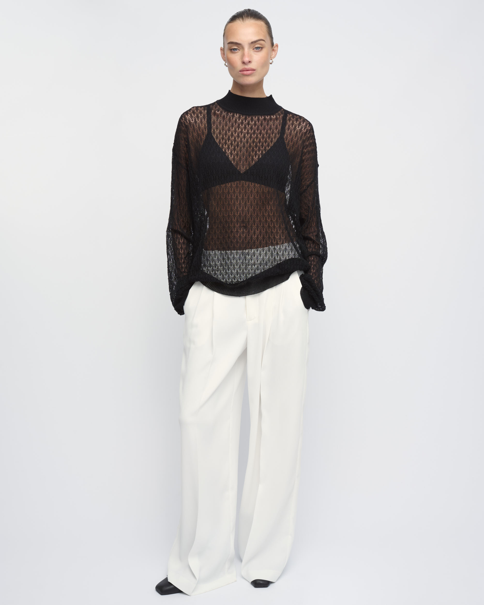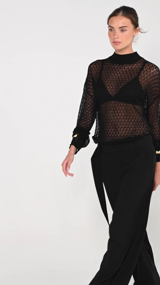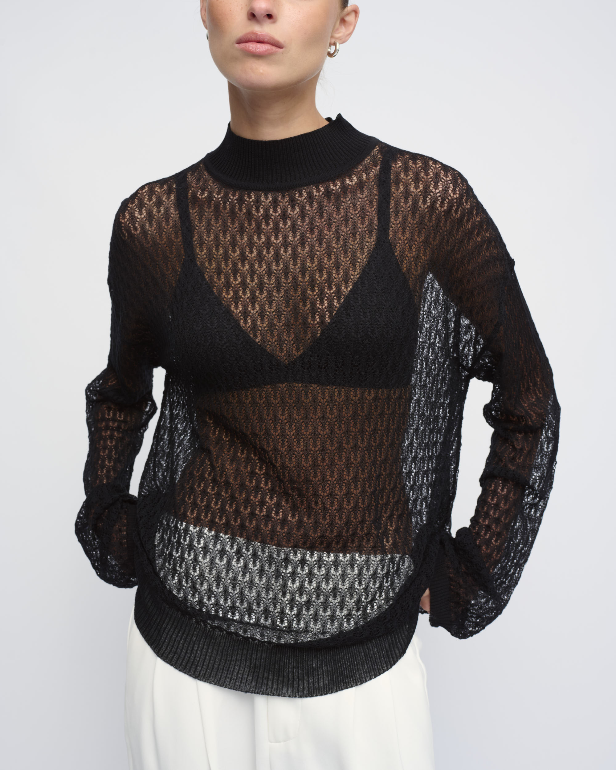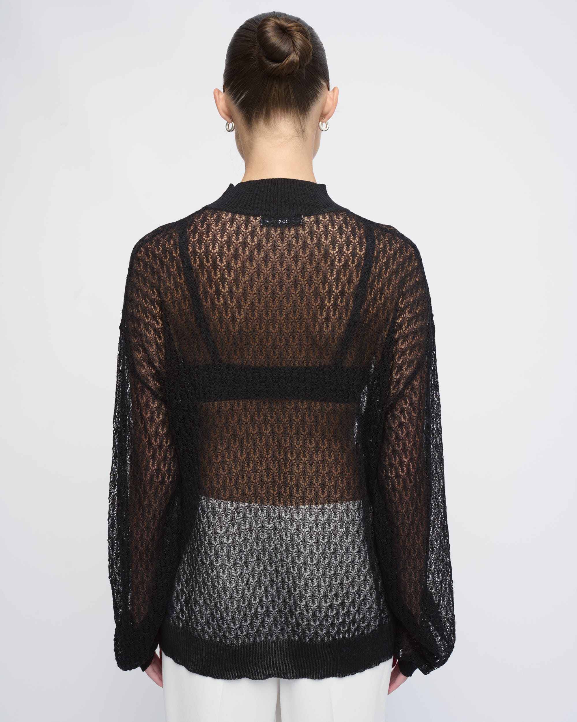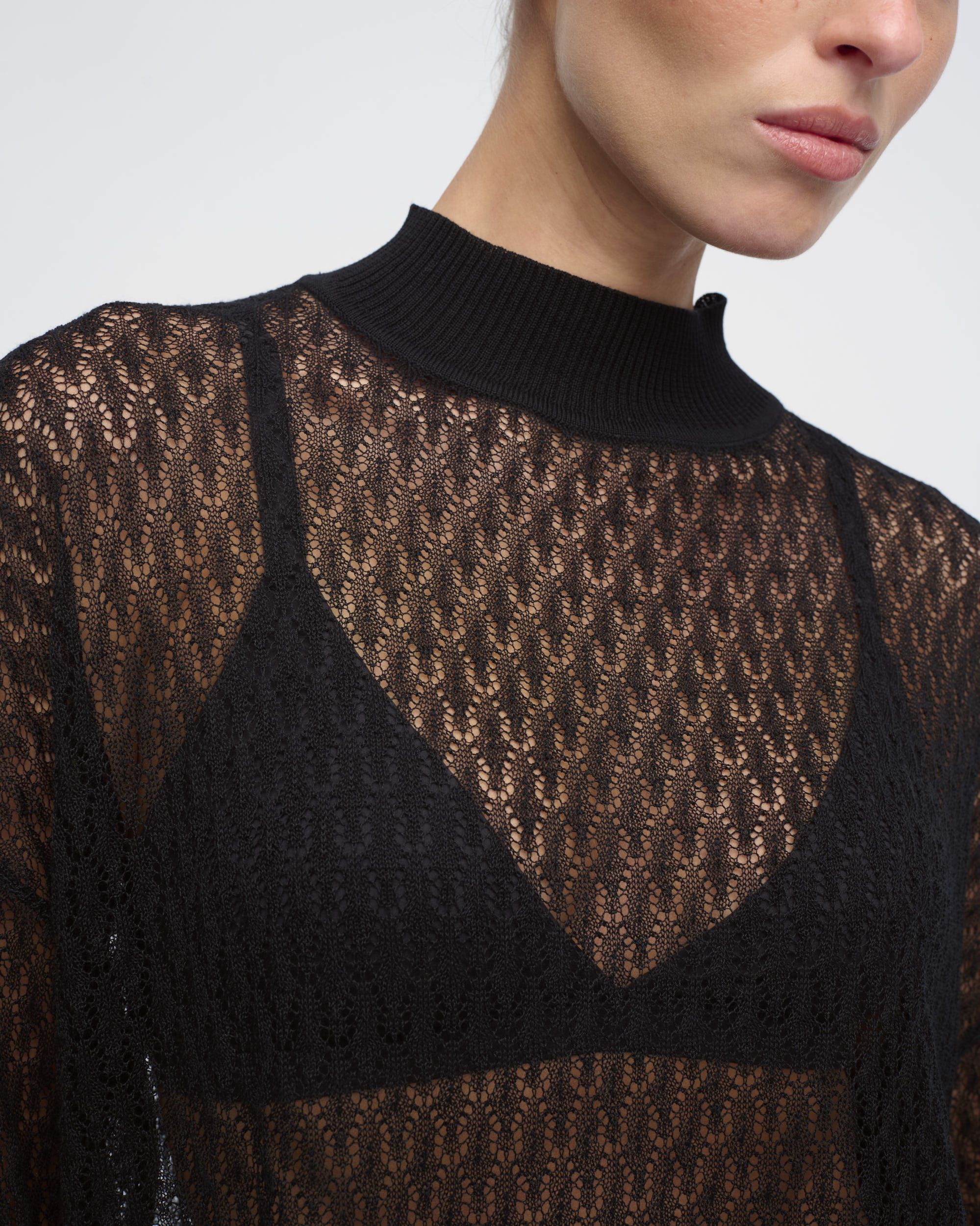 סריג תחרה מטנסל. צללית רחוקה מהגוף. עם צוארון גולף.