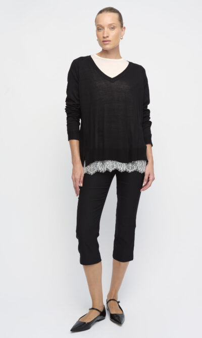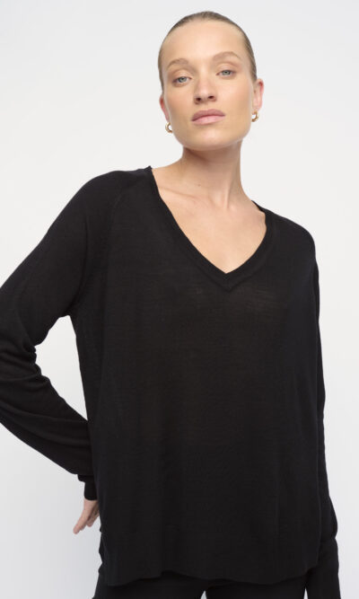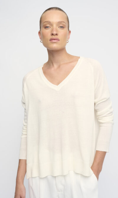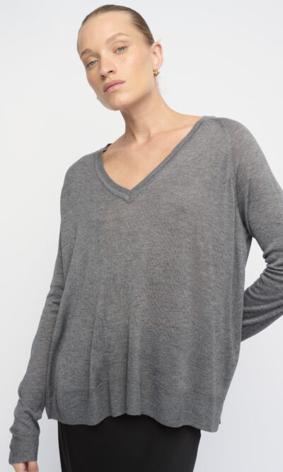 סריג ויסקוזה דק, צללית רחוקה מהגוף. עם מחשוף וי.