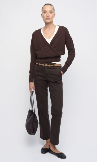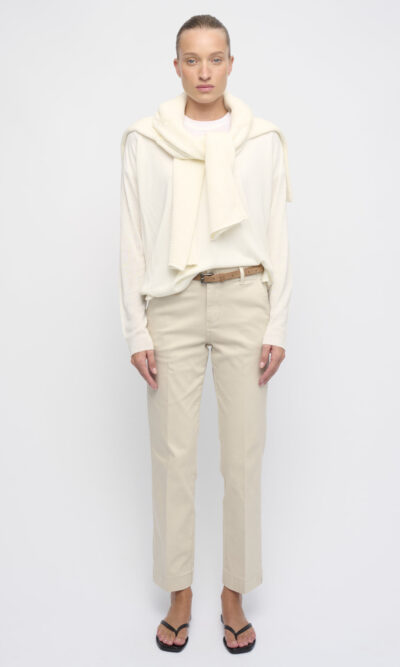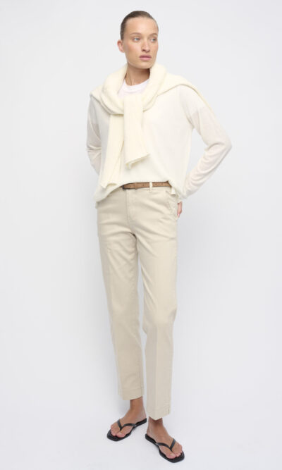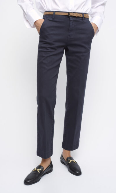 מכנסיים מכותנה ליקרה, צללית קרובה לגוף, רגל ישרה, אורך קרסול. עם כיסי צד וחגורה מושחלת בקו המותן.