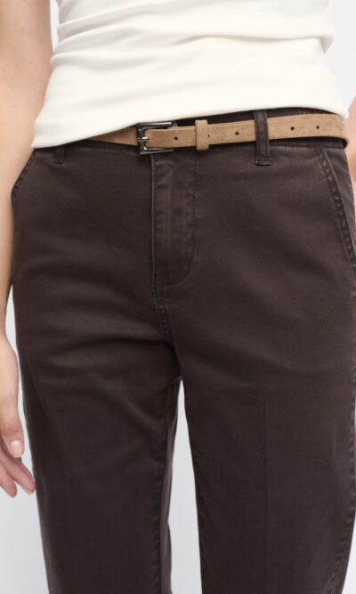 מכנסיים מכותנה ליקרה, צללית קרובה לגוף, רגל ישרה, אורך קרסול. עם כיסי צד וחגורה מושחלת בקו המותן.