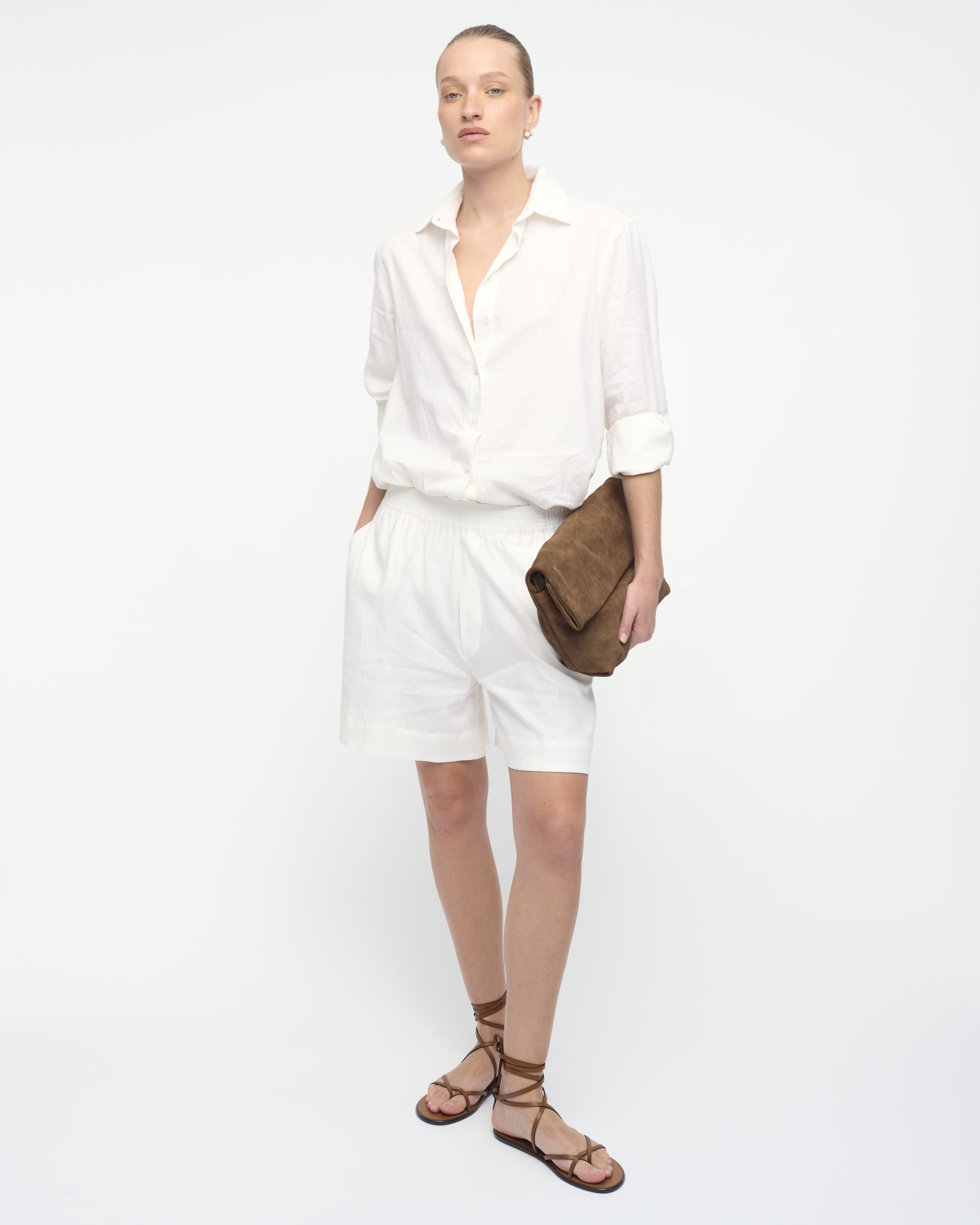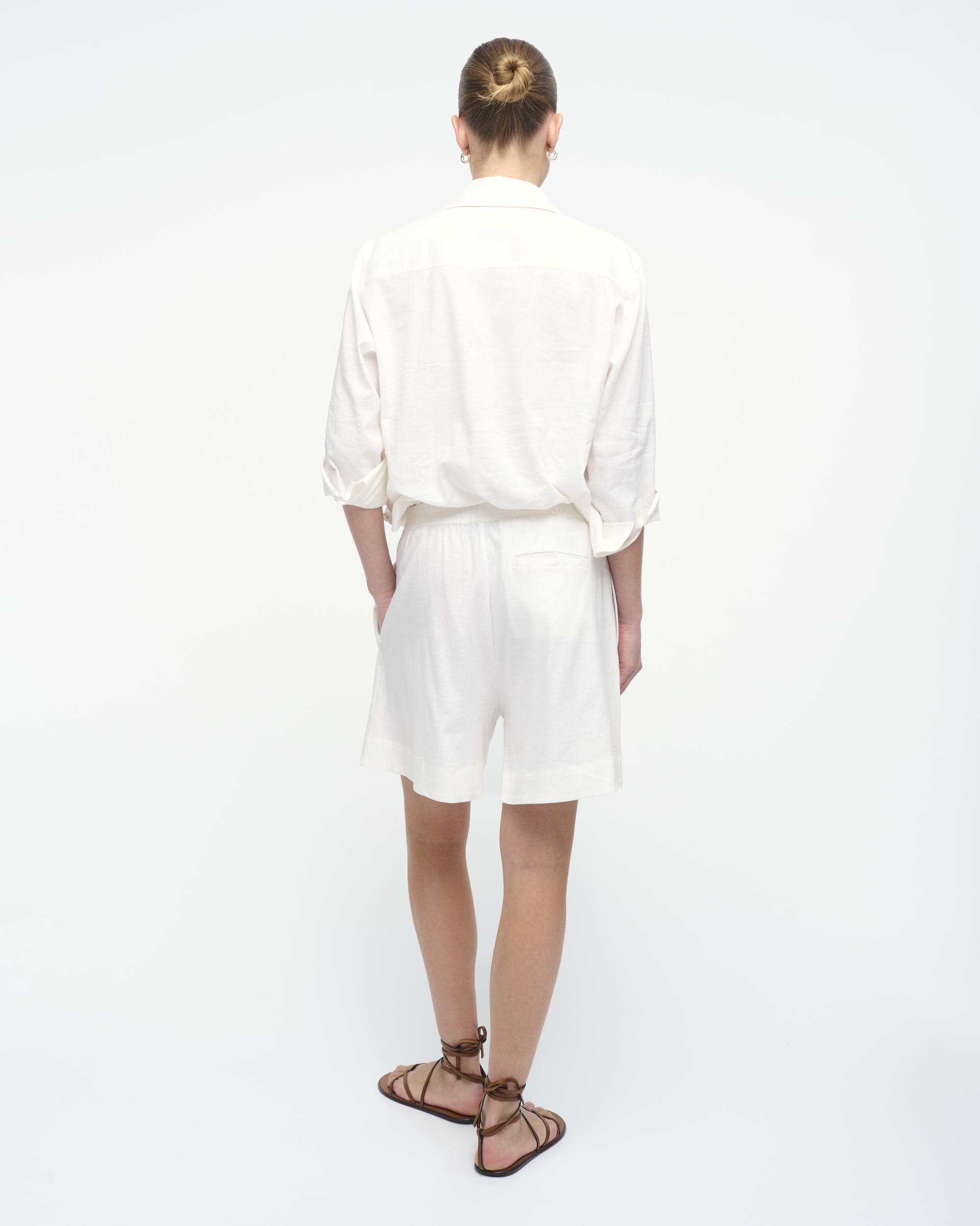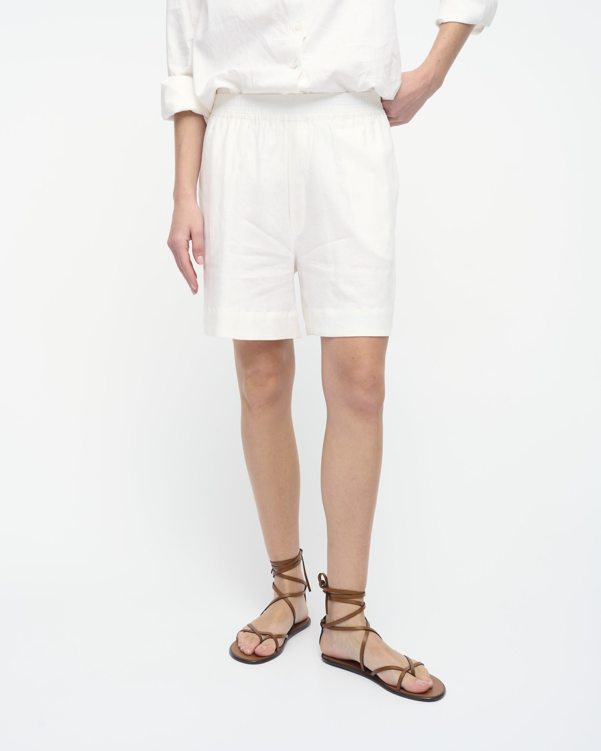 מכנסיים קצרים מפשתן ויסקוזה, צללית רחבה, גומי בחגורת המותן, עם כיסי צד.