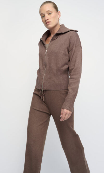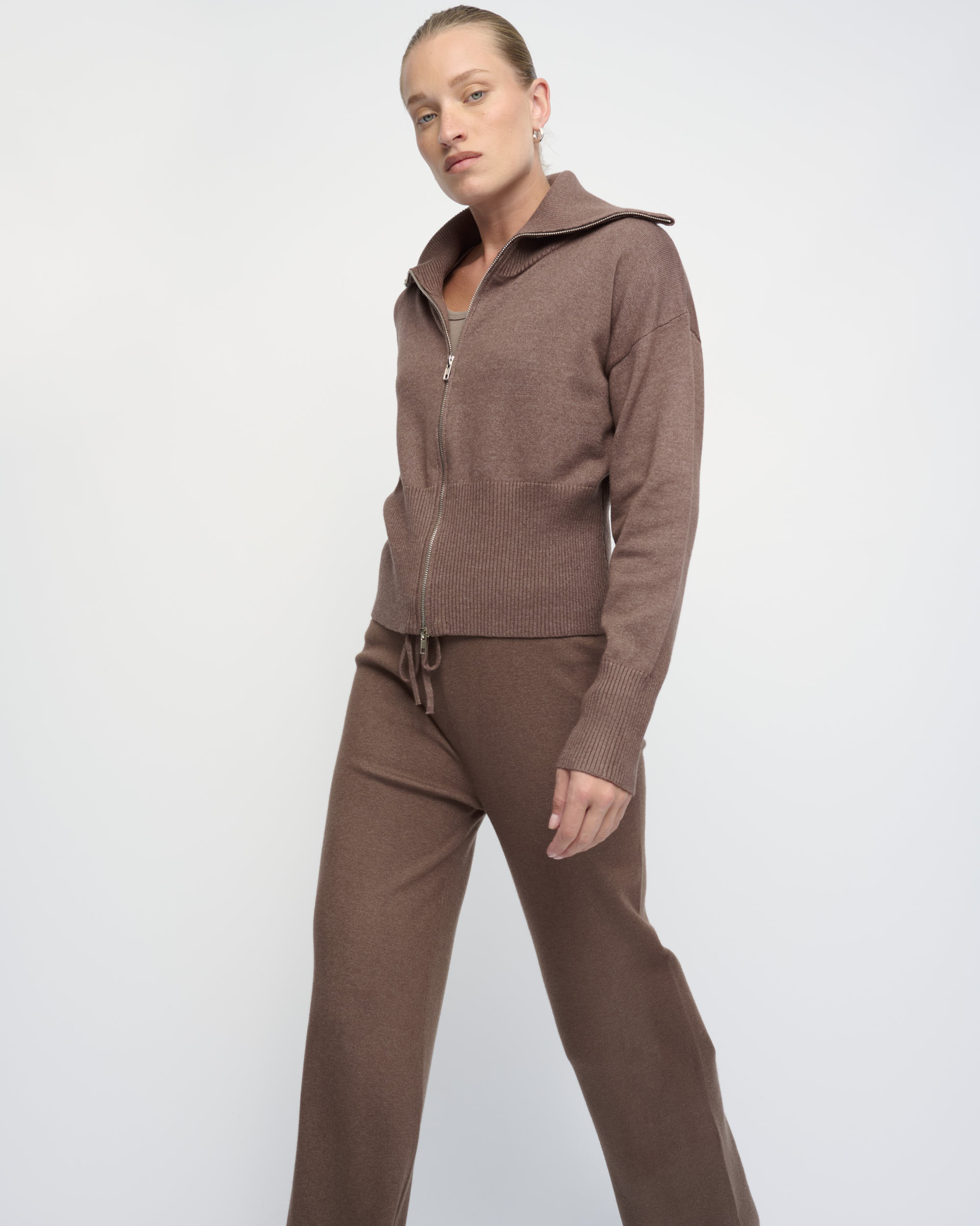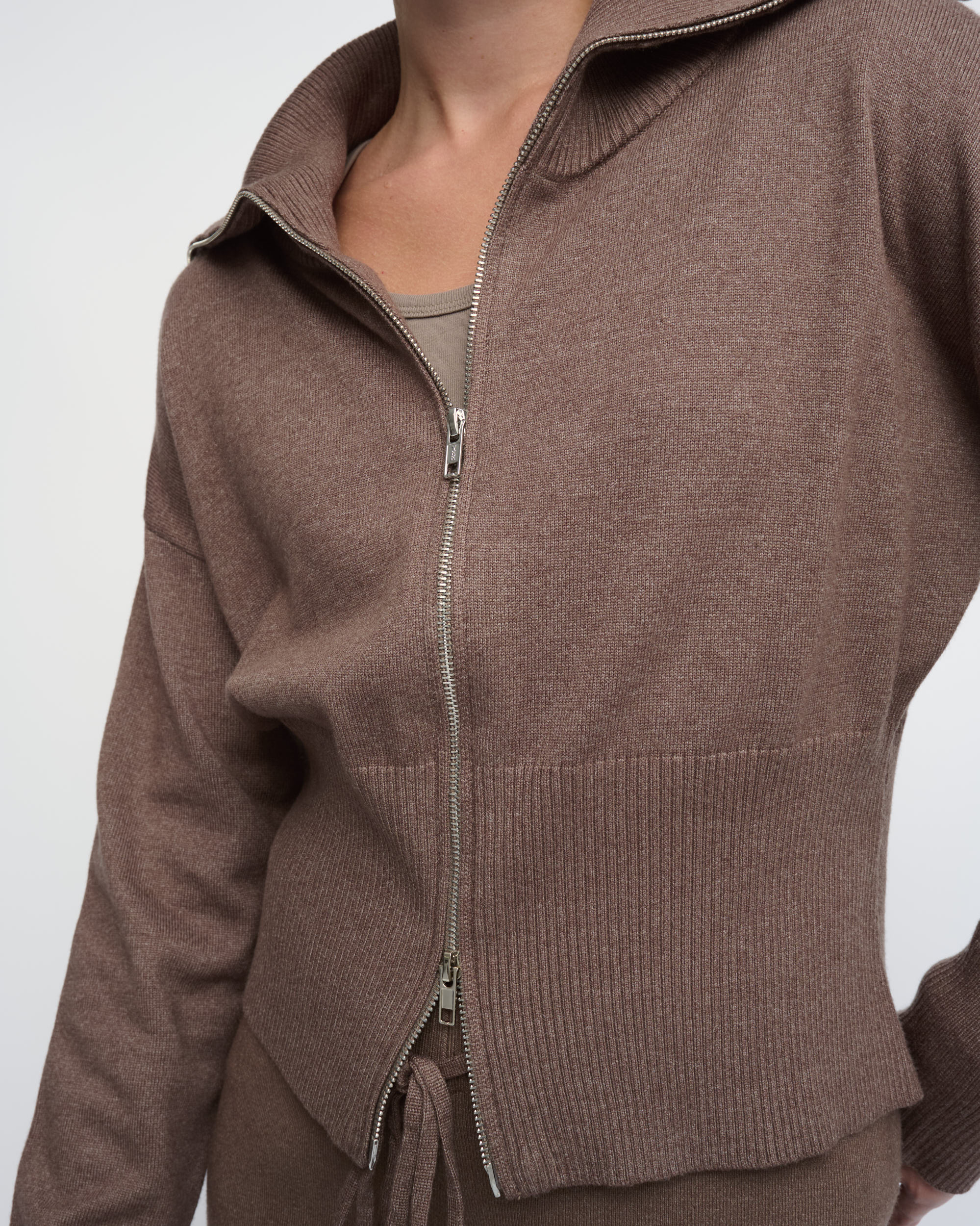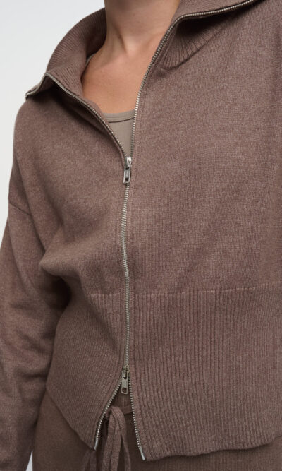 קרדיגן קצר מסריג ויסקוזה מעורב. צללית נינוחה, נאספת בקו המותן. עם צוארון גדול וסגירת רוכסן.