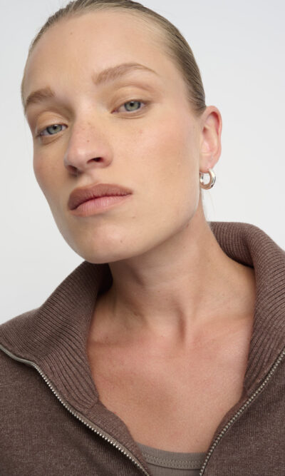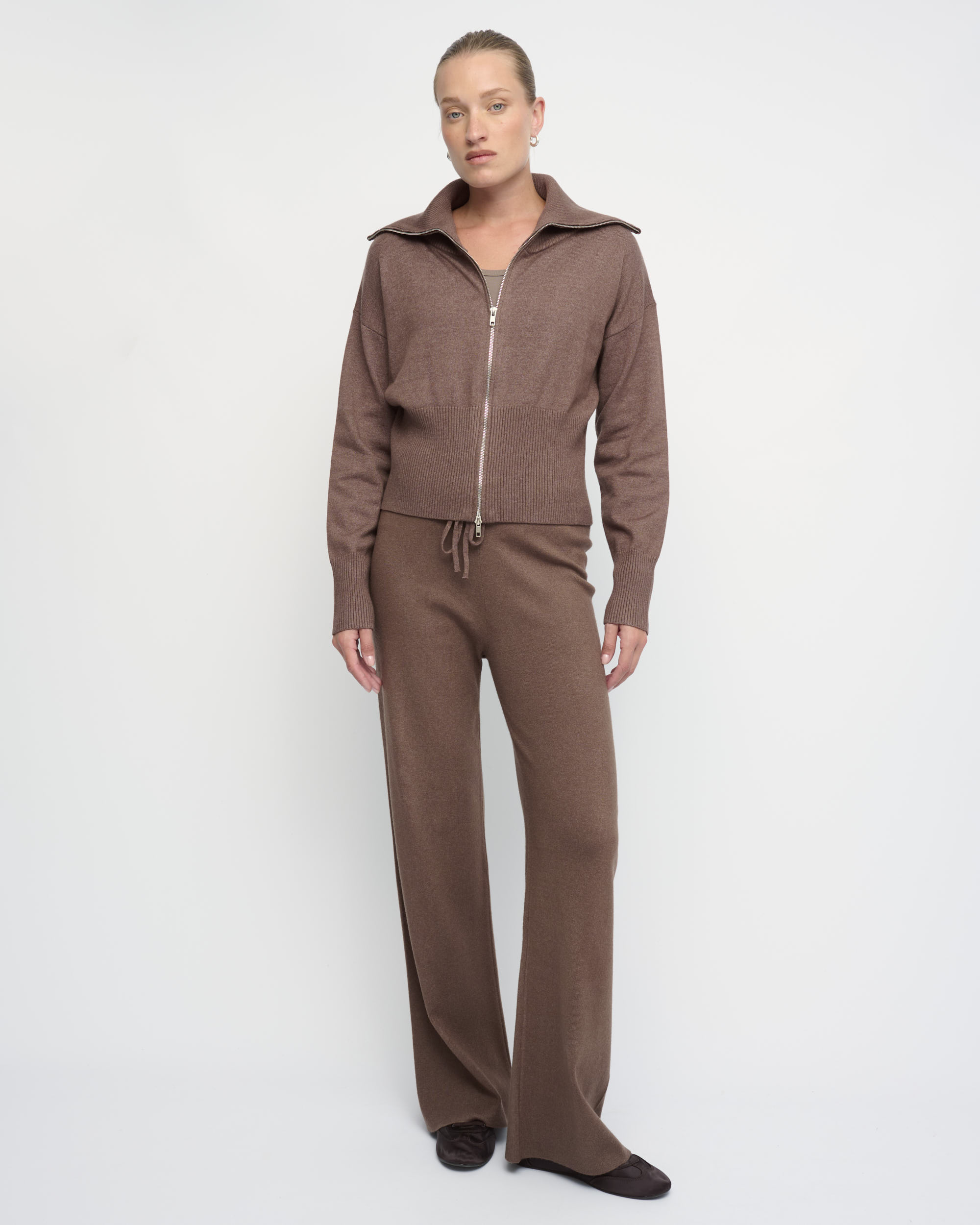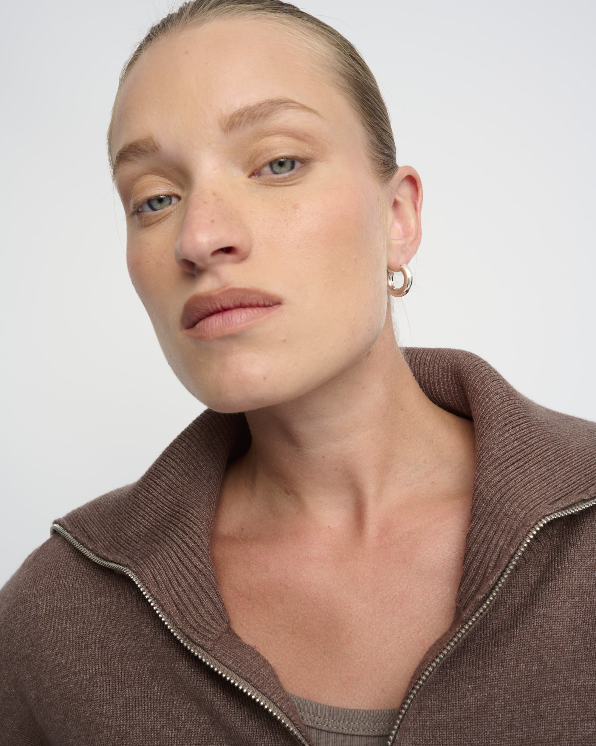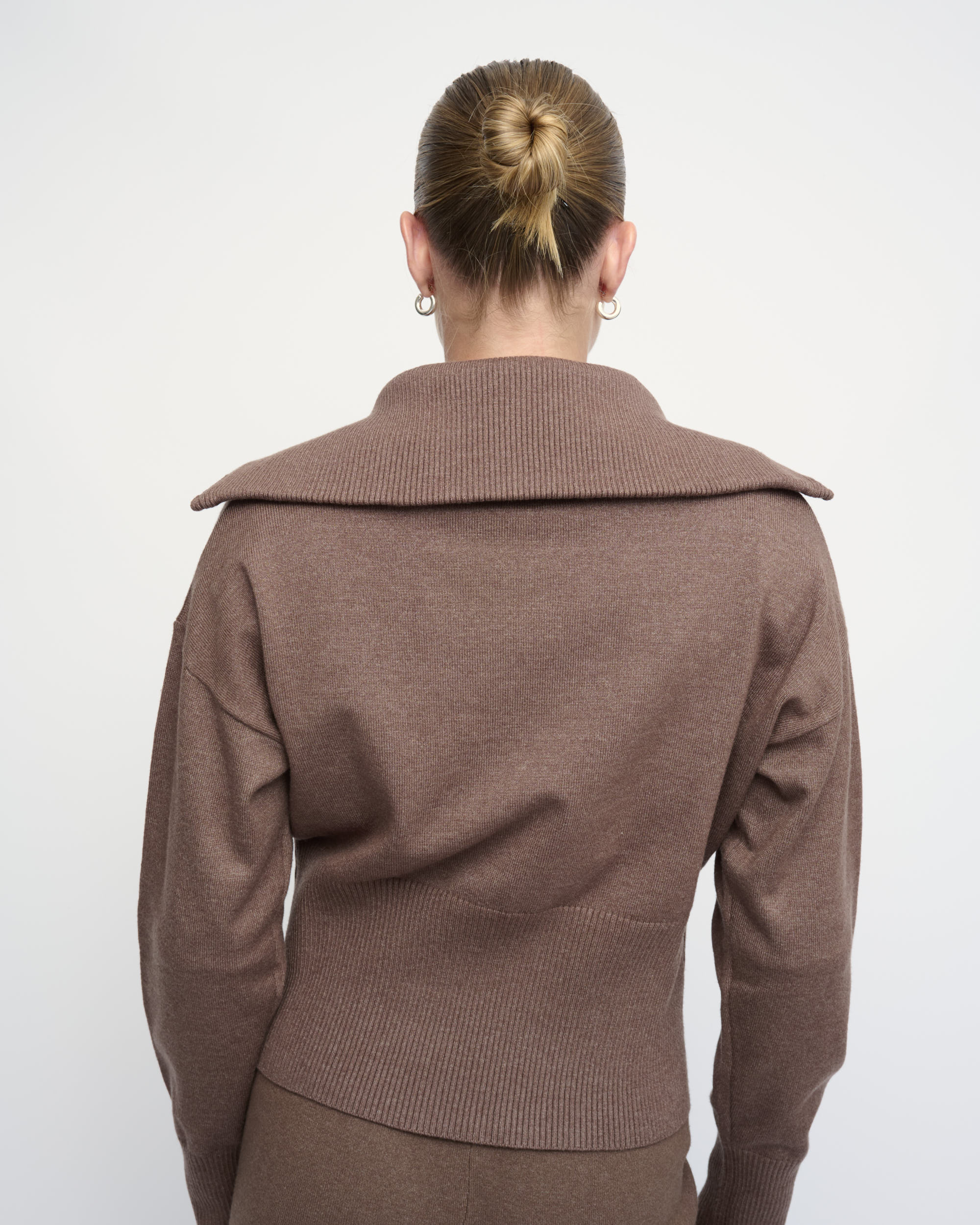 קרדיגן קצר מסריג ויסקוזה מעורב. צללית נינוחה, נאספת בקו המותן. עם צוארון גדול וסגירת רוכסן.