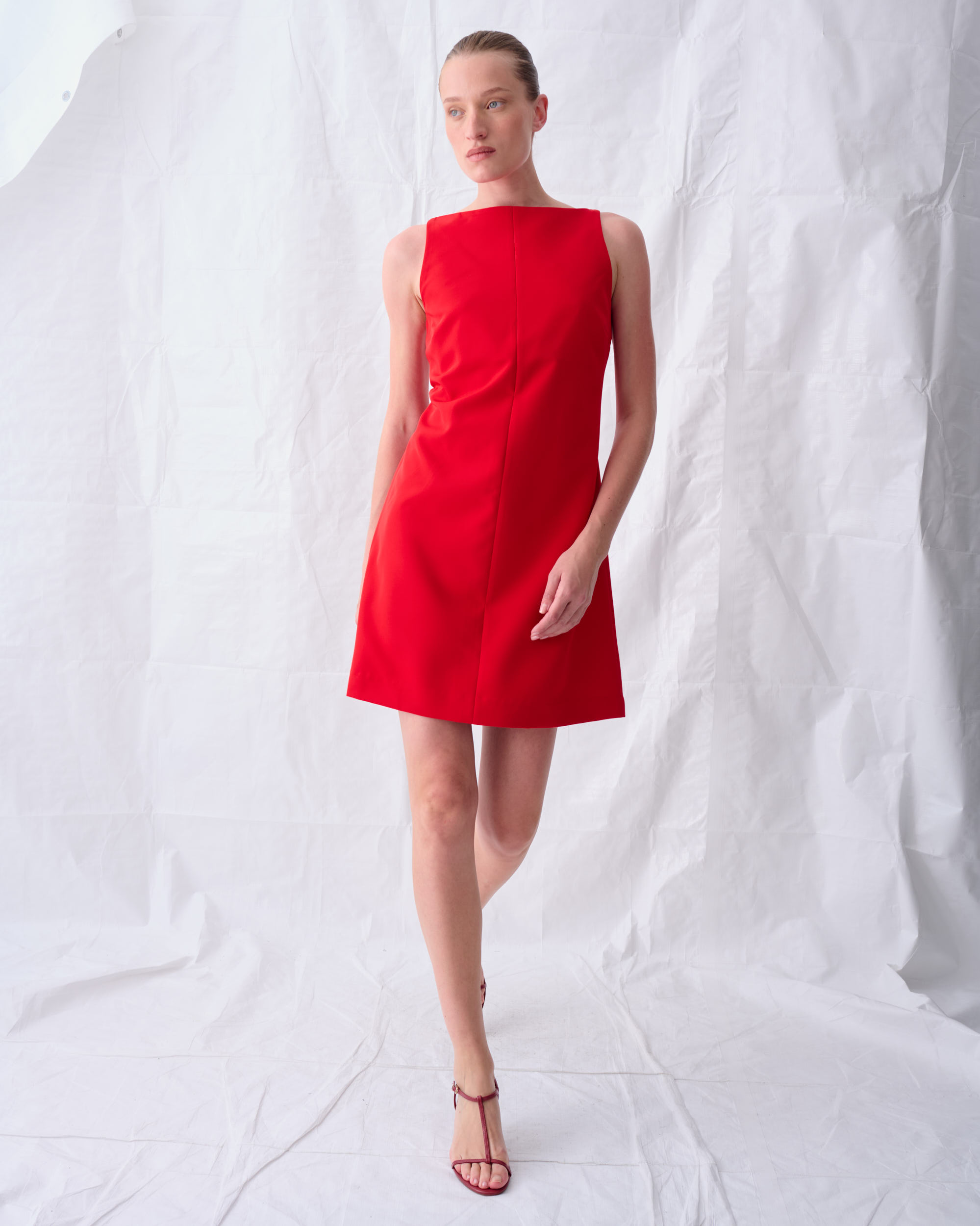 שמלה בצללית קרובה לגוף. מחשוף סירה ומחשוף וי בגב. סגירת רוכסן בגב.