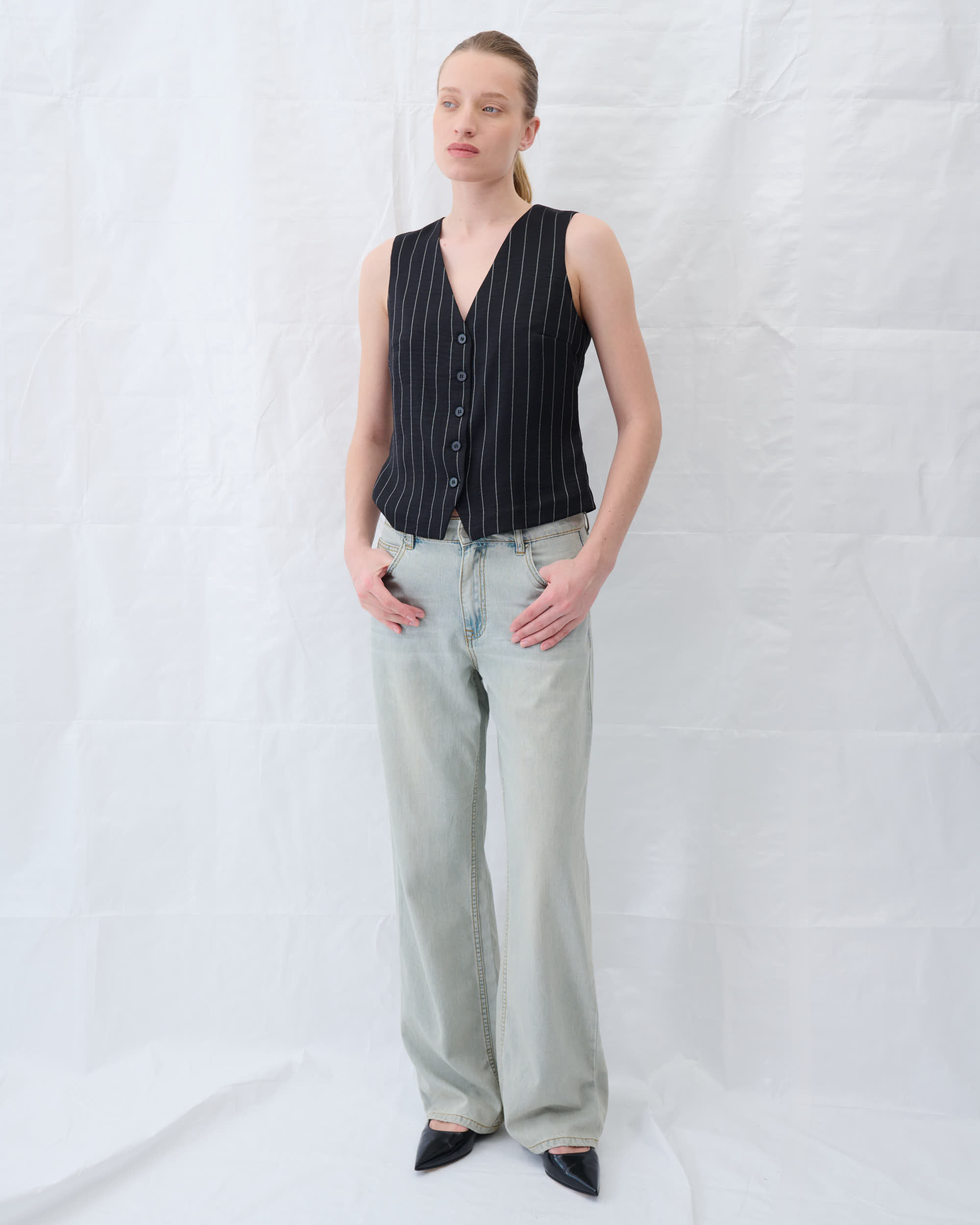 וסט מאריג קרפ בדוגמת פסי סיכה. סגירת כפתורים בחזית.