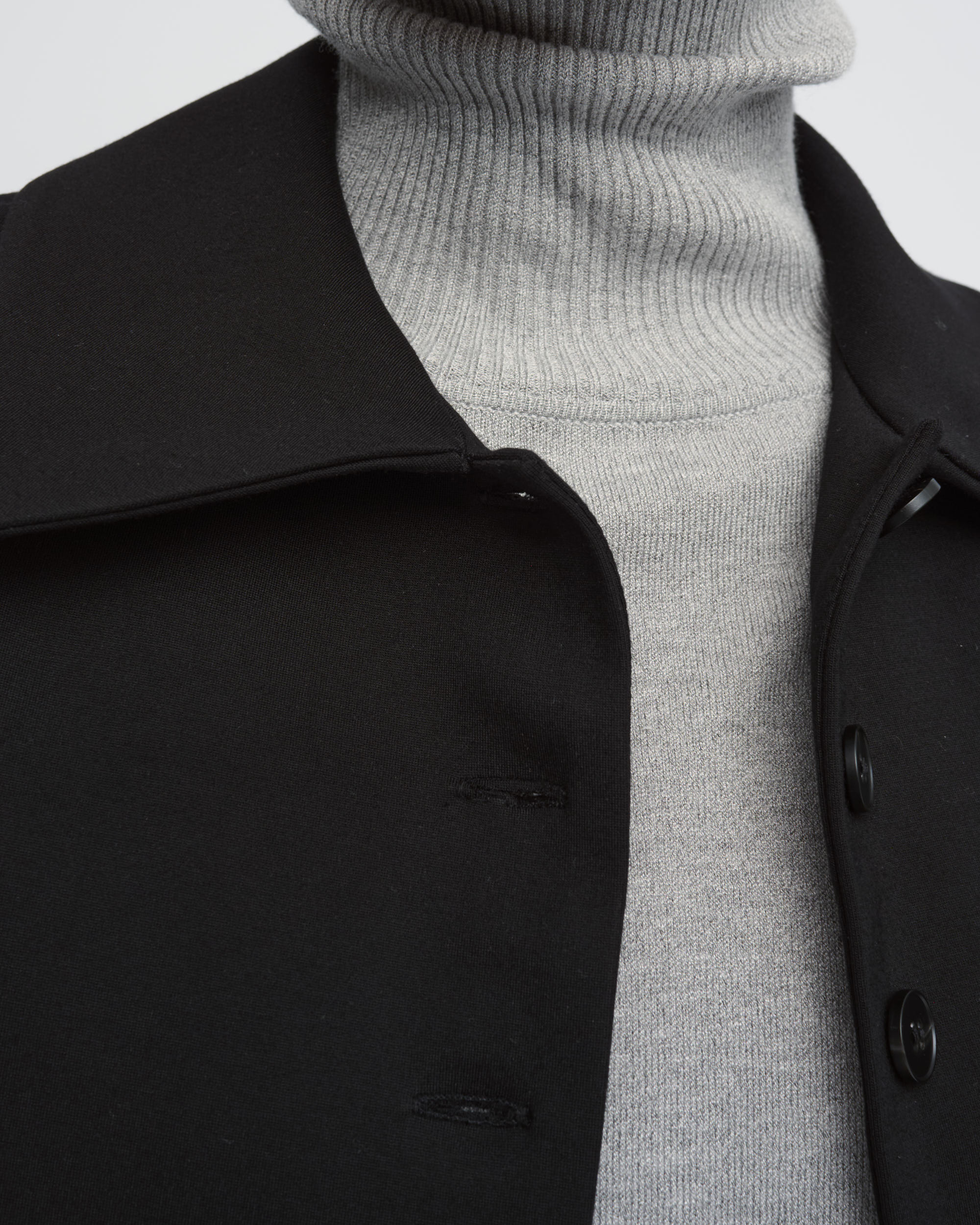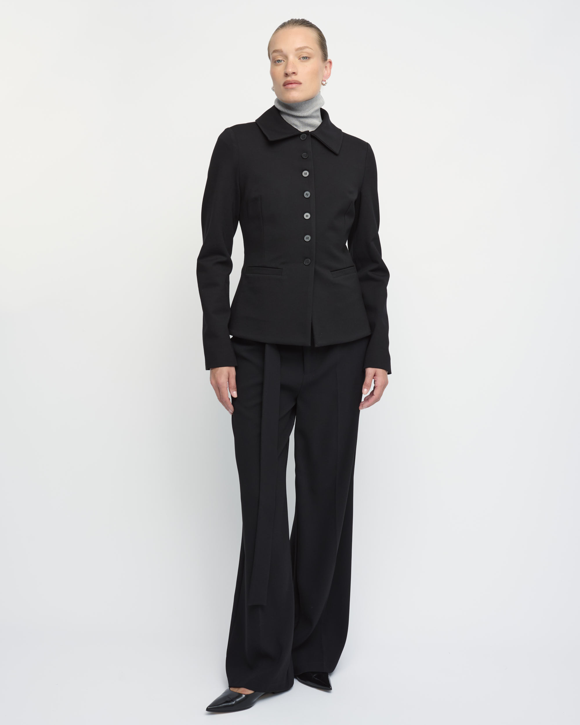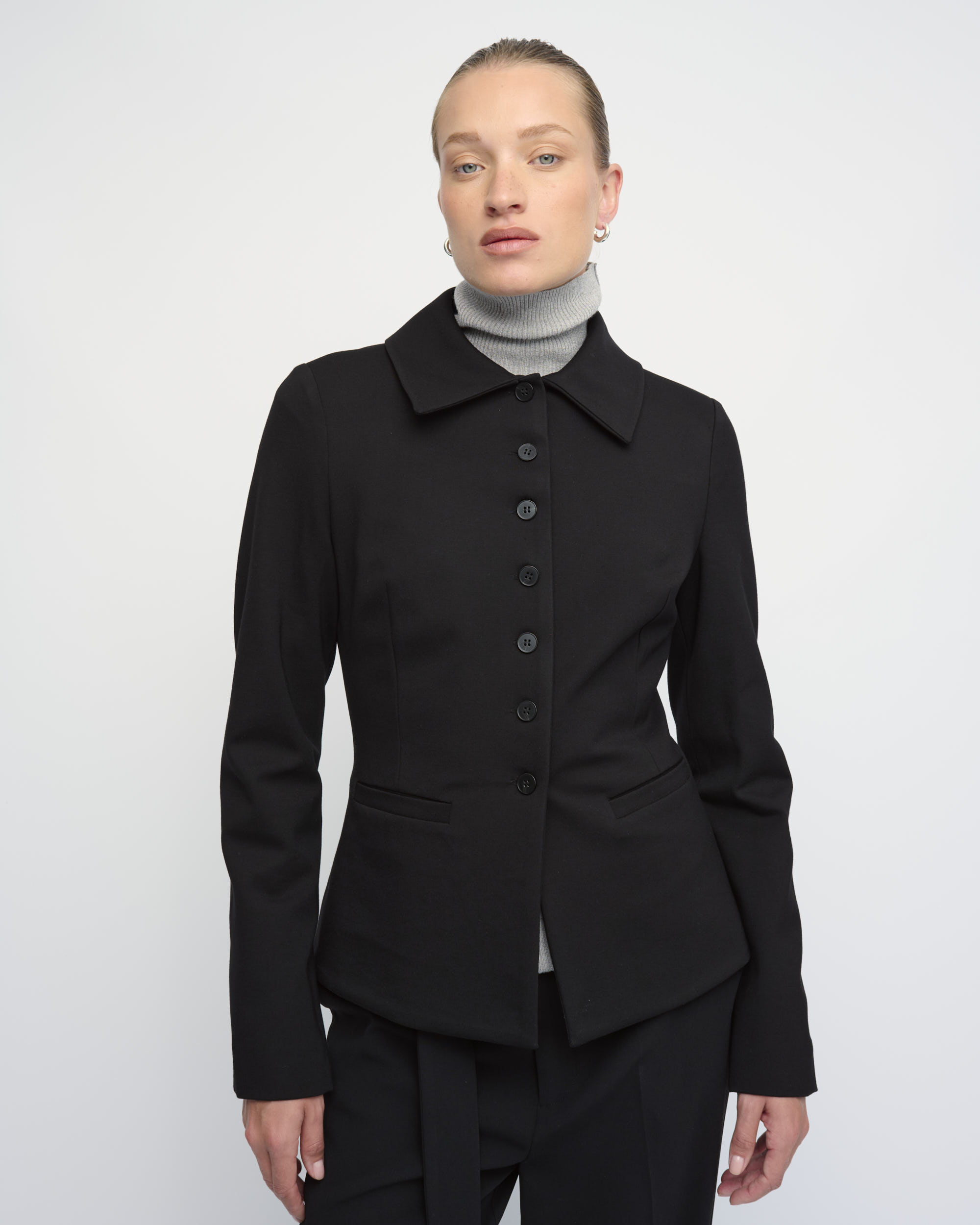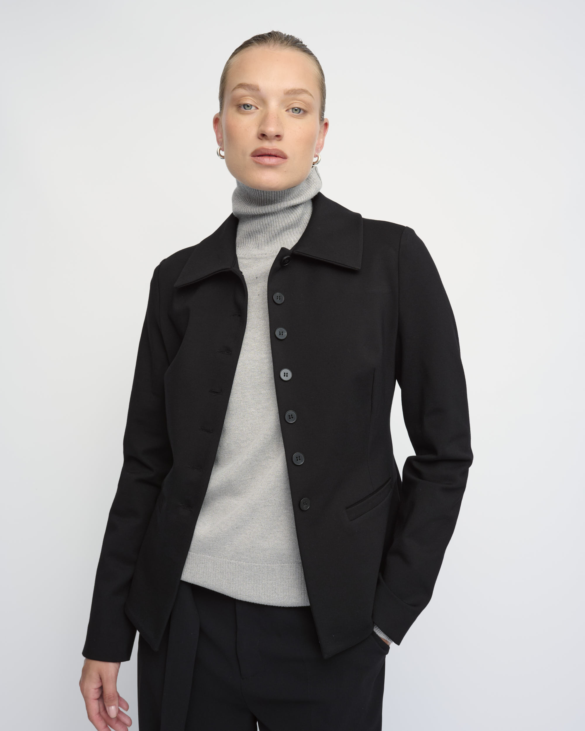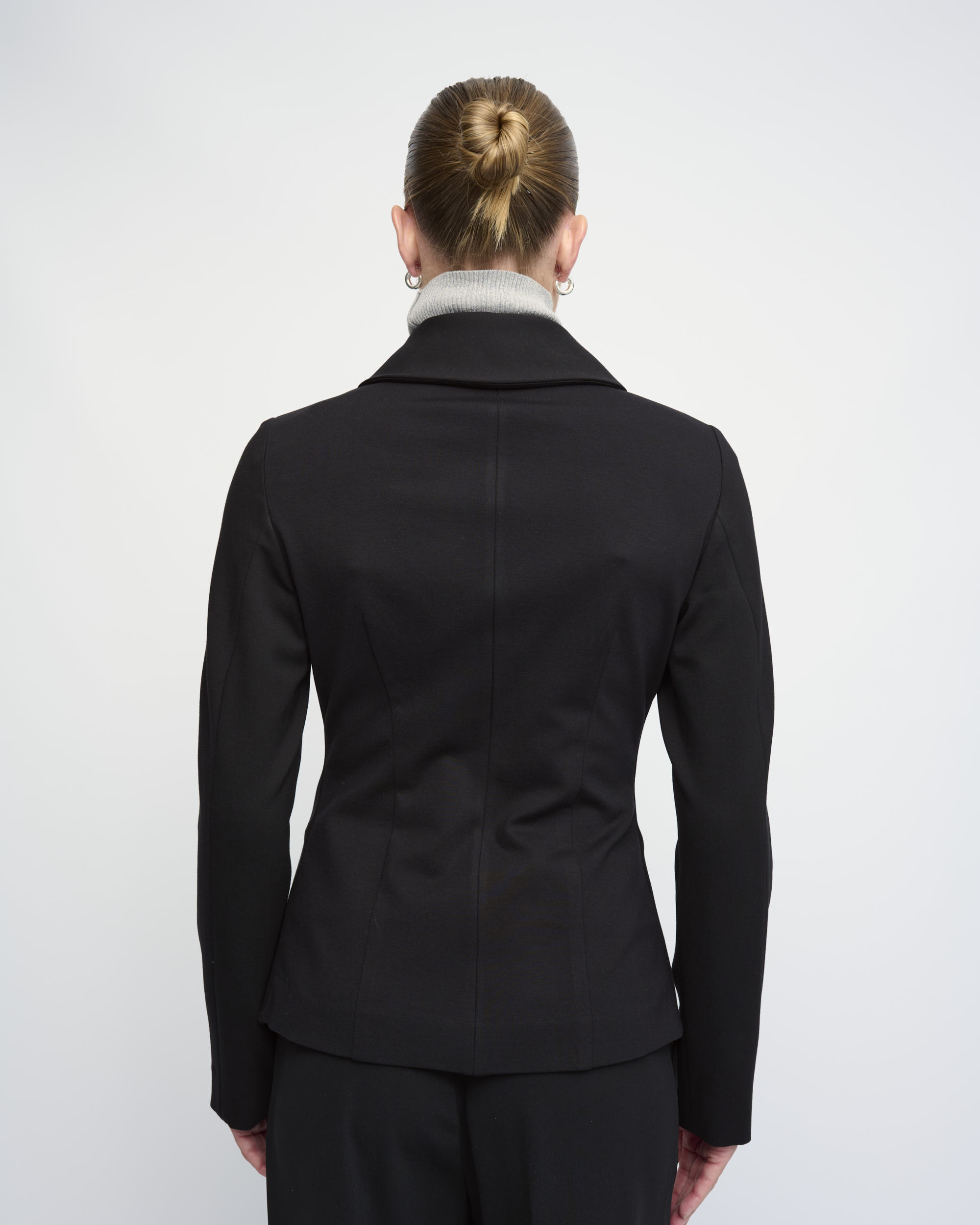ג’קט מסריג ג’רסי. צללית שעון חול צמודה. צוארון גברי, כיסי שפה וסגירת כפתורים בחזית.