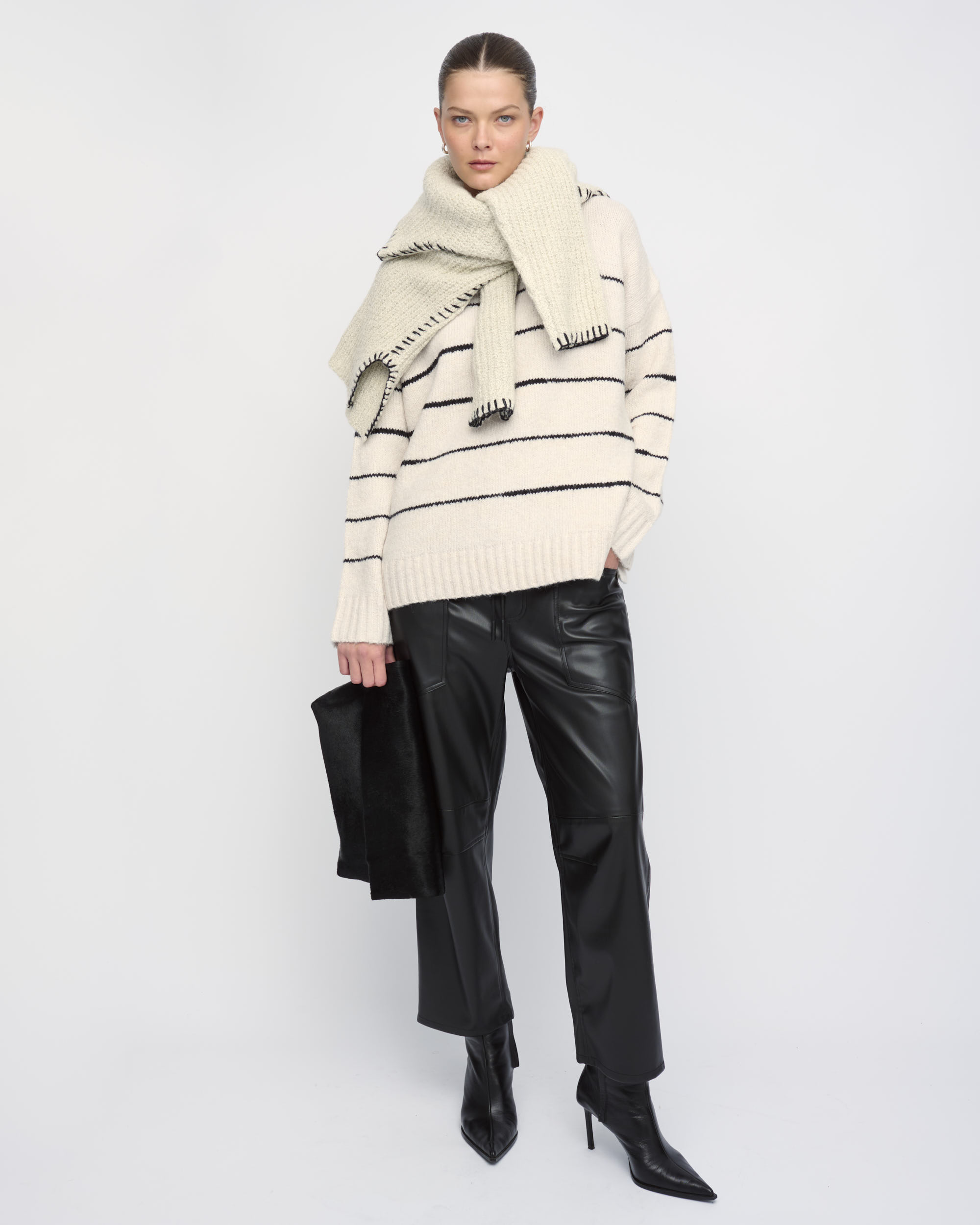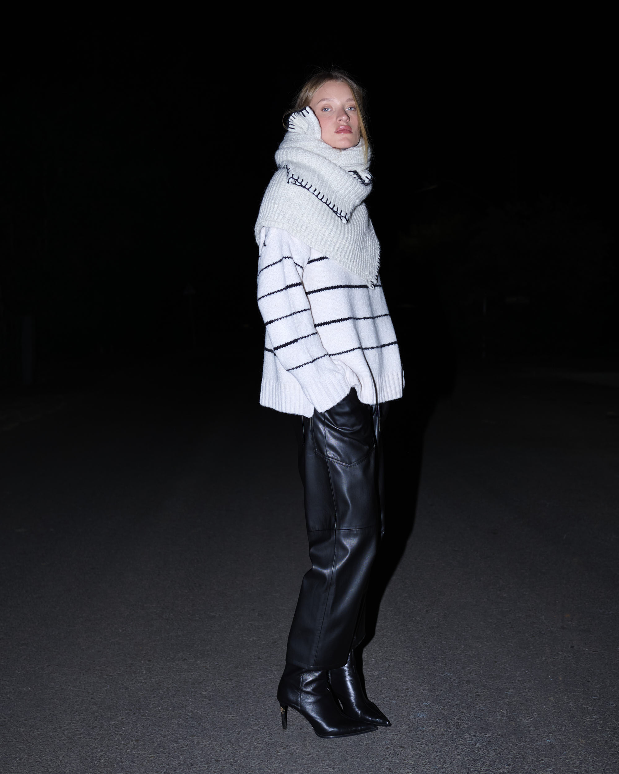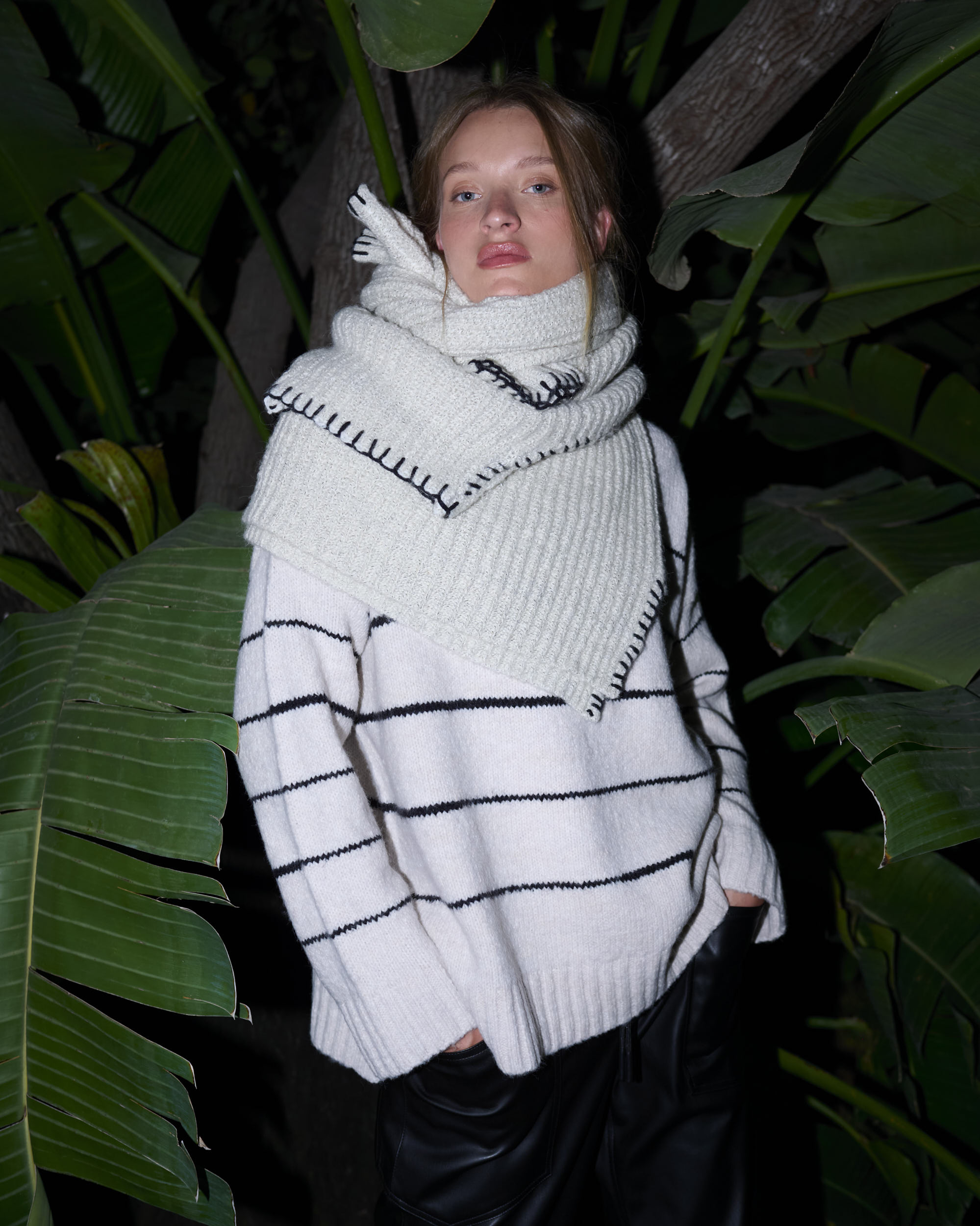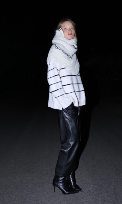 דוגמנית 176 ס”מ, לובשת מידה OS • הרכב בד 53% אקריליק, 32% כותנה, 14% פוליאסטר, 1% ספנדקס