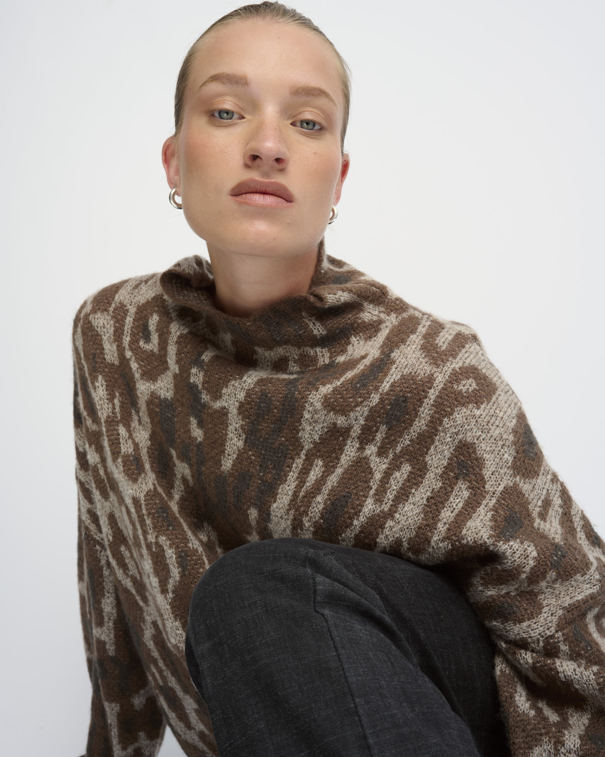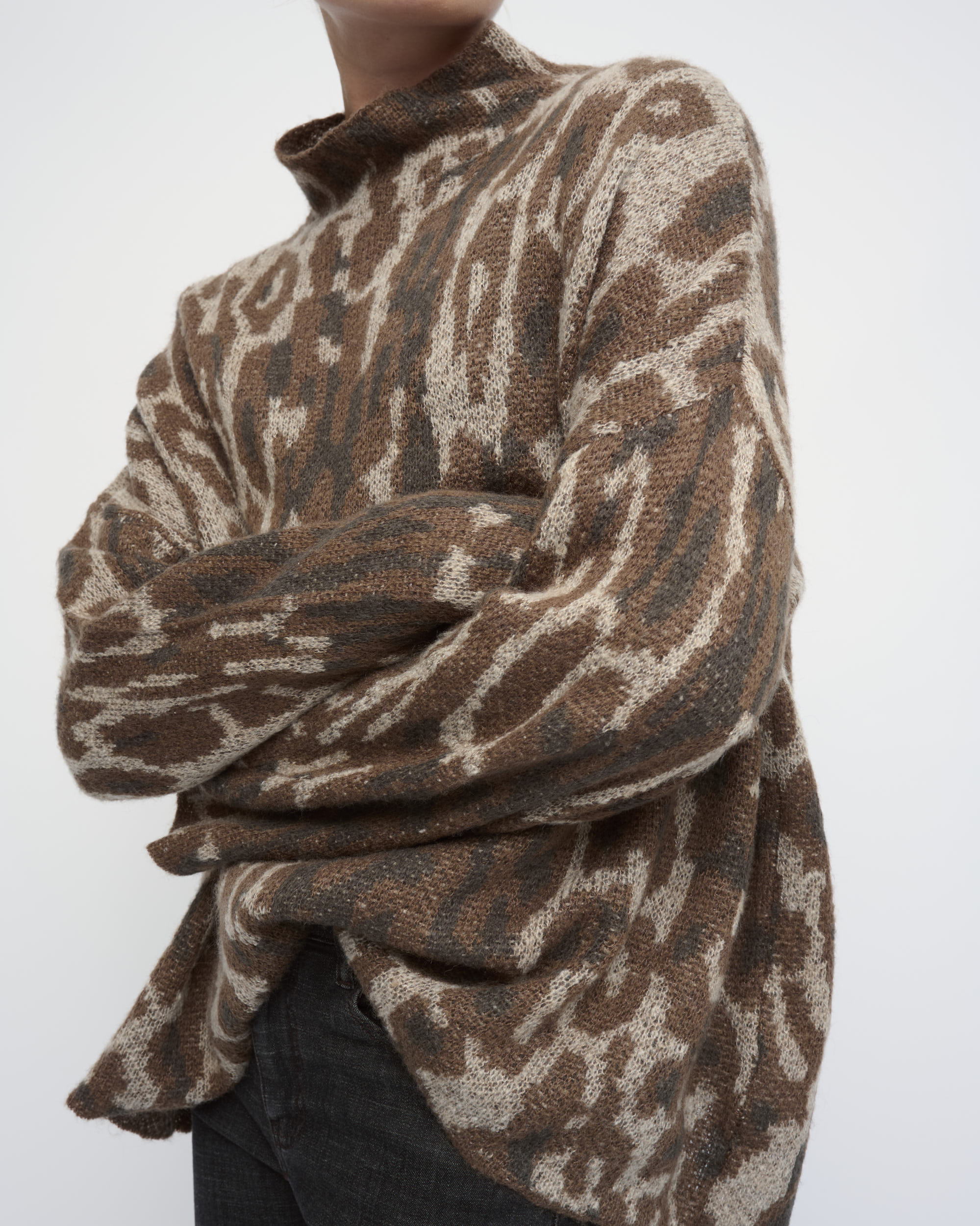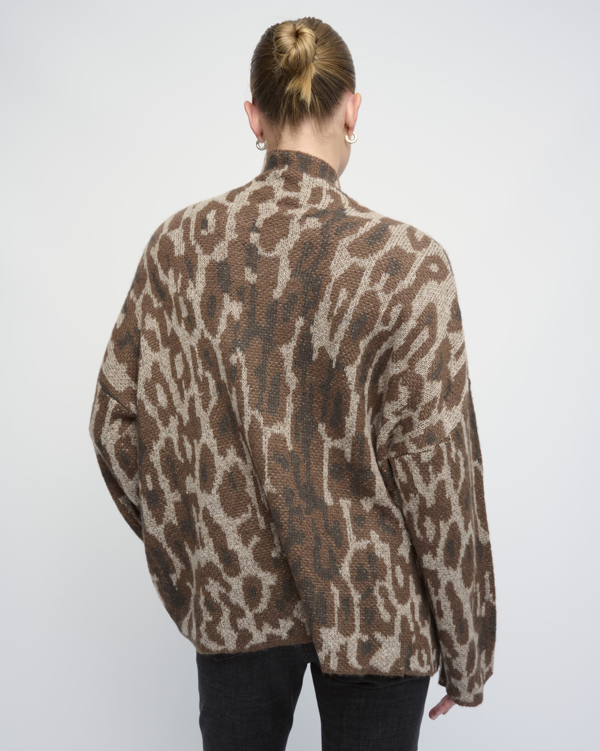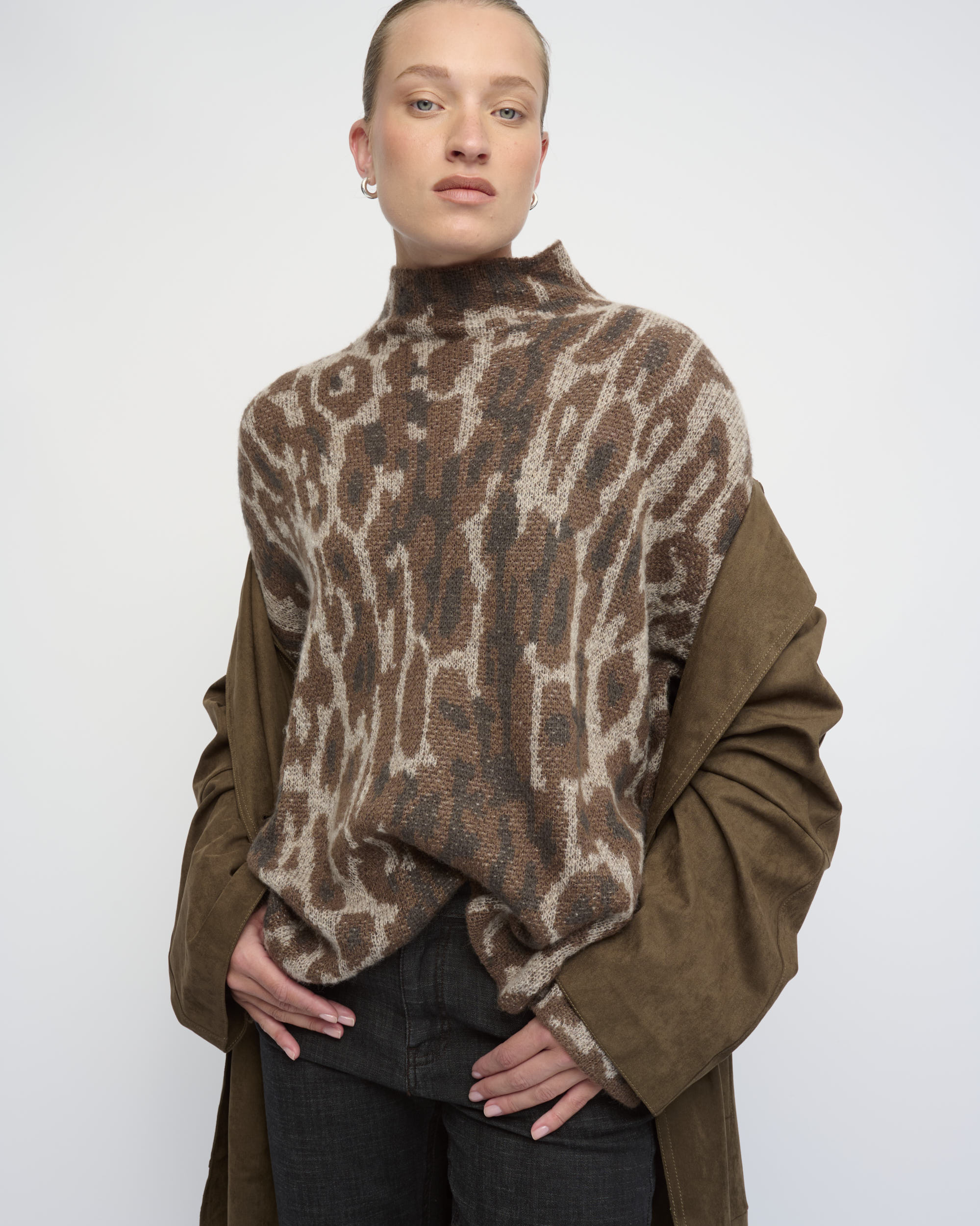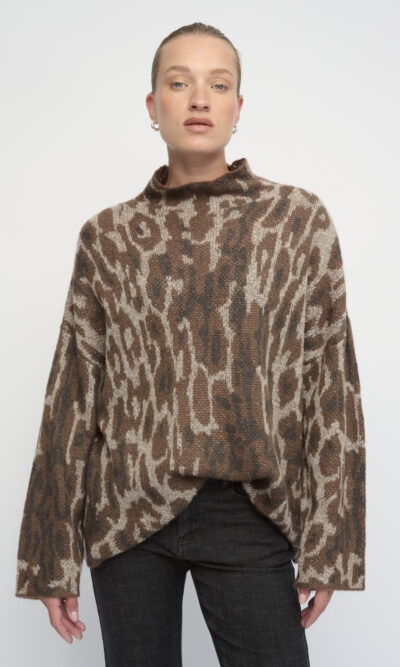 סריג בצללית אוברסייז. סרוג בדוגמת הדפס חיה. עם צוארון גבוה.