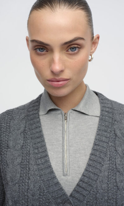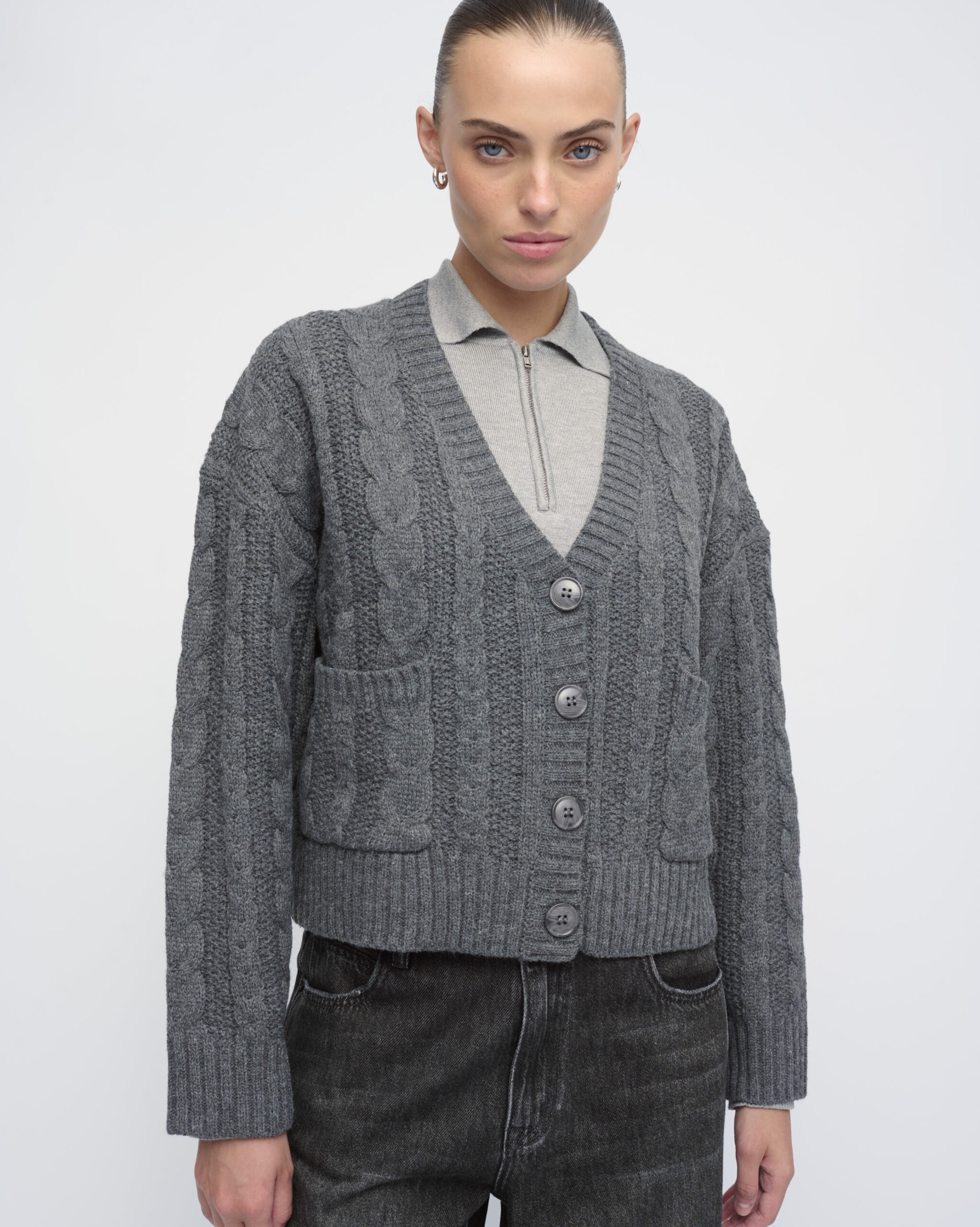 קרדיגן סרוג בדוגמת צמות. צללית נינוחה. כיסים וסגירת כפתורים בחזית.