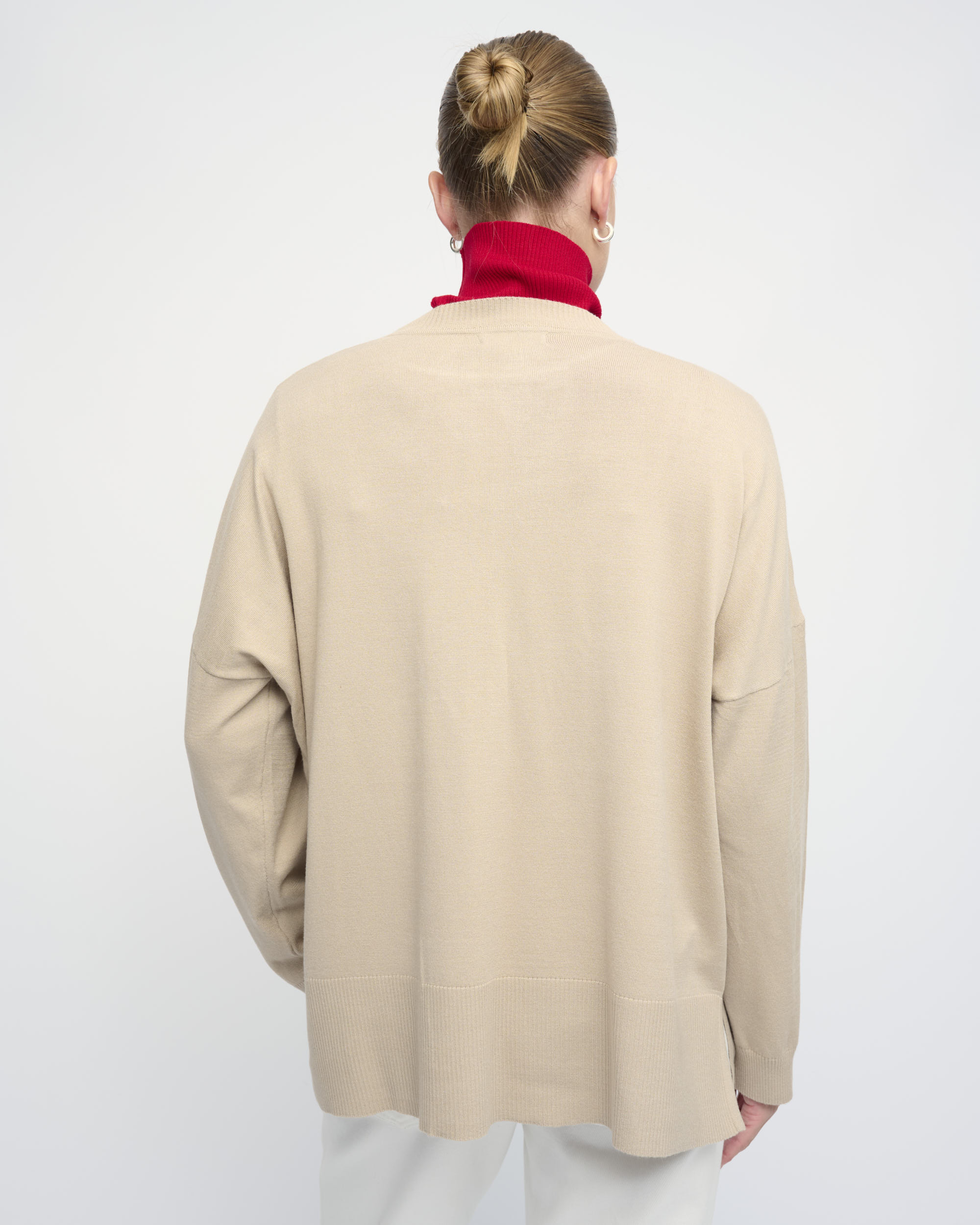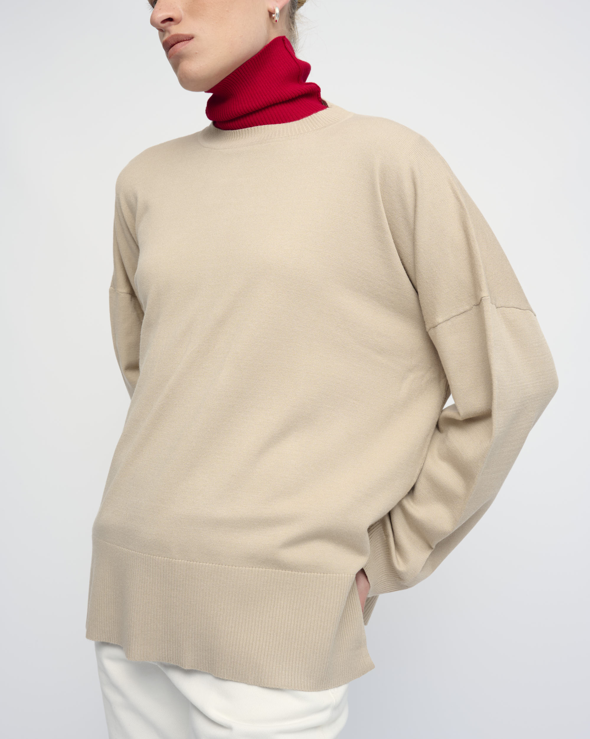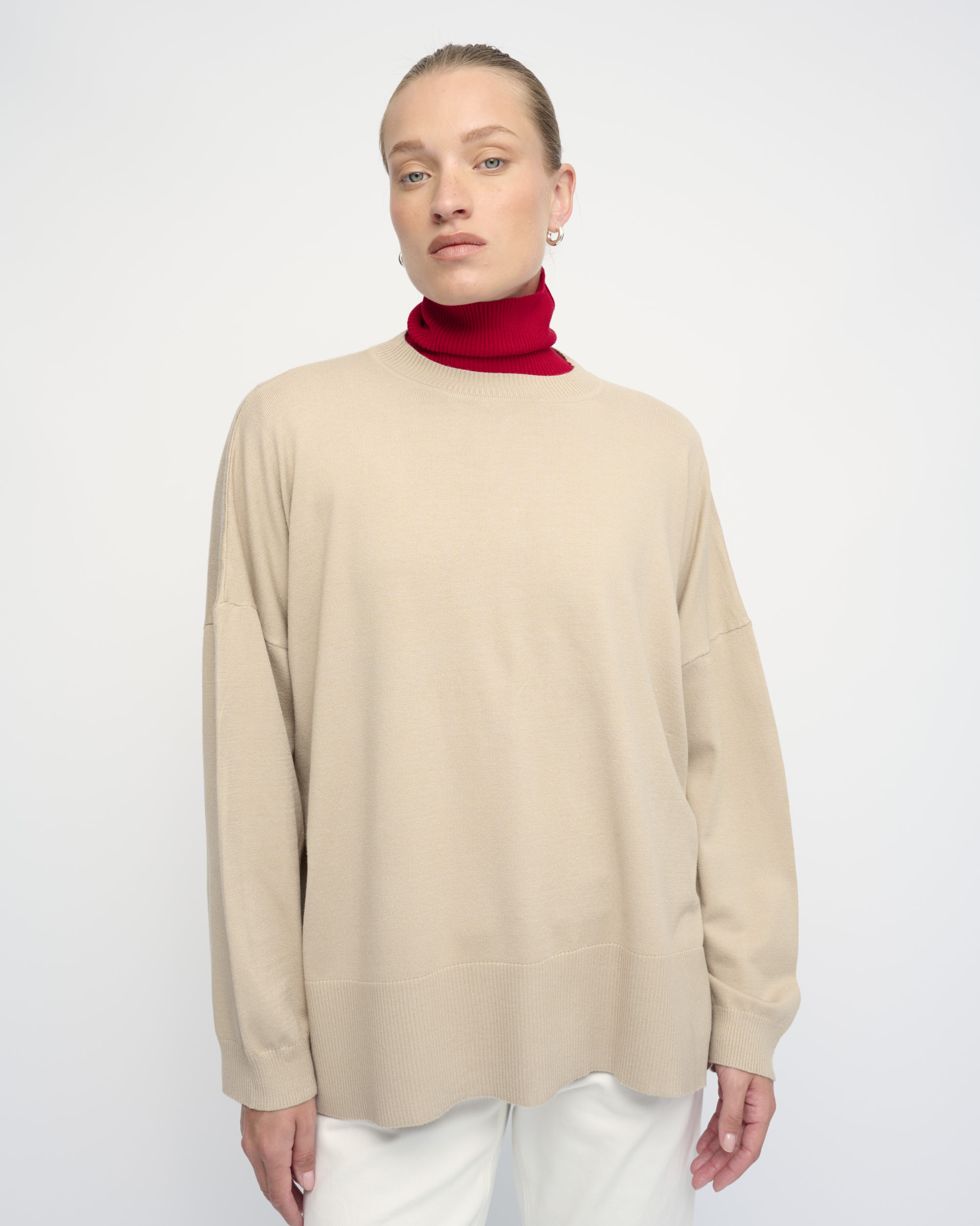 סריג ויסקוזה בצללית אוברסייז מרובעת. עם מחשוף עגול.