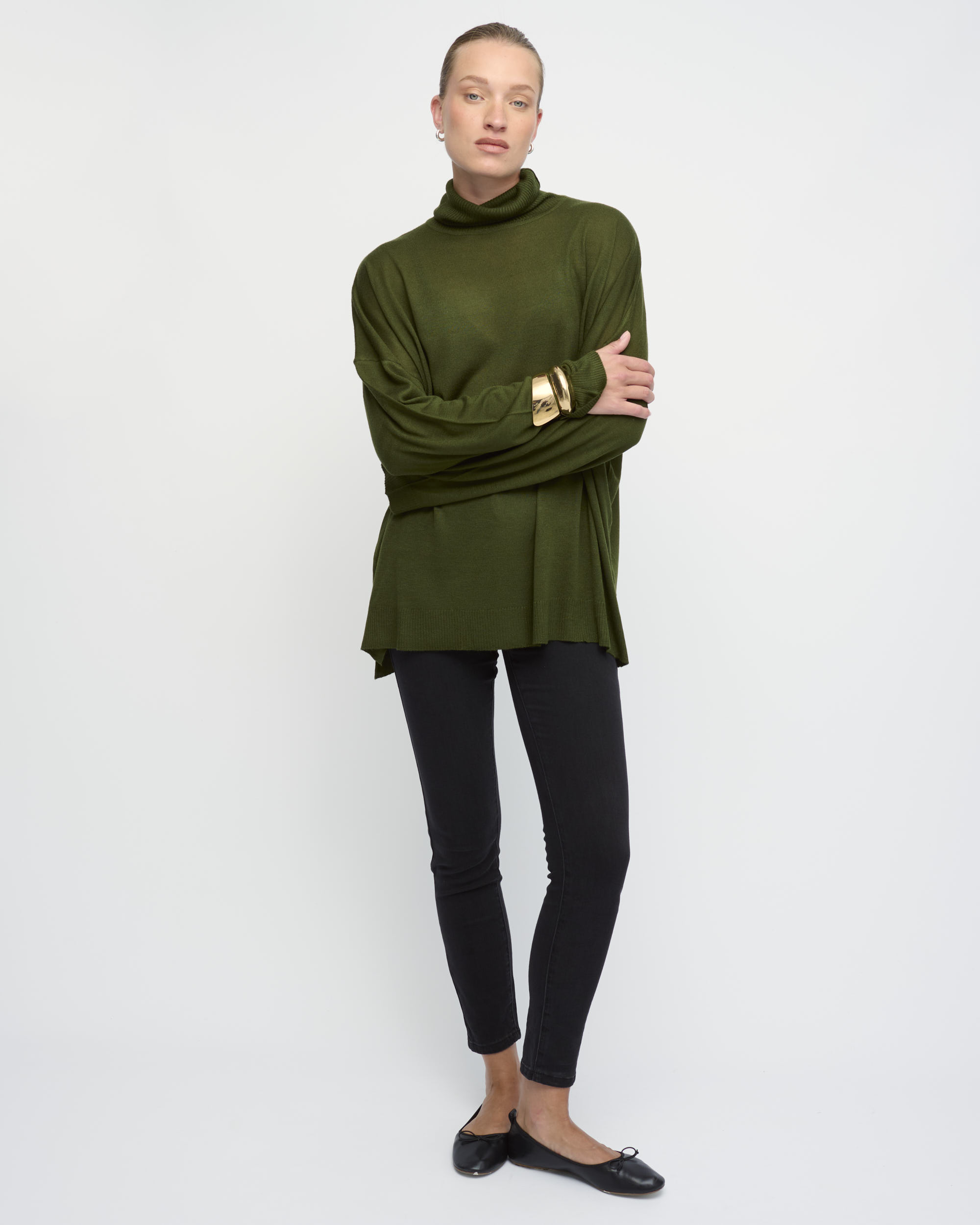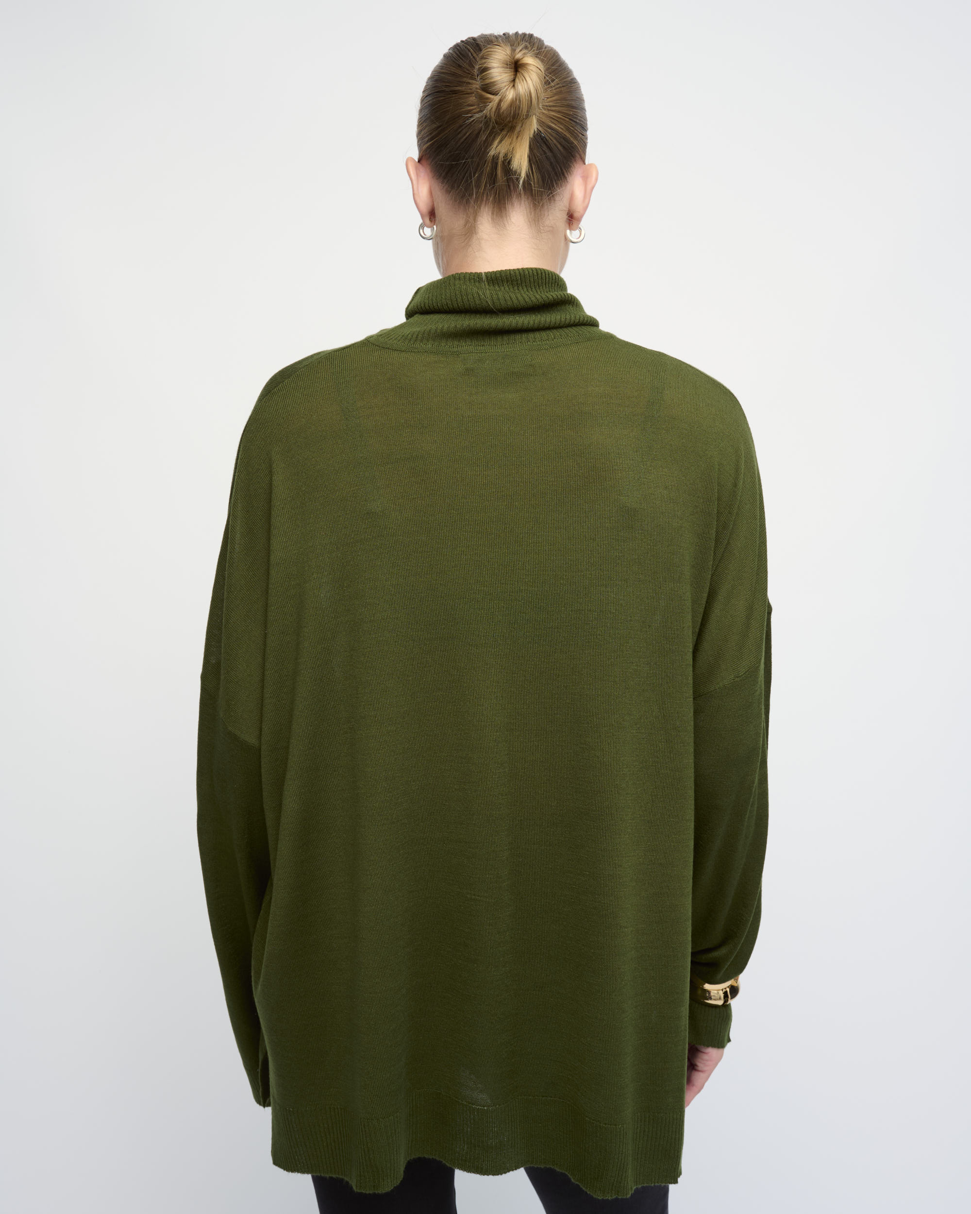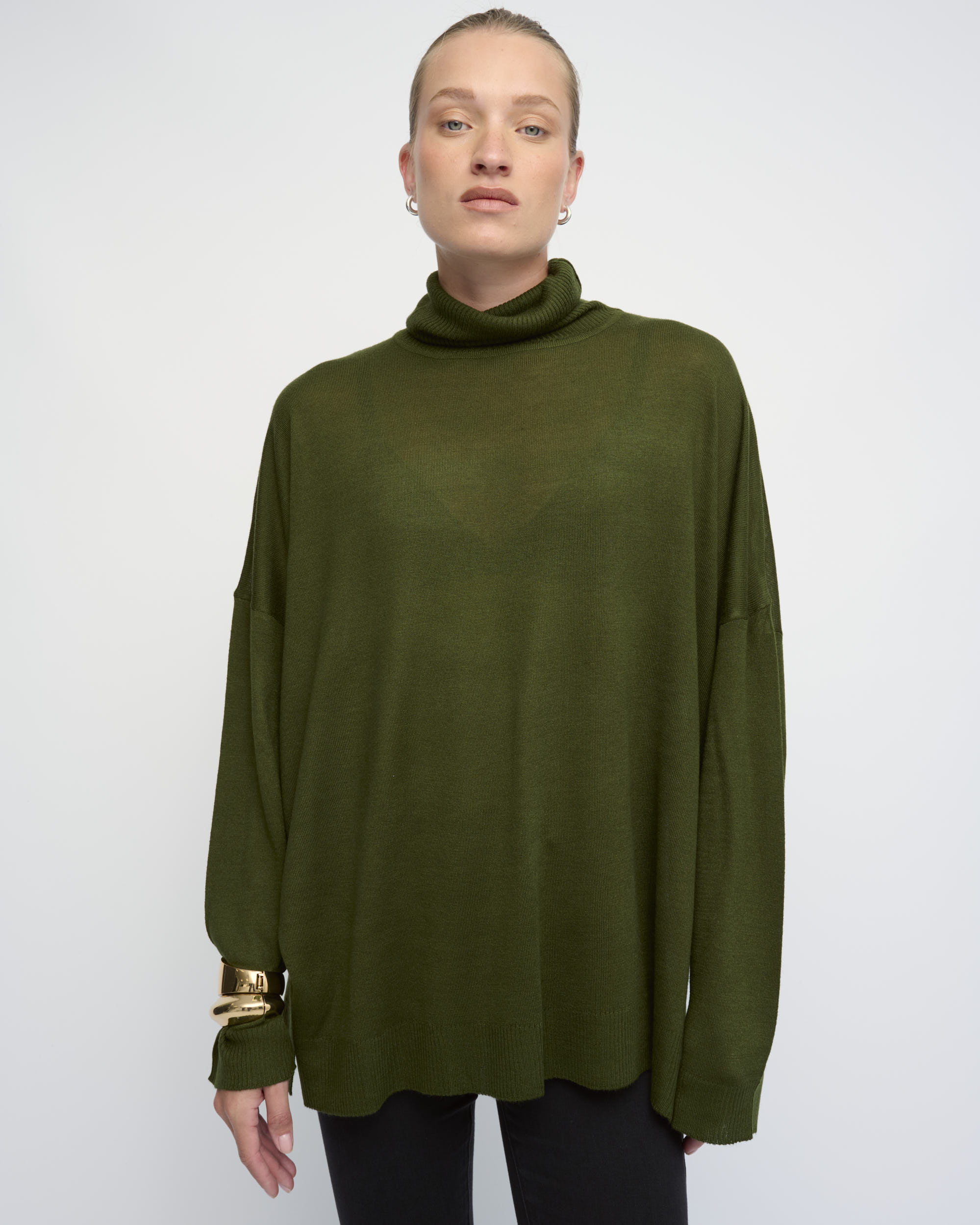 סריג ויסקוזה דק, צללית אוברסייז, עם צוארון גולף מתקפל. הסריג מגיע במידת OS ומתאים למידות S-XL.