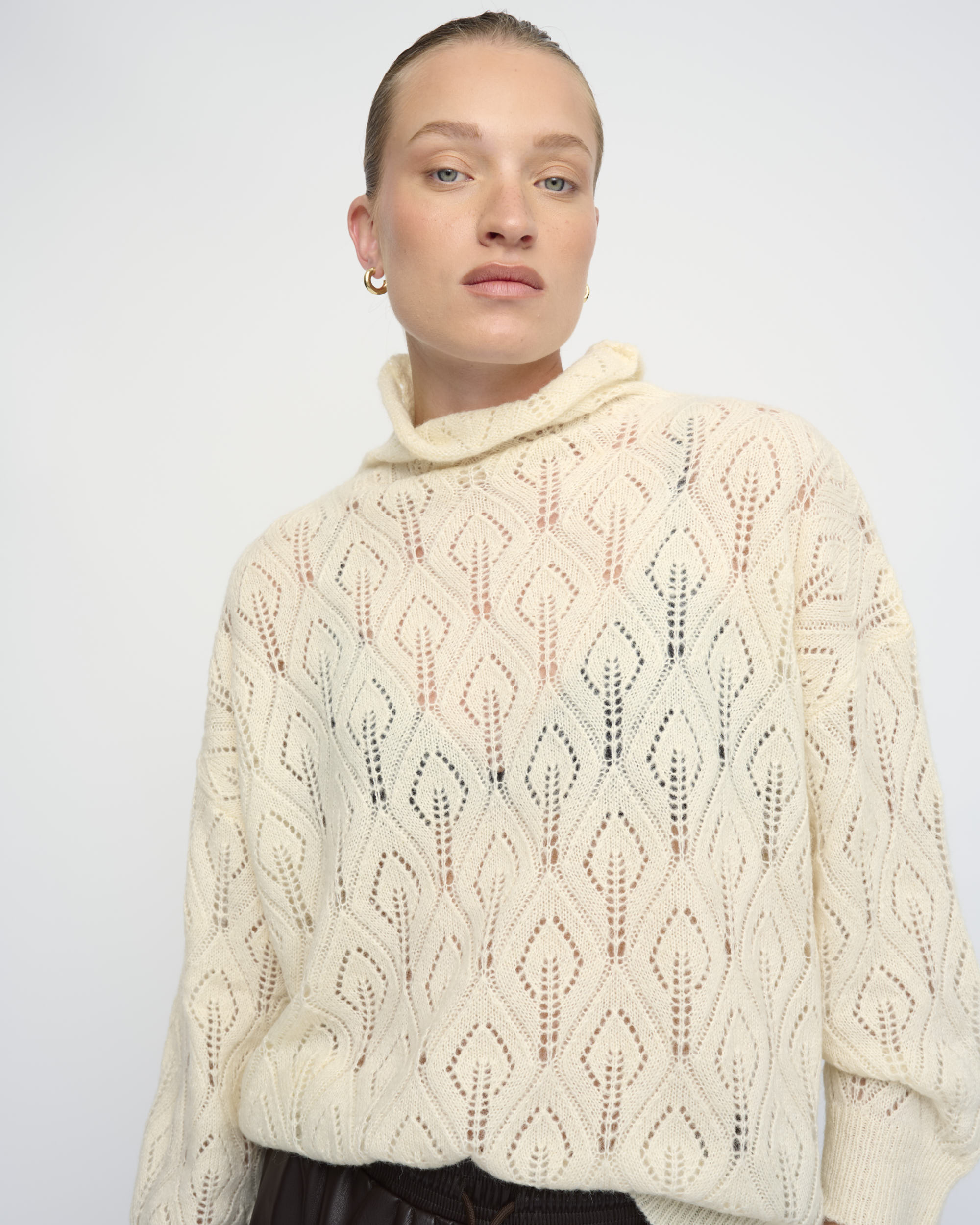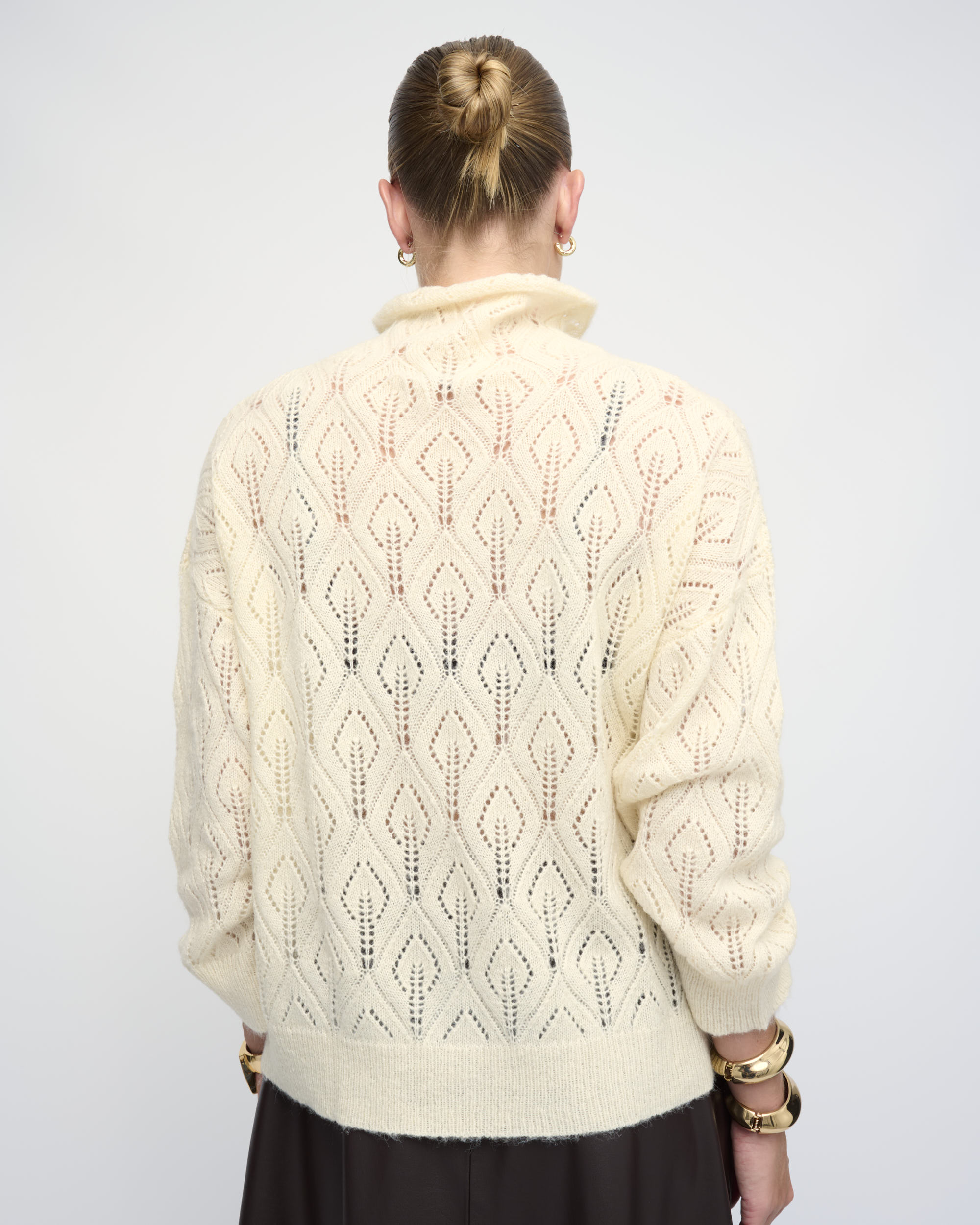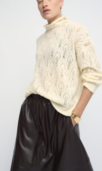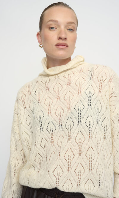 סריג סרוג בדוגמת תחרה. צללית אוברסייז. עם צוארון גבוה.