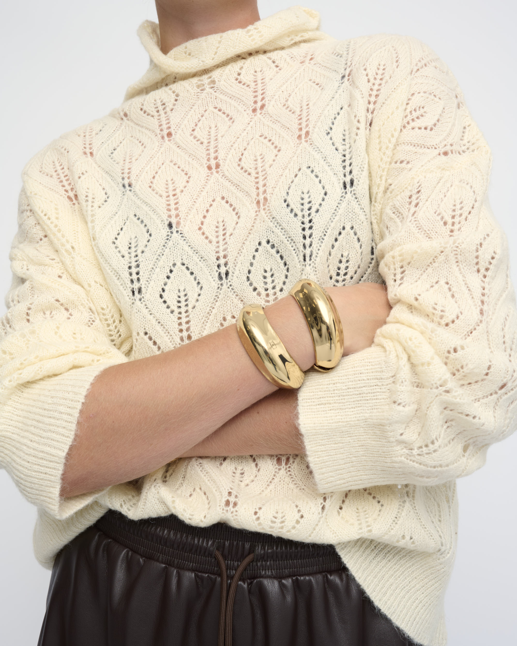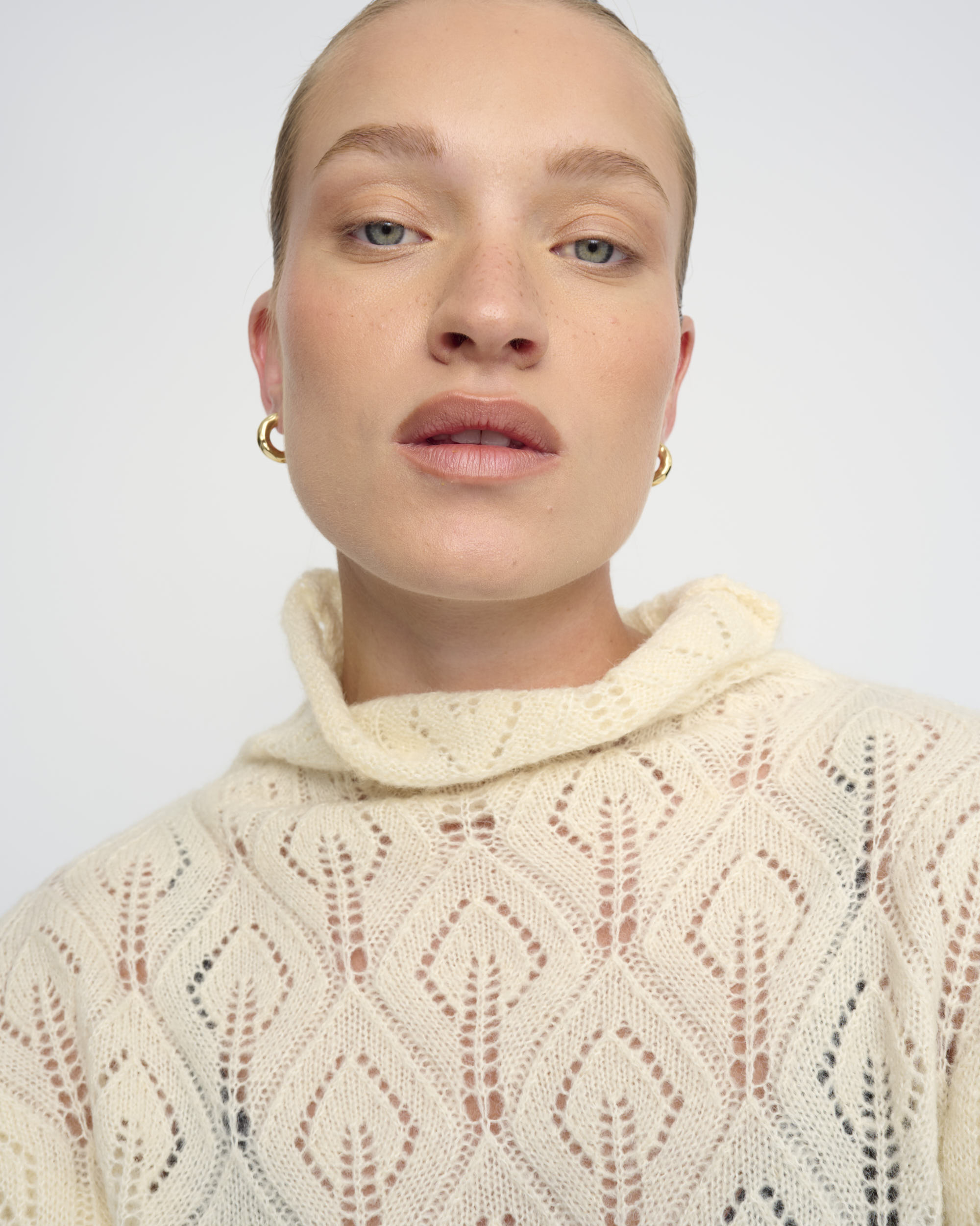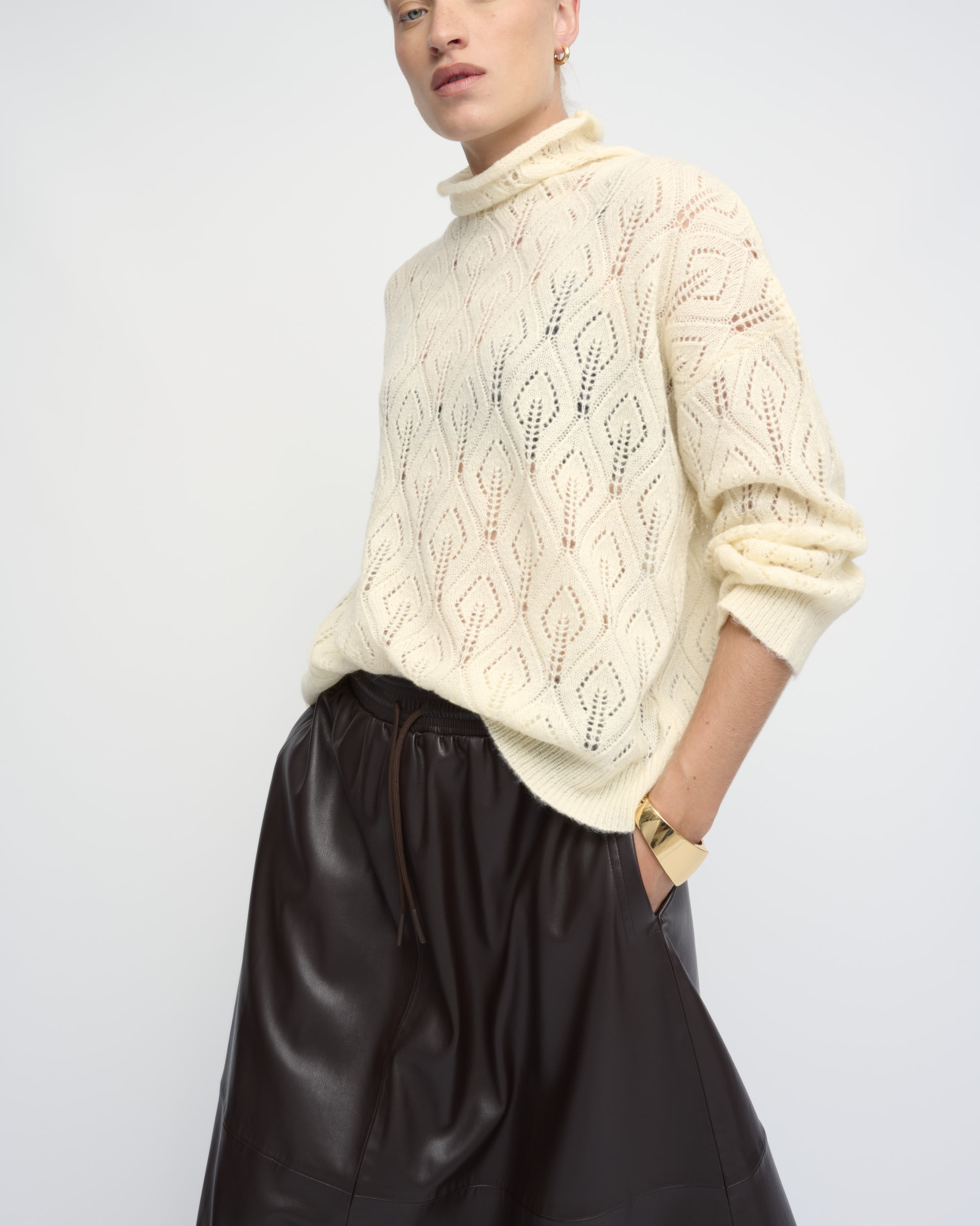 סריג סרוג בדוגמת תחרה. צללית אוברסייז. עם צוארון גבוה.