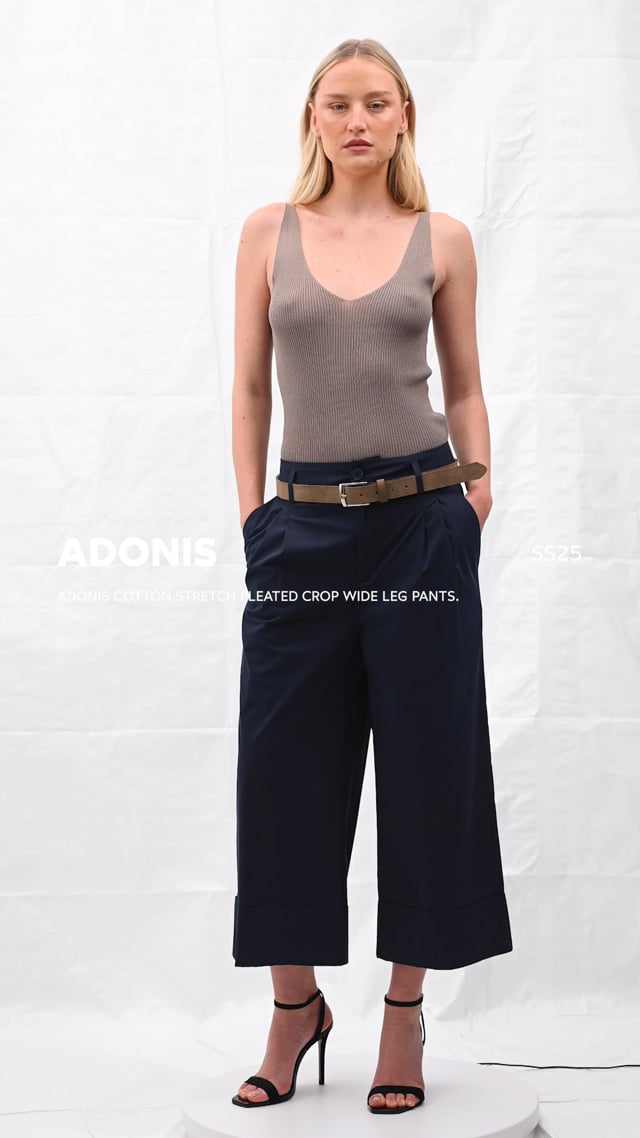 מכנסיים מכותנה ליקרה, צללית רגל רחבה, קפלים בחזית. חפת מכפלת רחב, אורך קרסול.
