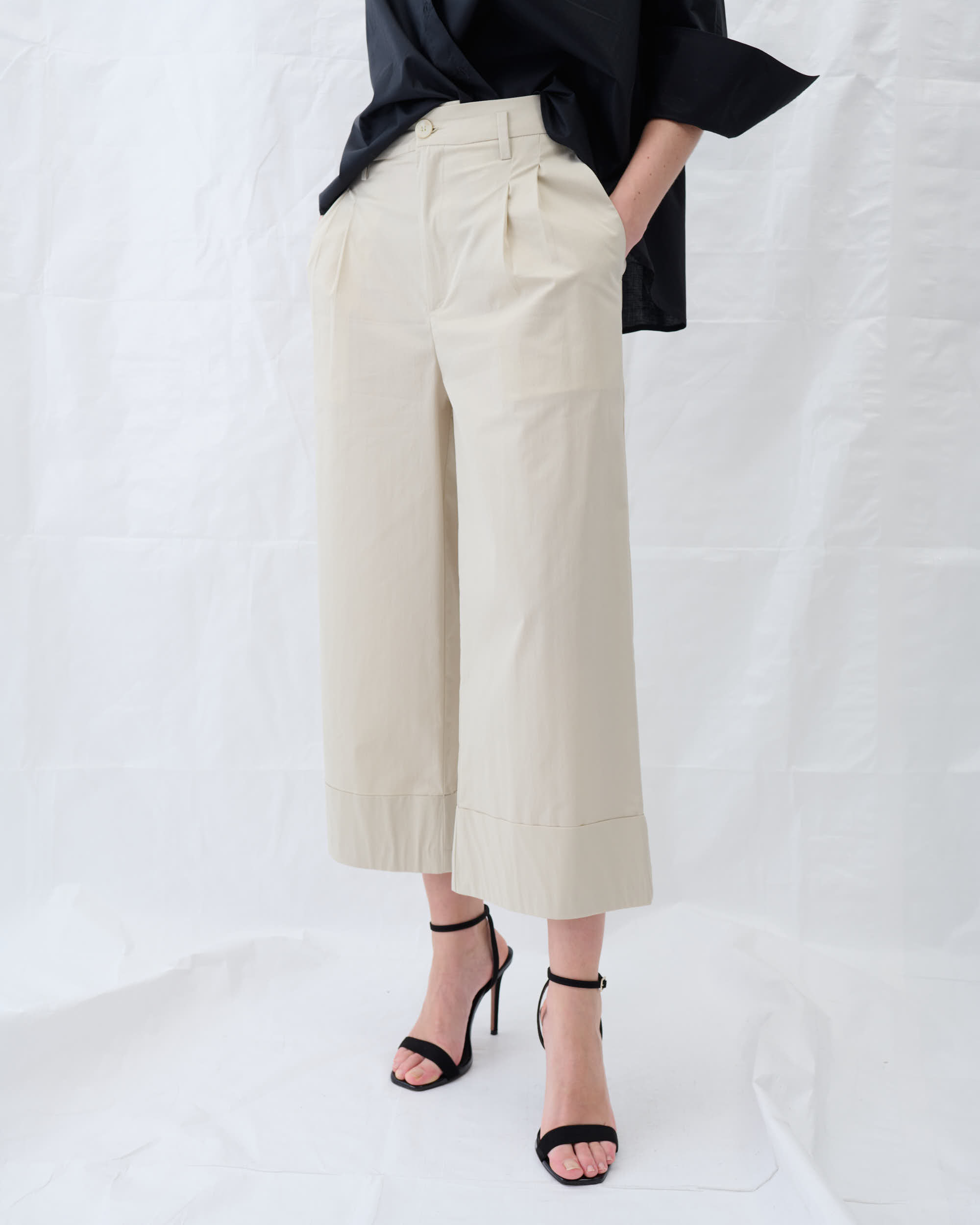 מכנסיים מכותנה ליקרה, צללית רגל רחבה, קפלים בחזית. חפת מכפלת רחב, אורך קרסול.
