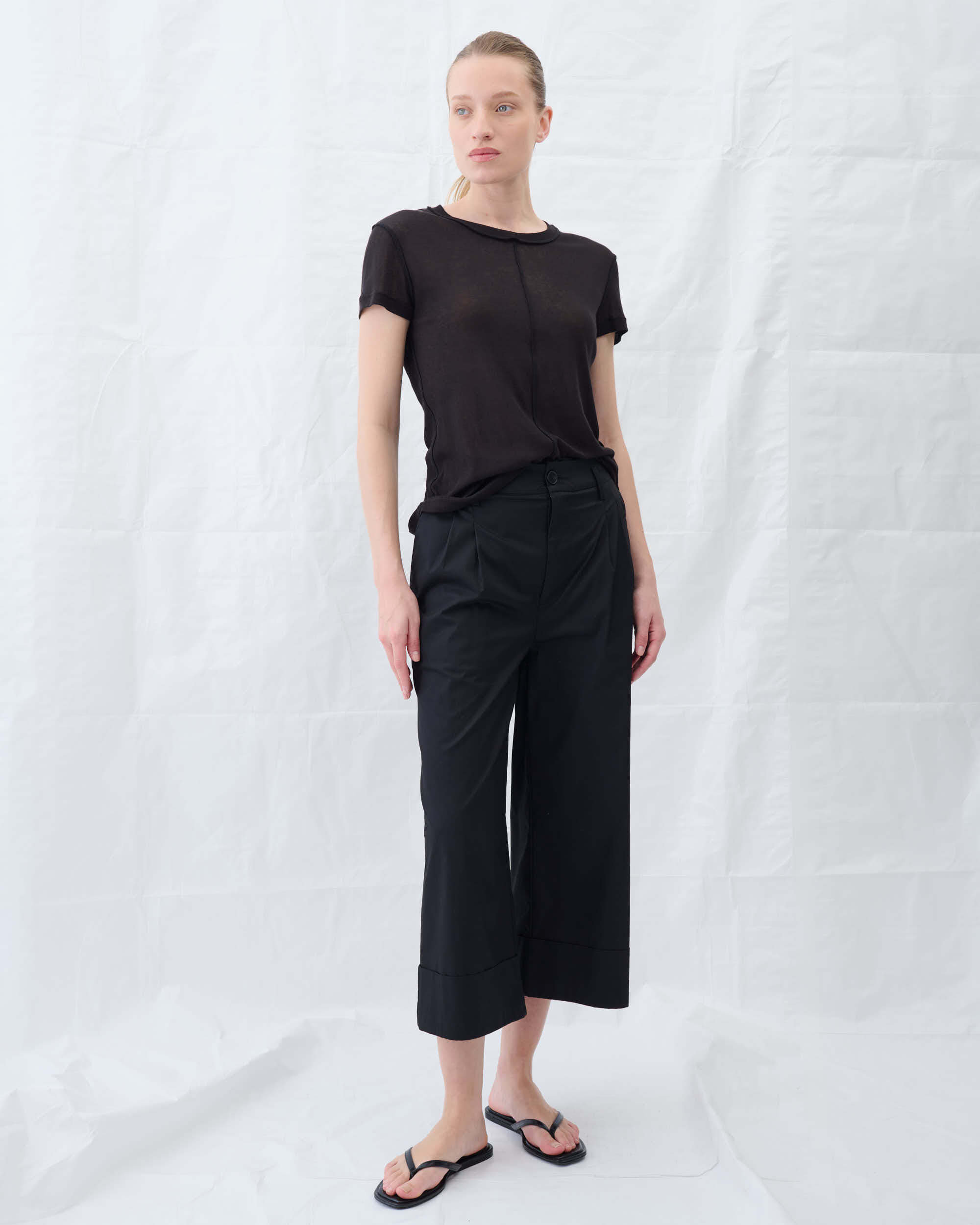מכנסיים מכותנה ליקרה, צללית רגל רחבה, קפלים בחזית. חפת מכפלת רחב, אורך קרסול.
