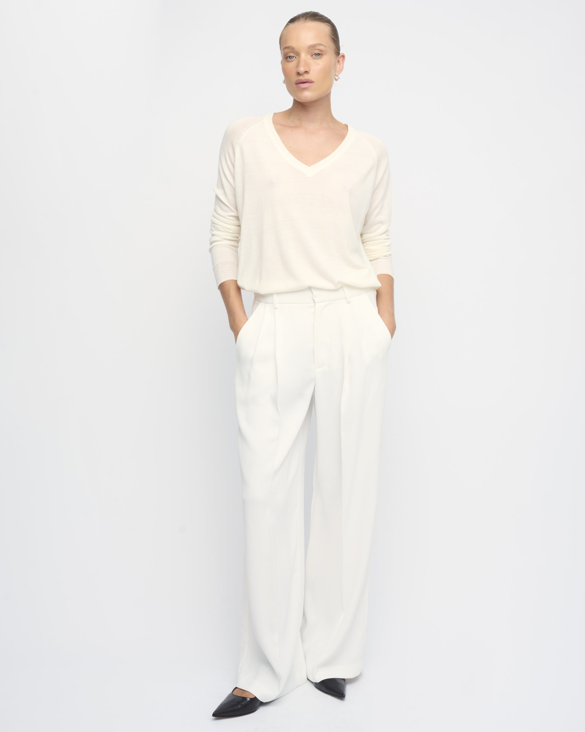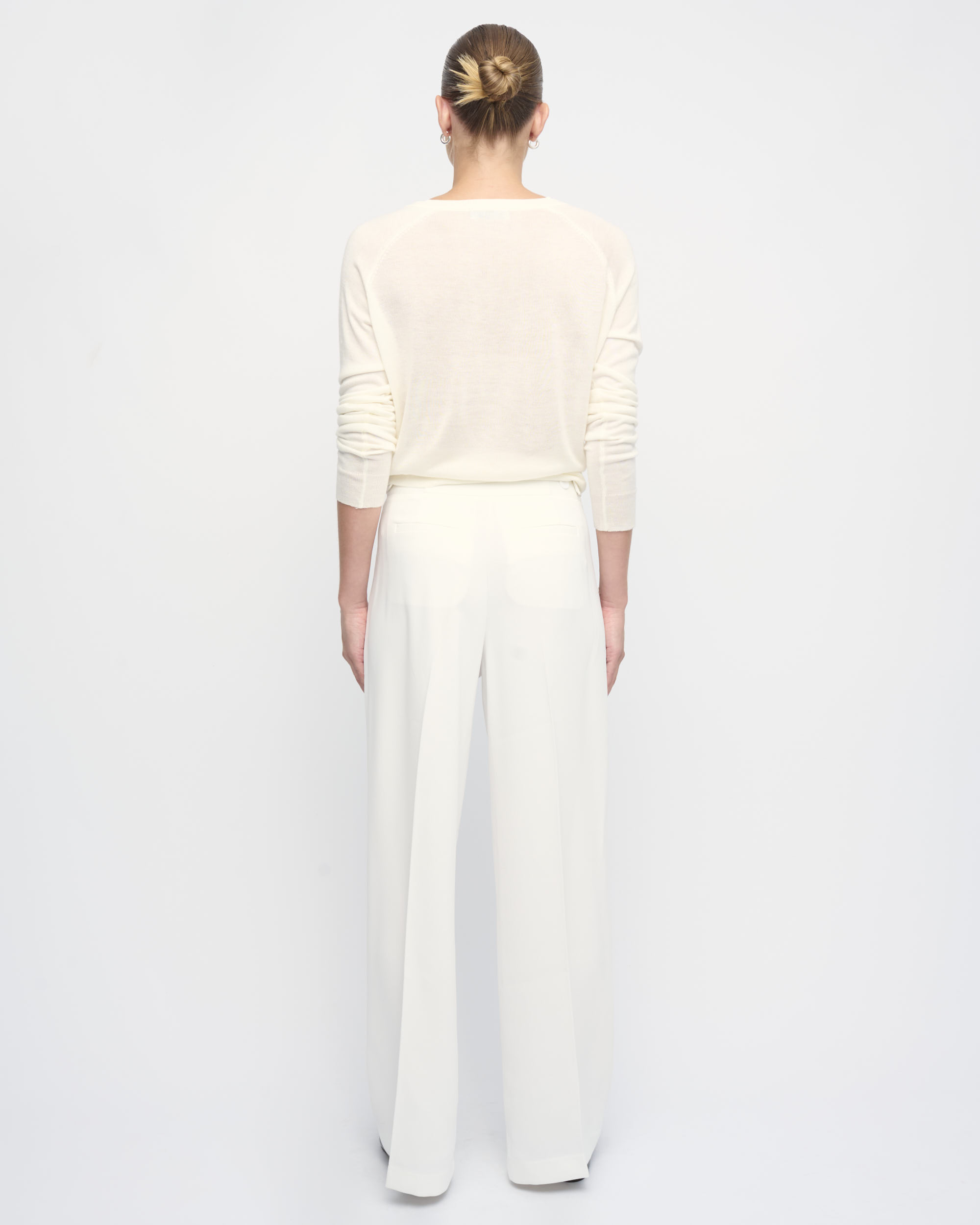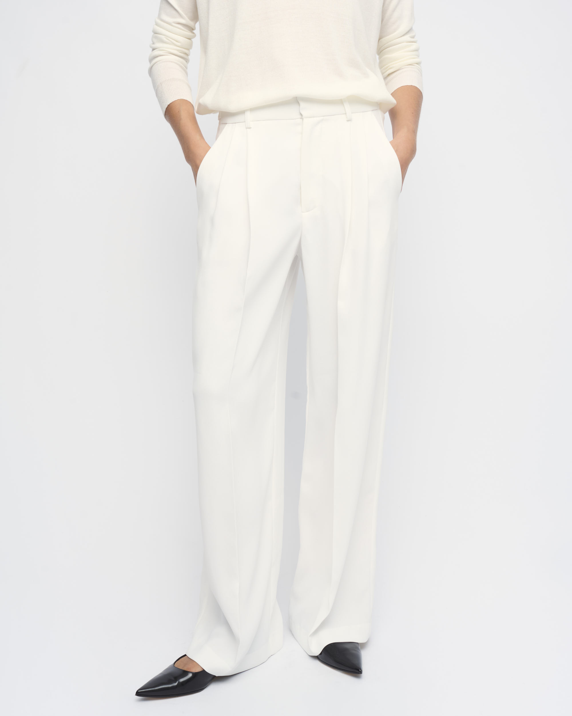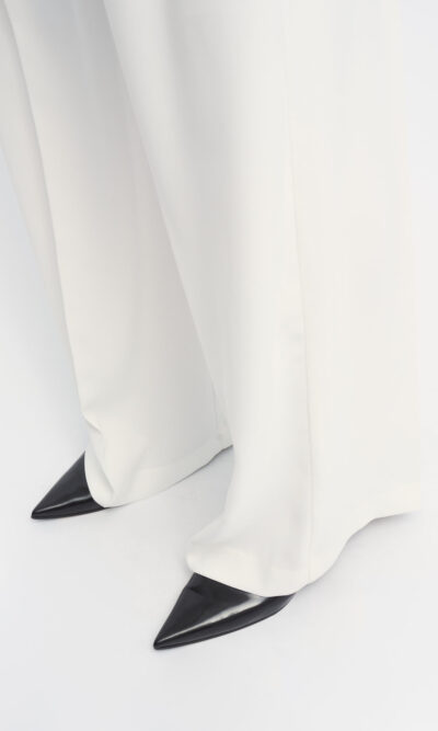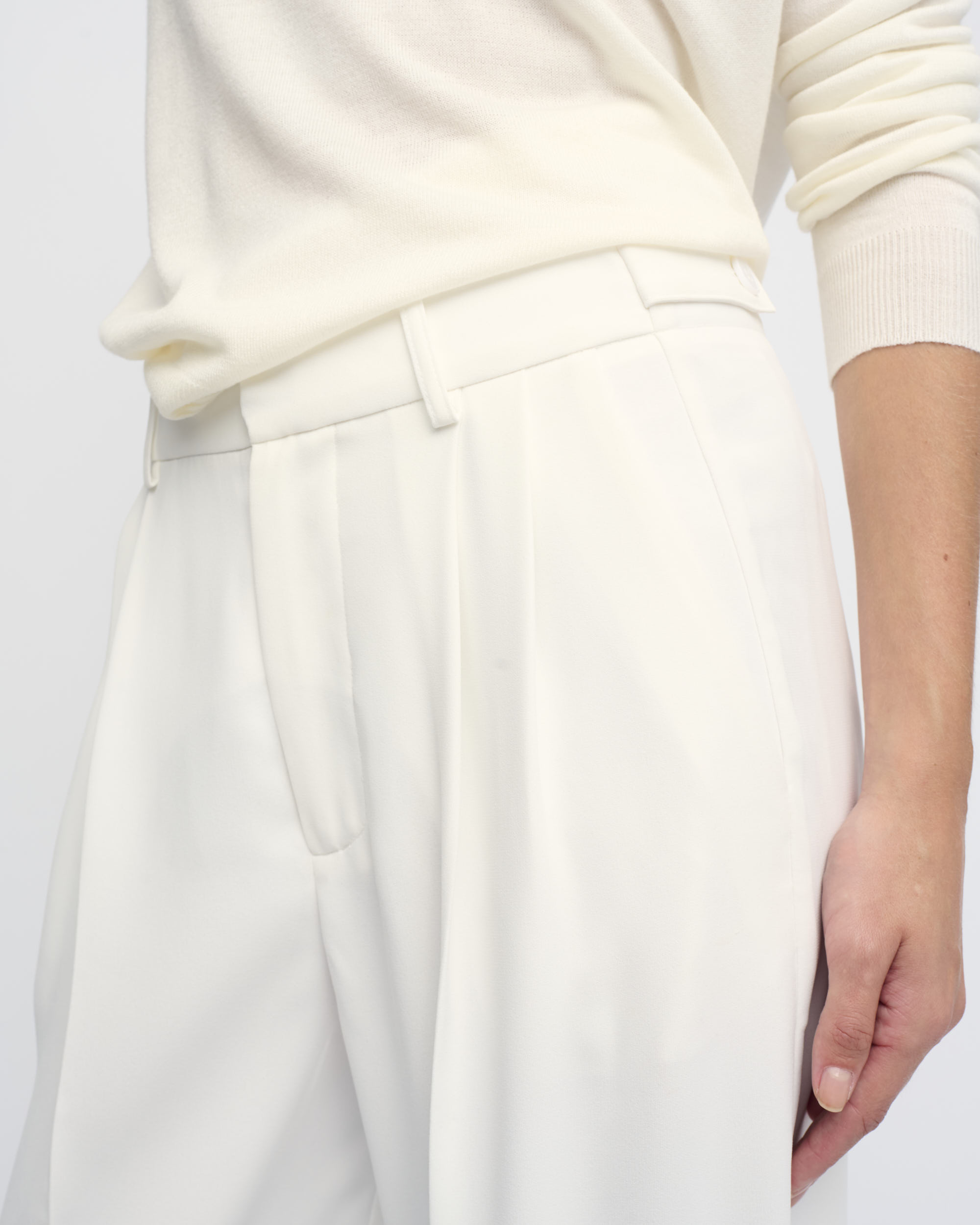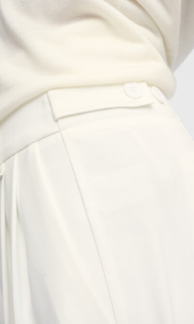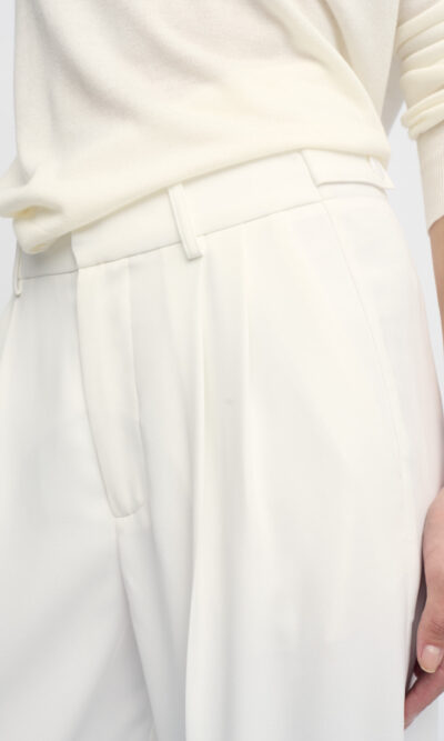 מכנסיים מחויטים בצללית רגל רחבה. קפלים בחזית. עם כיסי צד ומוטיב בחגורה להתאמת היקף המותן.