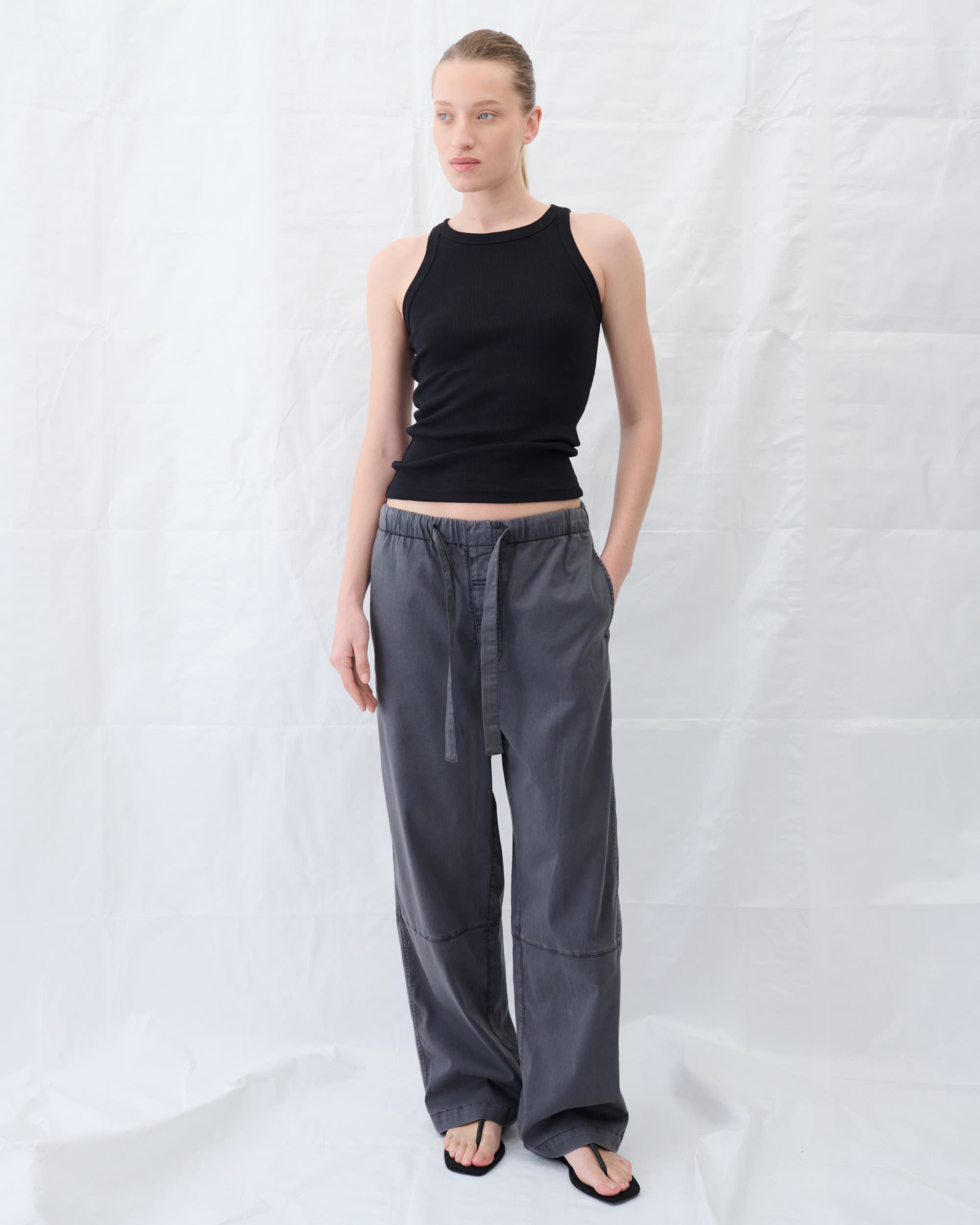 מכנסיים מטנסל, צללית נינוחה, מותן גומי עם חגורת קשירה.