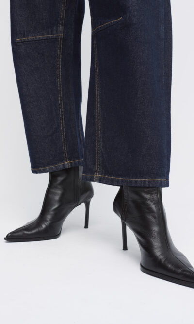 BARREL LEG, MID WAIST ג’ינס, צללית נינוחה, אורך קרסול, תפרים מודגשים, גוון כחול כהה.